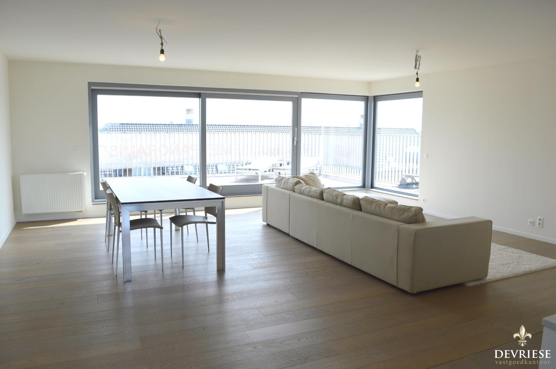 Het gebouw werd opgetrokken in een moderne stijl. Dit ruim appartement beschikt over een ruime leefruimte met open keuken, die toegang biedt tot 2 terrassen. Dit ene terras is uitzonderlijk en geniet een prachtig zicht en is 120 m² groot. Daarnaast een badkamer met douche, 2 slaapkamers en berging.