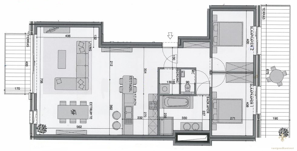 Een ruime leefruimte met dieptezicht, open keuken, 2 slaapkamers en dit alles op wandelafstand van bakker, slager en andere winkels, voorzien van 2 terrassen.