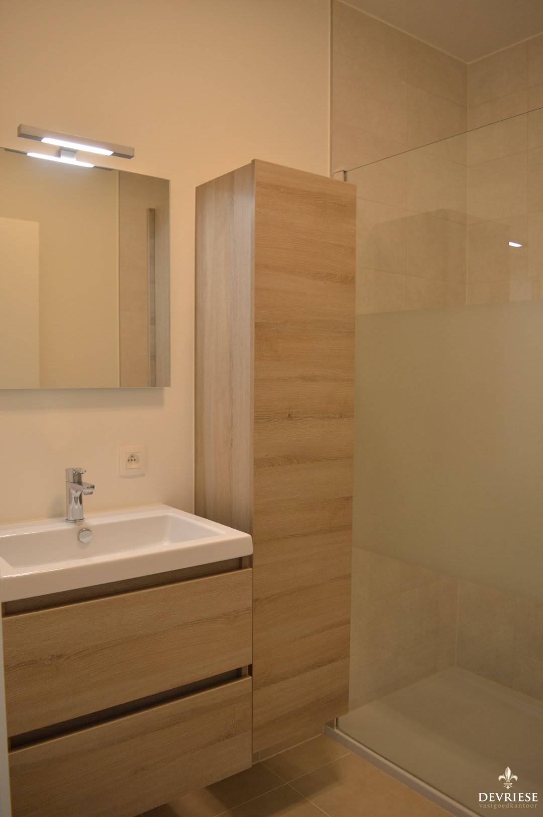 De stijlvolle badkamer is uitgerust met een lavabomeubel en inloopdouche.
