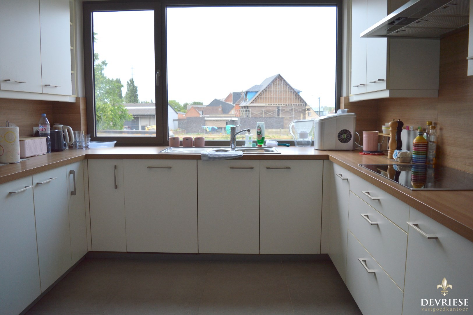 Inkomhal met vestiaire en apart toilet, ruimtelijke leefruimte met aanpalend de geïnstalleerde open keuken (volledig ingericht met keramische kookplaat, oven, microgolf, inbouwfrigo en vaatwasmachine).