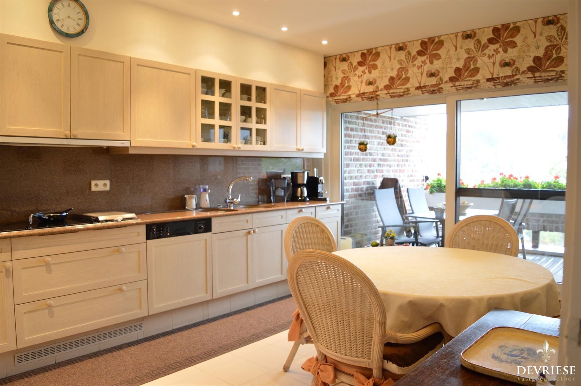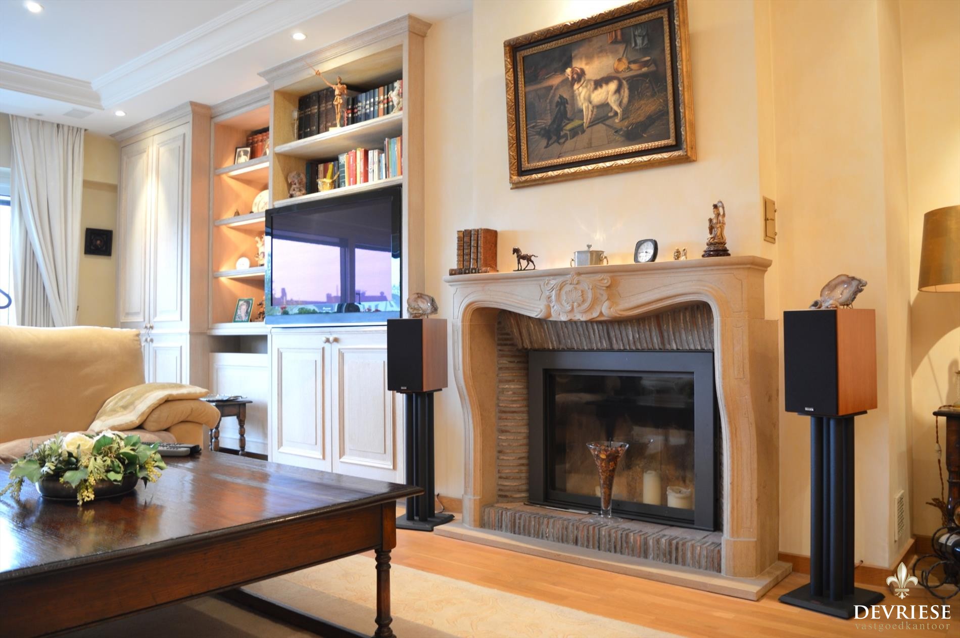De inkomhal geeft toegang tot de stijlvolle woonkamer die voorzien is van een mooie open haard met daarnaast de tijdloze ingerichte keuken. De berging naast de keuken biedt u nog een extra bergruimte.
