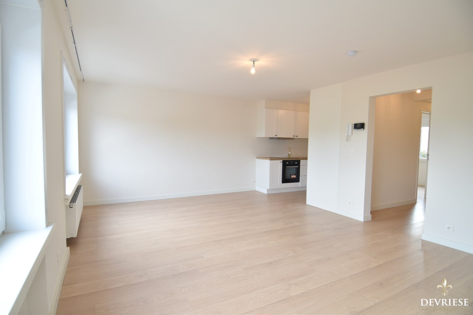 Ruime inkomhal, lichtrijke leefruimte met aansluitend de open keuken (voorzien van inbouwfrigo, diepvries, keramische kookplaat, vaatwasmachine en oven).