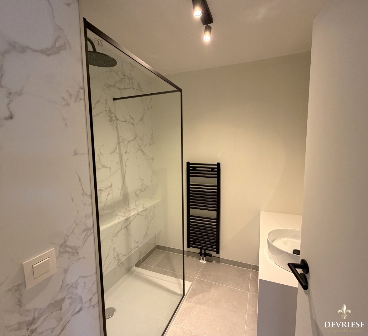Badkamer met inloopdouche en een stijlvol lavabomeubel.
