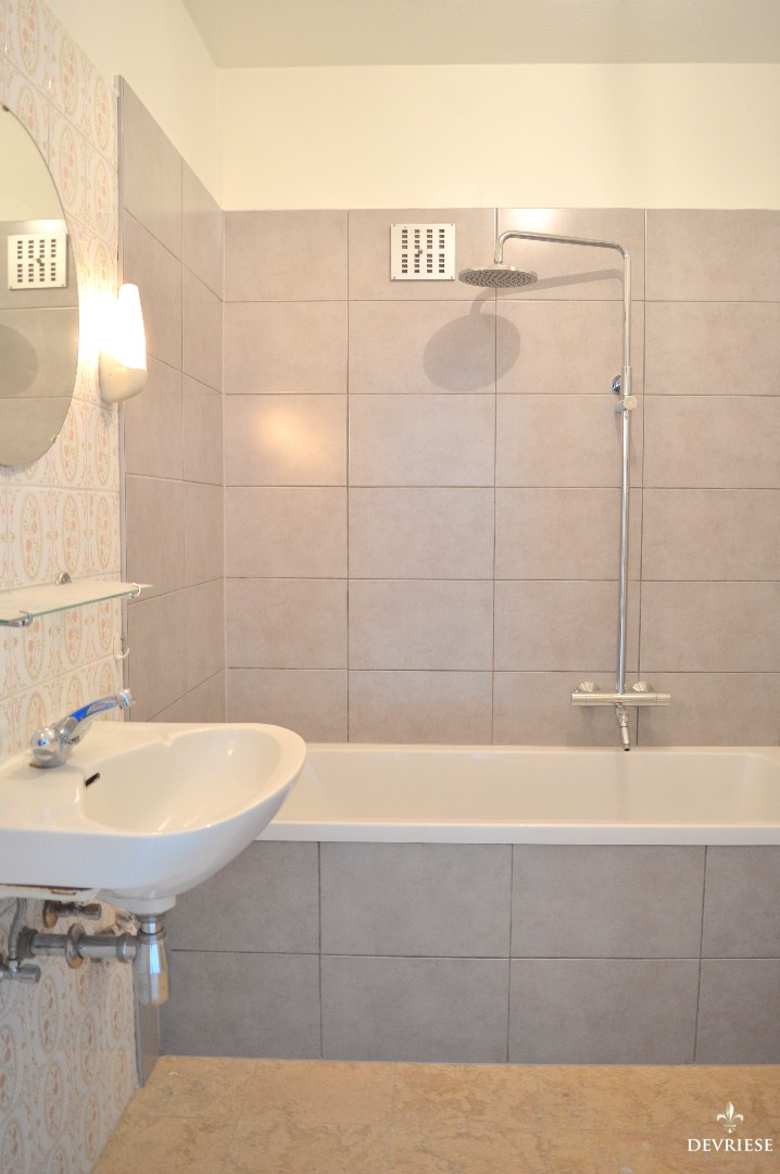 Een aparte inkomhal, gezellige en ruime leefruimte, ingerichte keuken, 2 slaapkamers en recent vernieuwde badkamer met bad, toilet en lavabo.