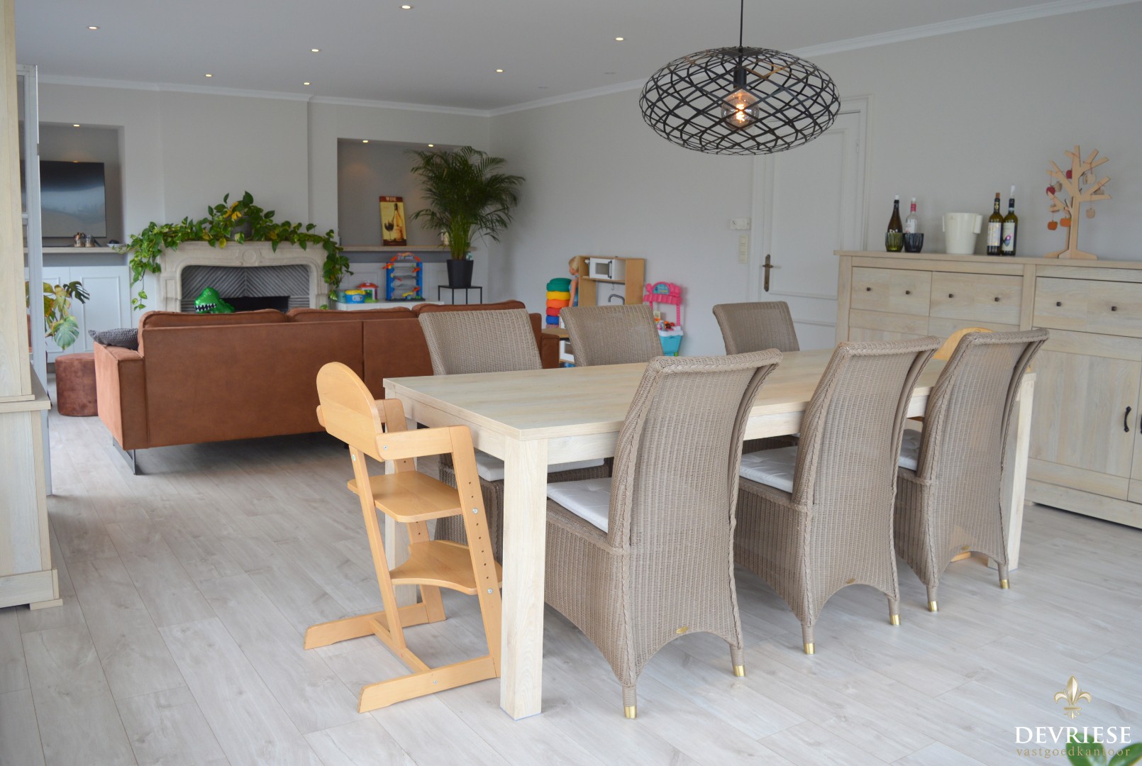 De inkomhal geeft toegang tot de stijlvolle woonkamer die voorzien is van een mooie open haard met daarnaast de tijdloze ingerichte keuken.