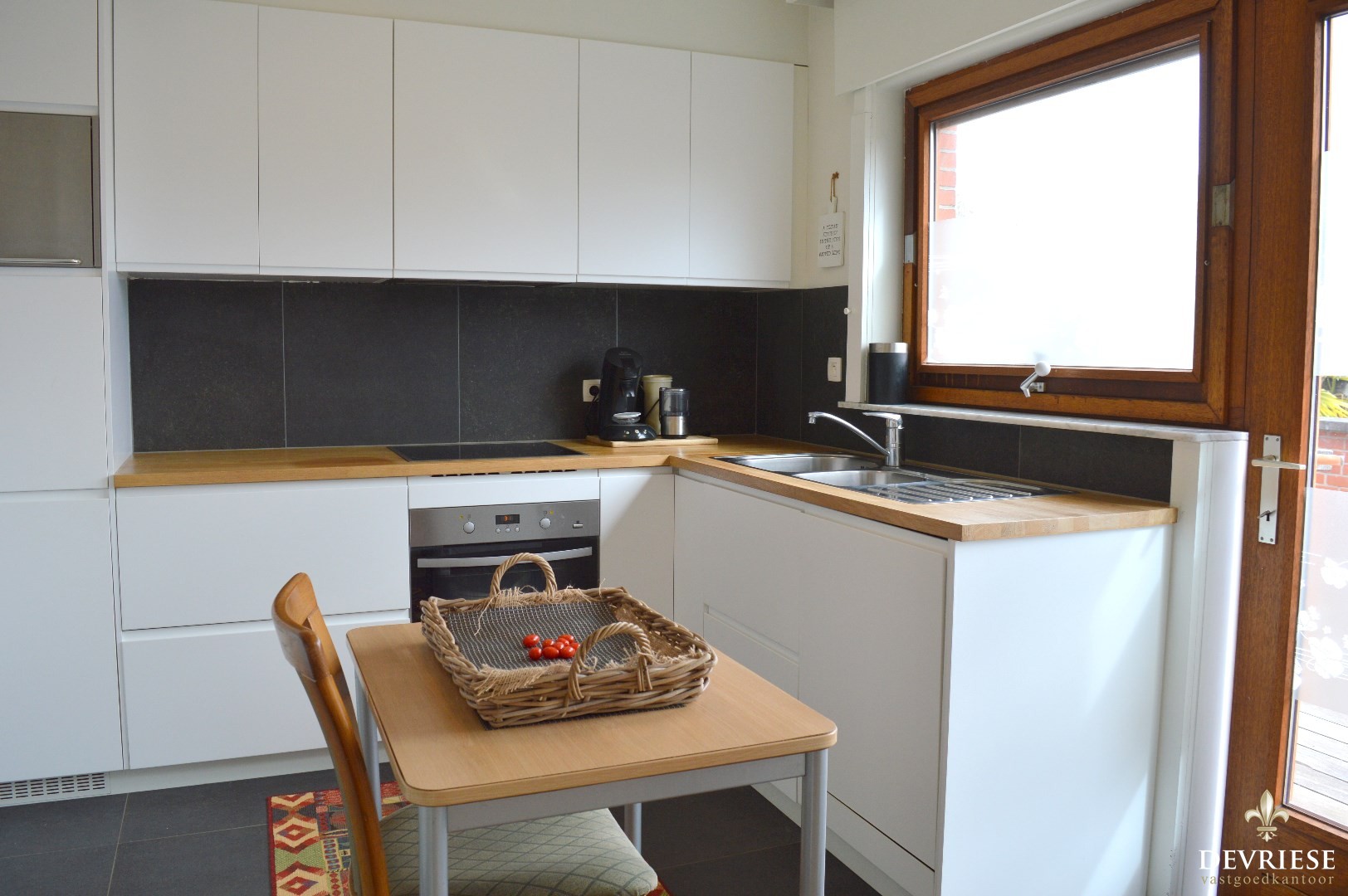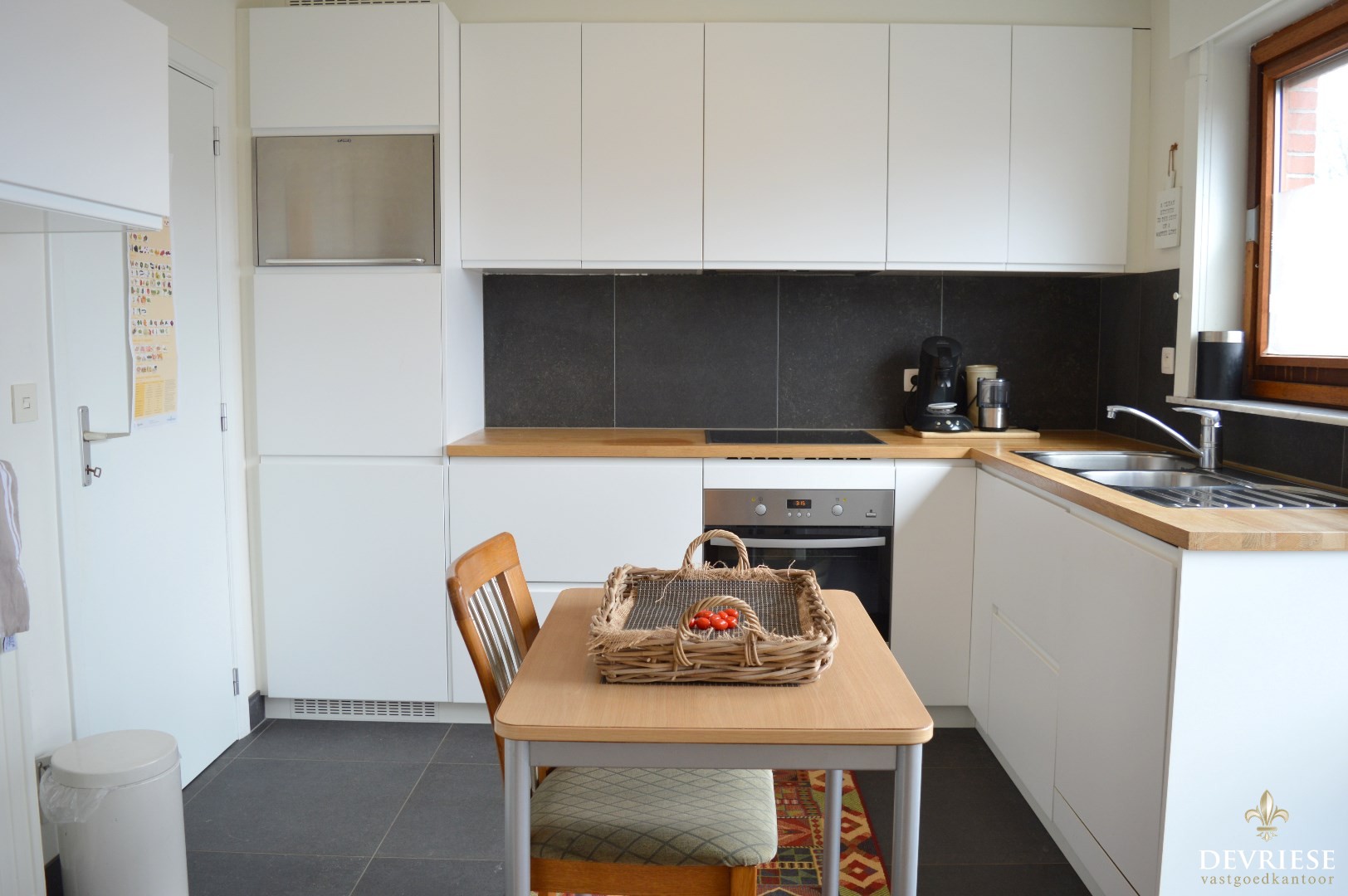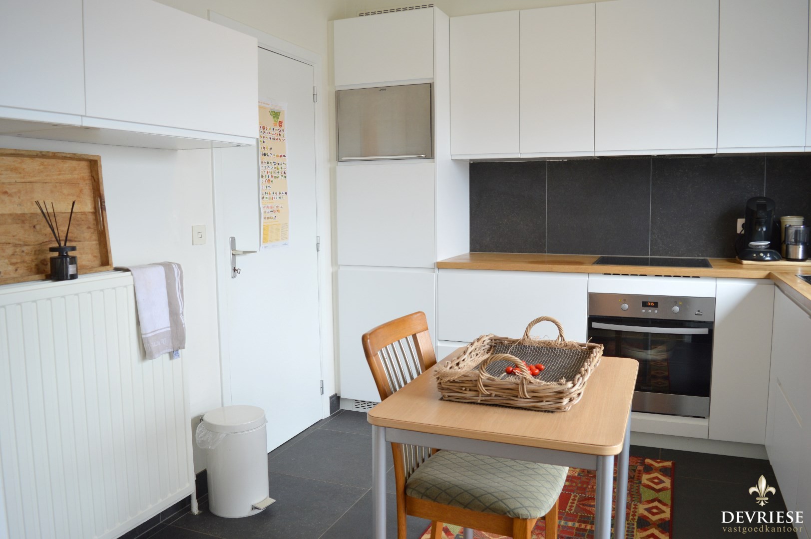 Aanpalend is de volledig nieuwe woonkeuken, ingericht me toestellen, alsook een praktische aparte bergruimte die bereikbaar is via het terras.
