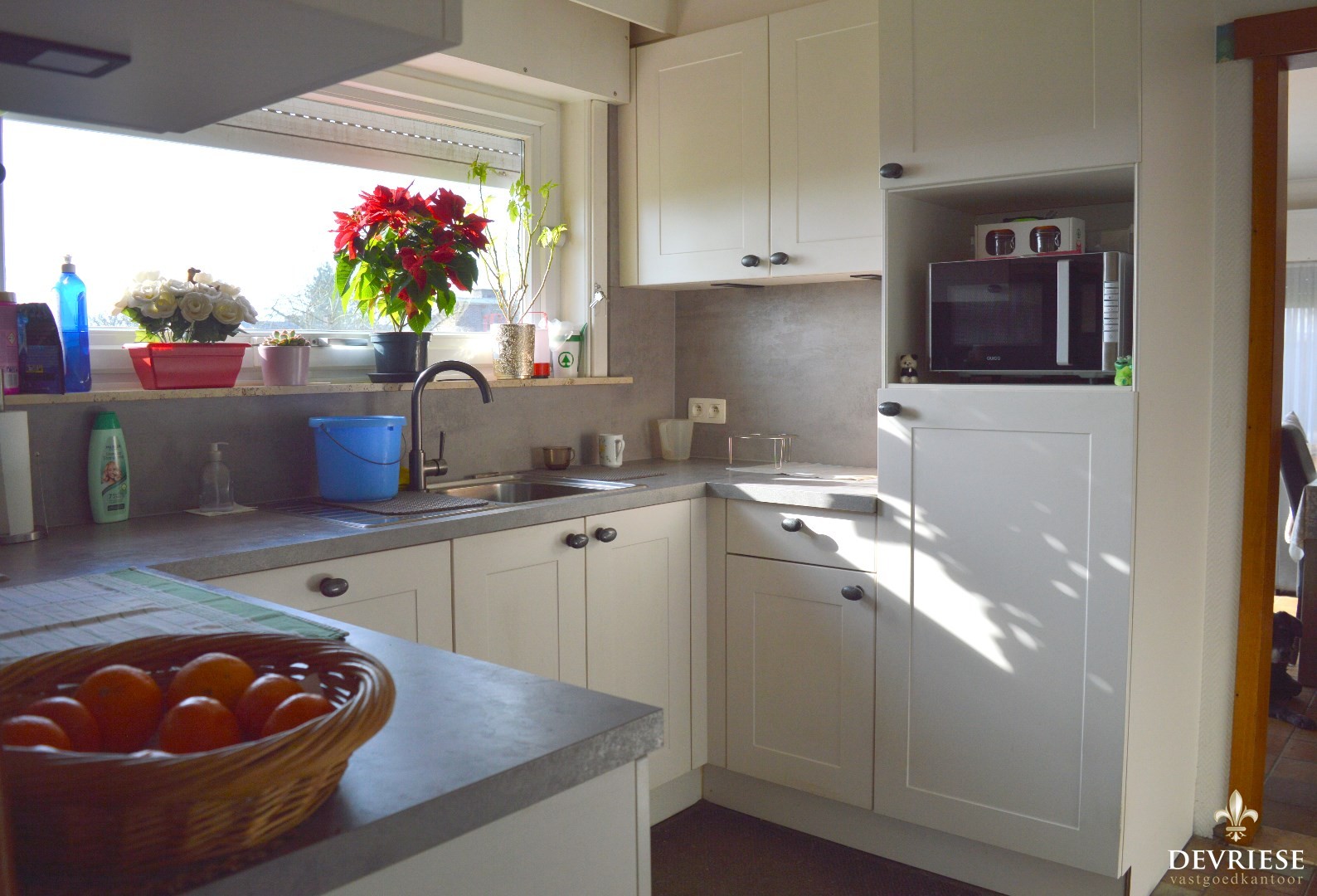 Bestaande uit inkom, centrale leefruimte met veel lichtinval en zicht op de tuin, aansluitend de uitgeruste keuken en toegang tot de garage (elektrische poort) en de kelder.