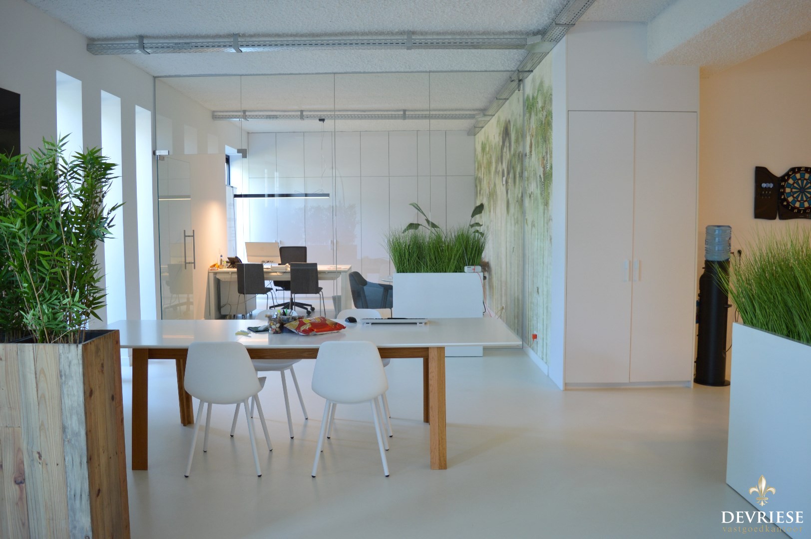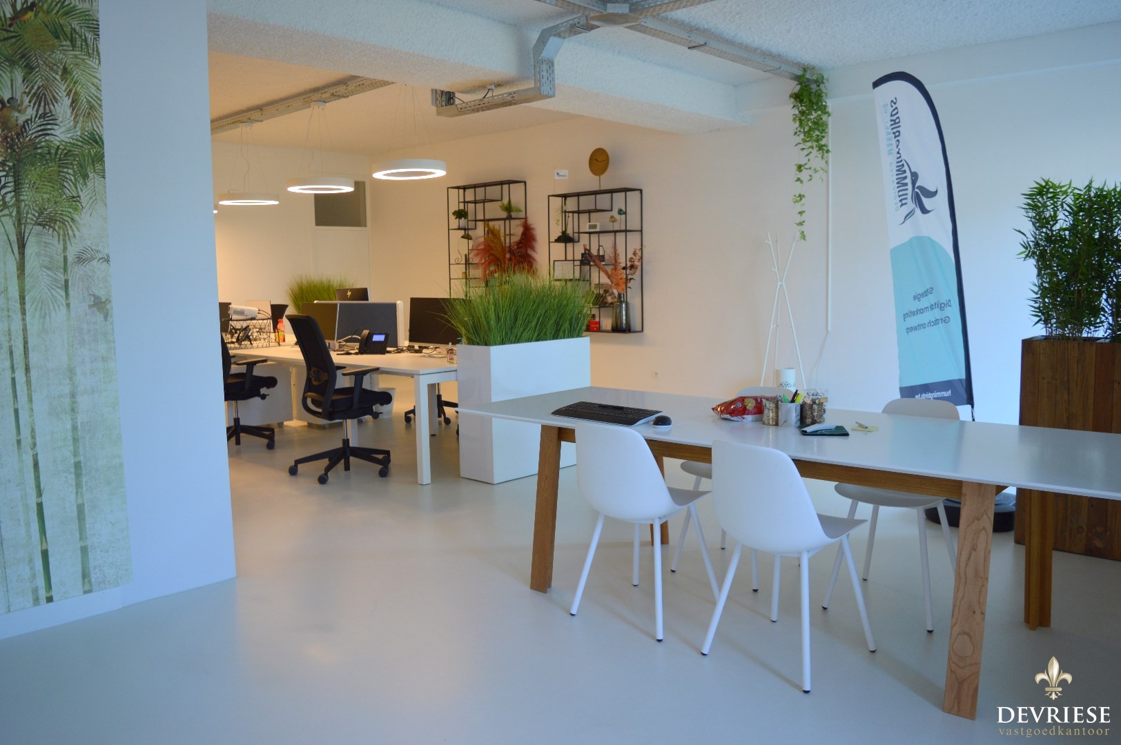 U komt binnen in de ruime open bureelruimte. Verder beschikt dit pand over een aparte vergaderzaal, keuken (met microgolf en frigo), berging en apart toilet.
