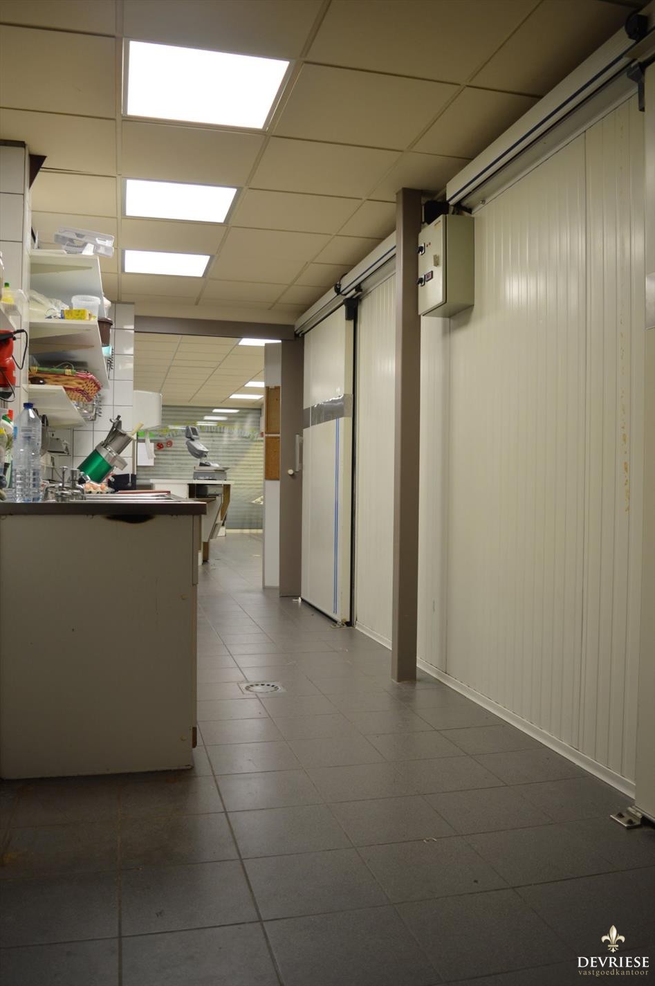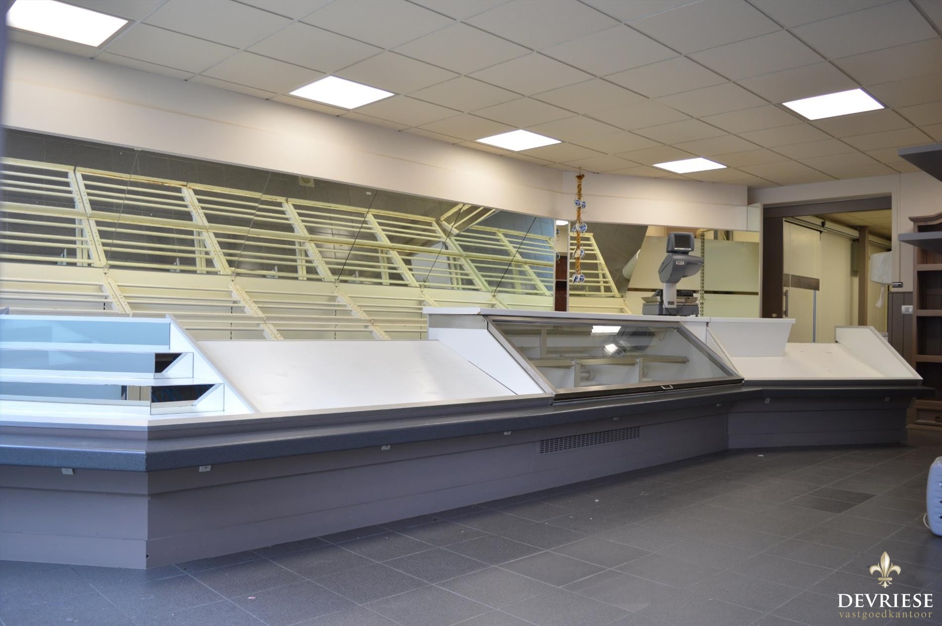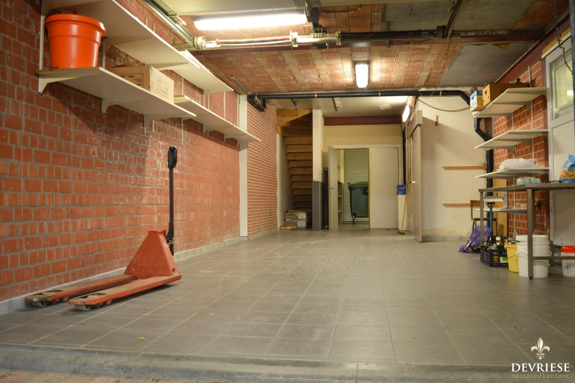Het verhuurde gelijkvloers bestaat uit de commerciële winkelruimte van 50 m². Daarachter een ingerichte keuken met bijhorende praktische koelcel, een bureauruimte met apart toilet. Daarnaast een grote stapelruimte van 46m² die doorgeeft naar de garage/carport met afgelosten met elektrische poort en bereikbaar via de zeer handige uitweg achteraan. Centrale verwarming op aardgas, alu ramen met dubbel glas.