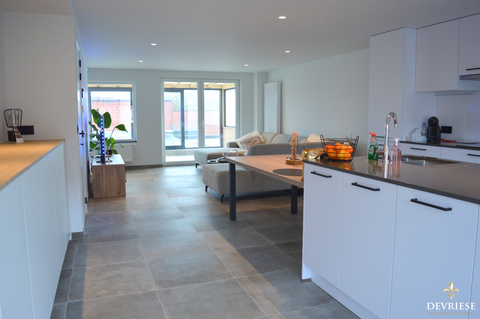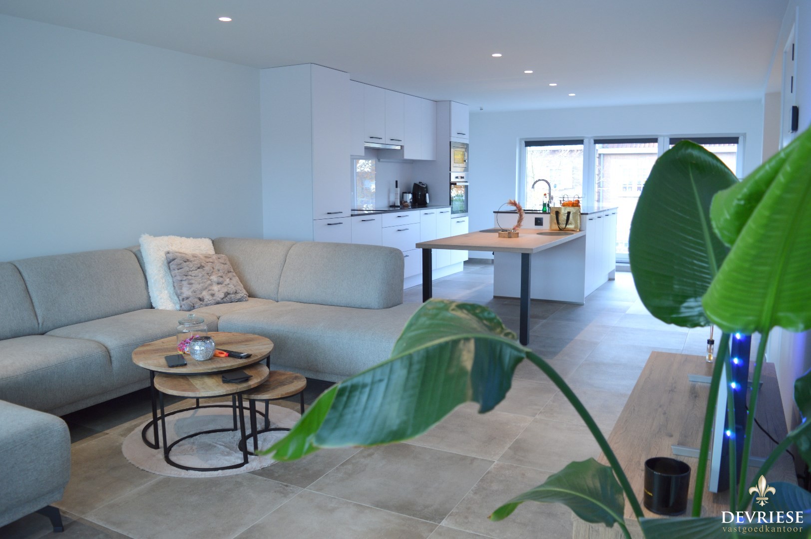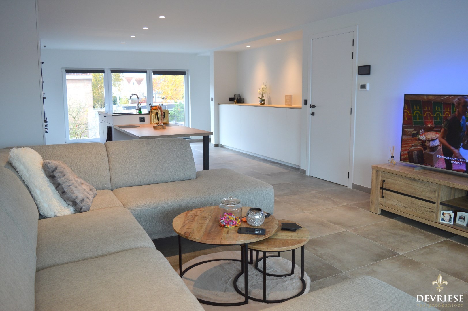 Inkomhal, apart toilet, ruime leefruimte met aansluitend de open keuken die volledig is ingericht (oven, microgolf, inbouwfrigo en inbouwdiepvries, vaatwasmachine). Vanuit de living is er toegang tot de gezellige veranda.