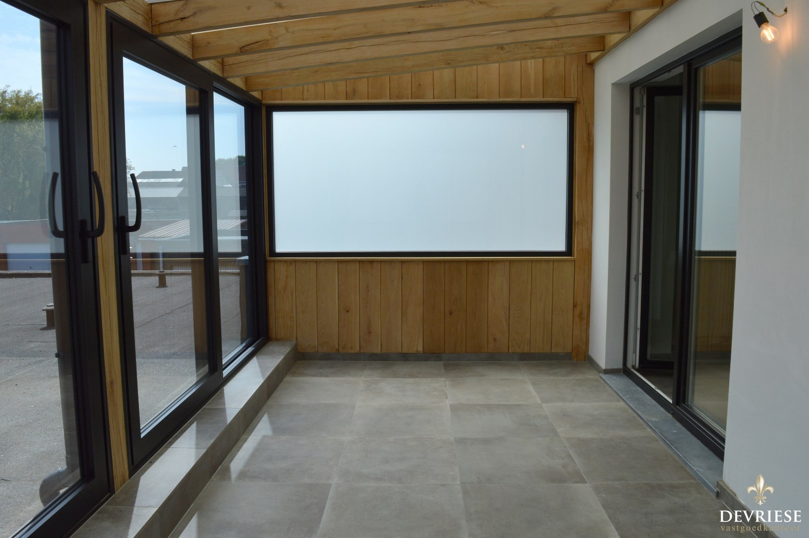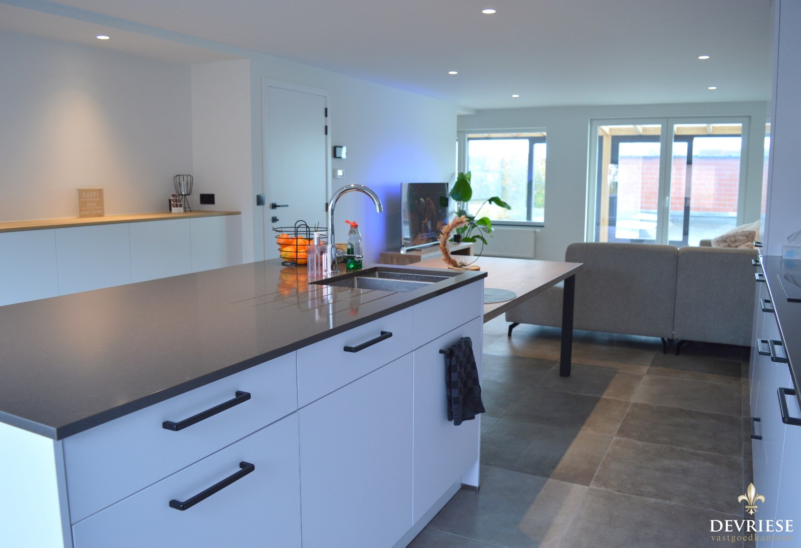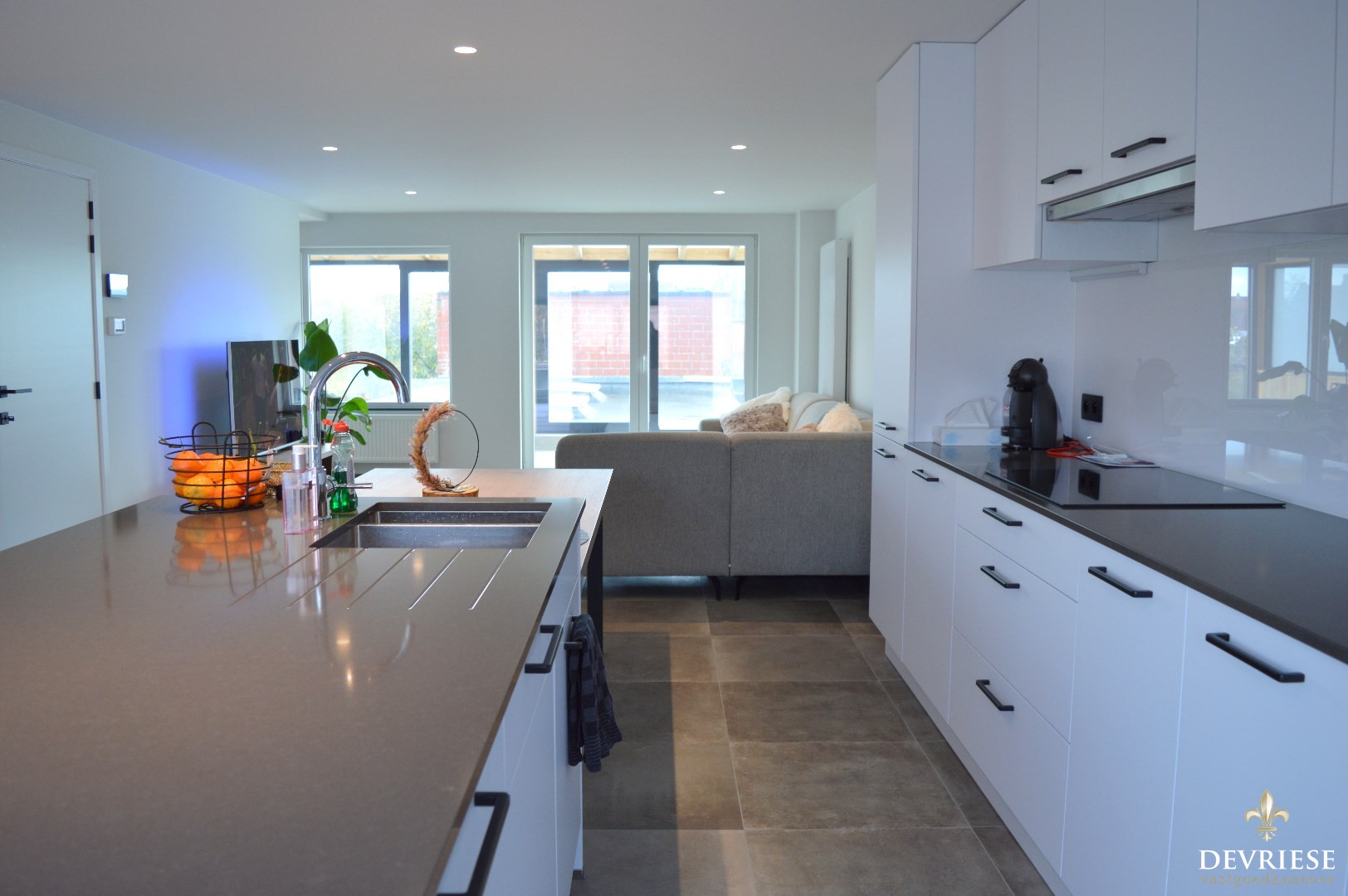 Inkomhal, apart toilet, ruime leefruimte met aansluitend de open keuken die volledig is ingericht (oven, microgolf, inbouwfrigo en inbouwdiepvries, vaatwasmachine). Vanuit de living is er toegang tot de gezellige veranda.