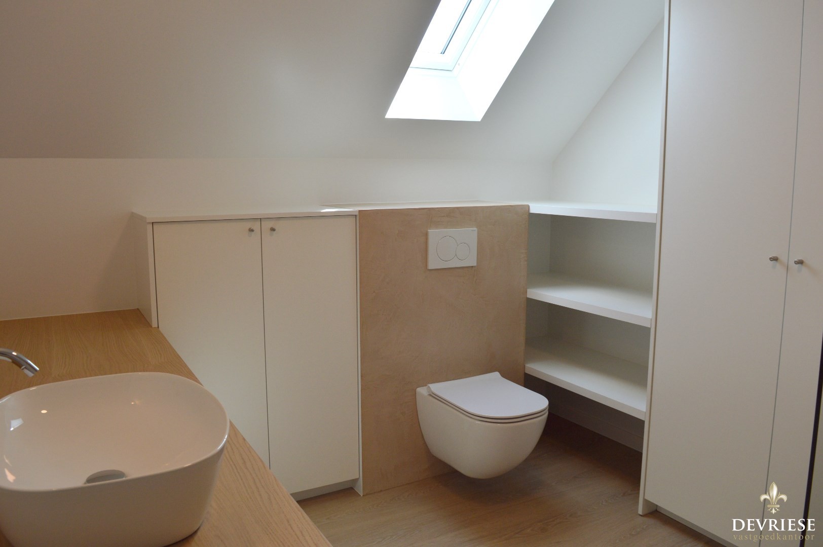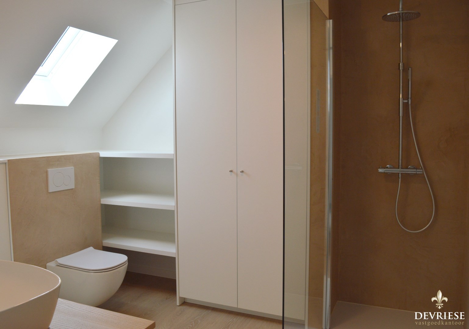 Op de eerste verdieping zijn er 2 slaapkamers voorzien van ingebouwde kasten en de ruime badkamer met inloopdouche, toilet en 1 lavabo.