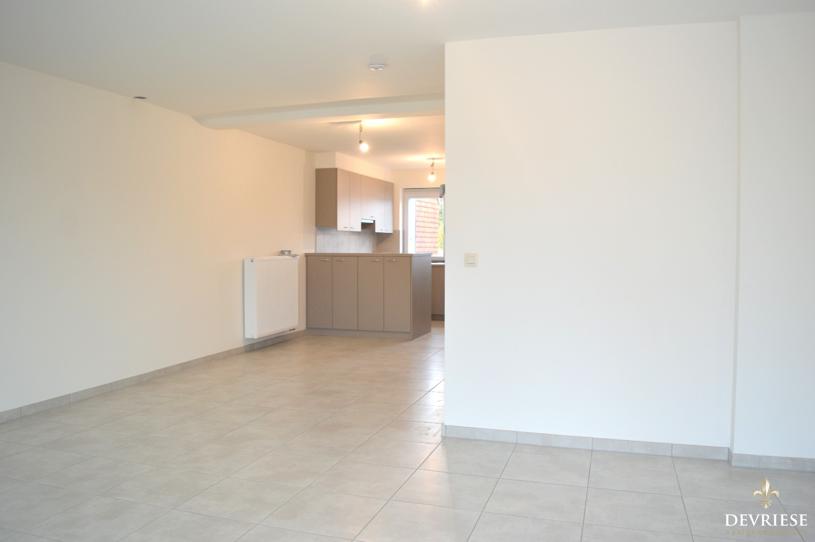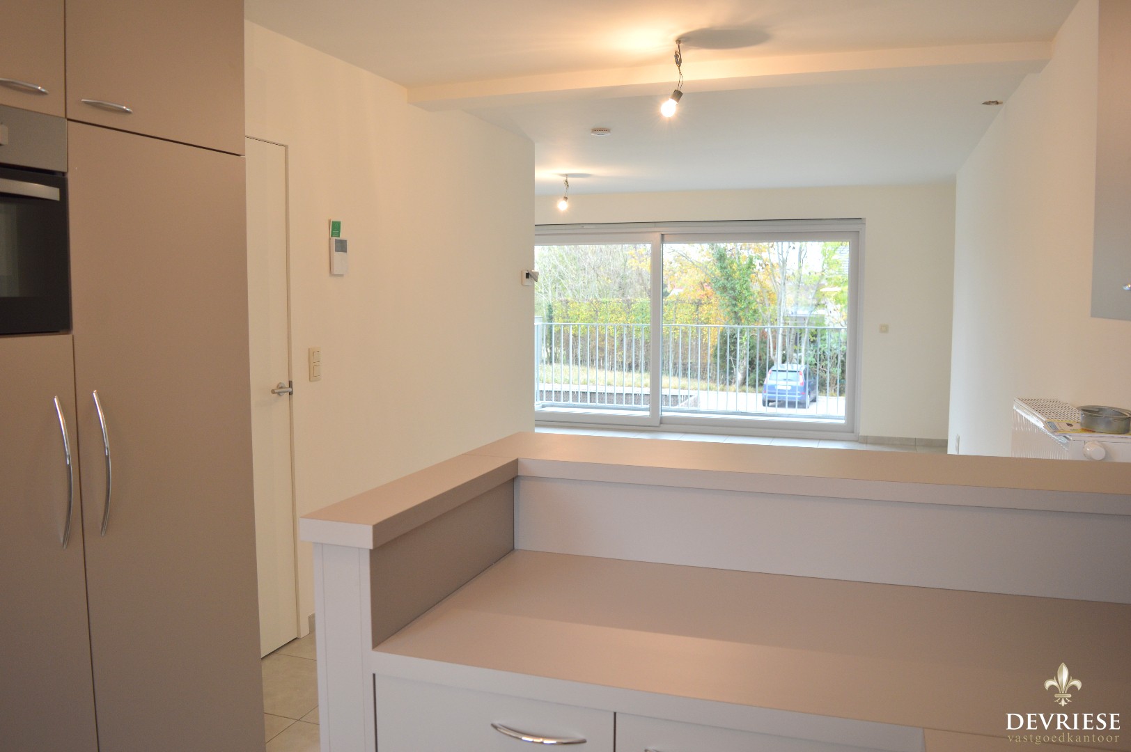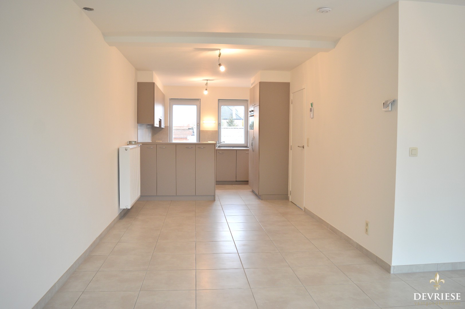Bij binnenkomst is er een apart toilet, bergruimte met aansluiting voor de wasmachine, de open keuken voorzien van alle toestellen met aansluitend de living met terras.