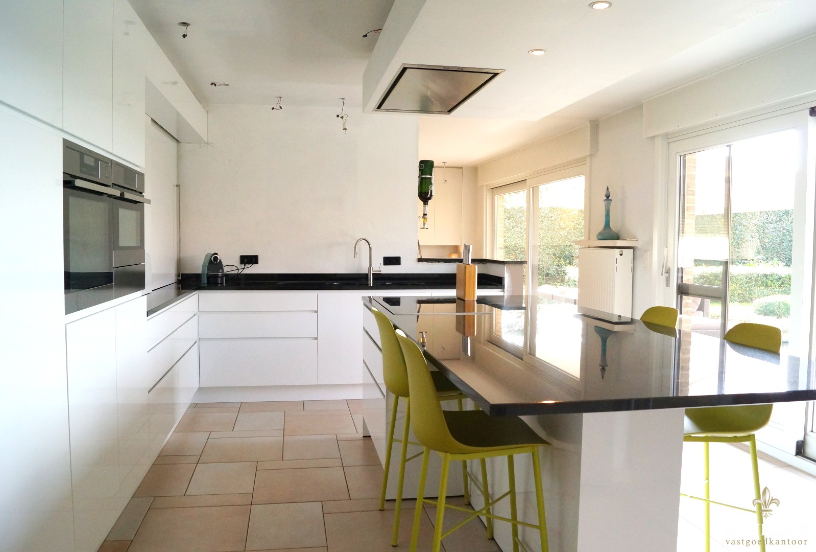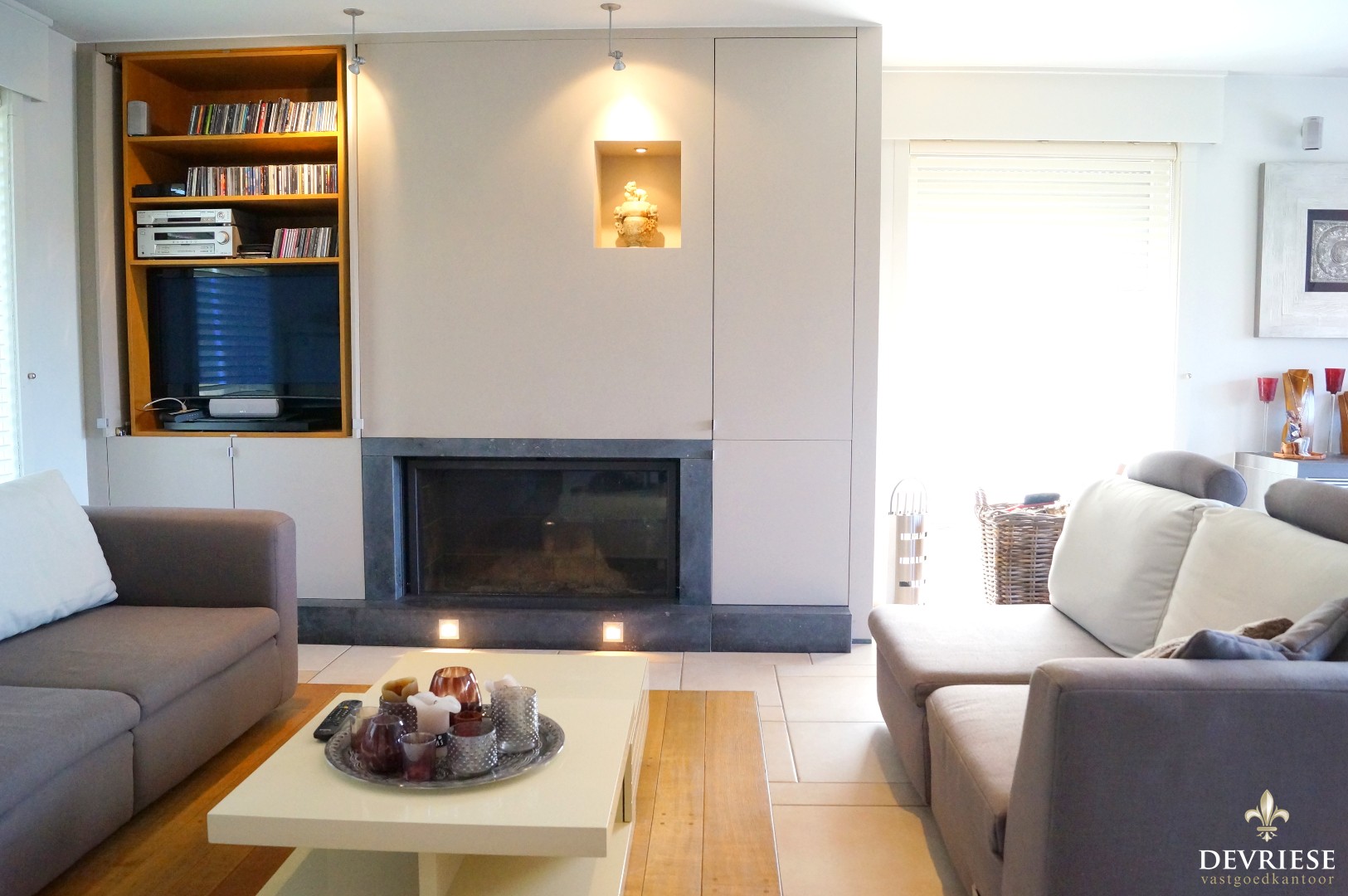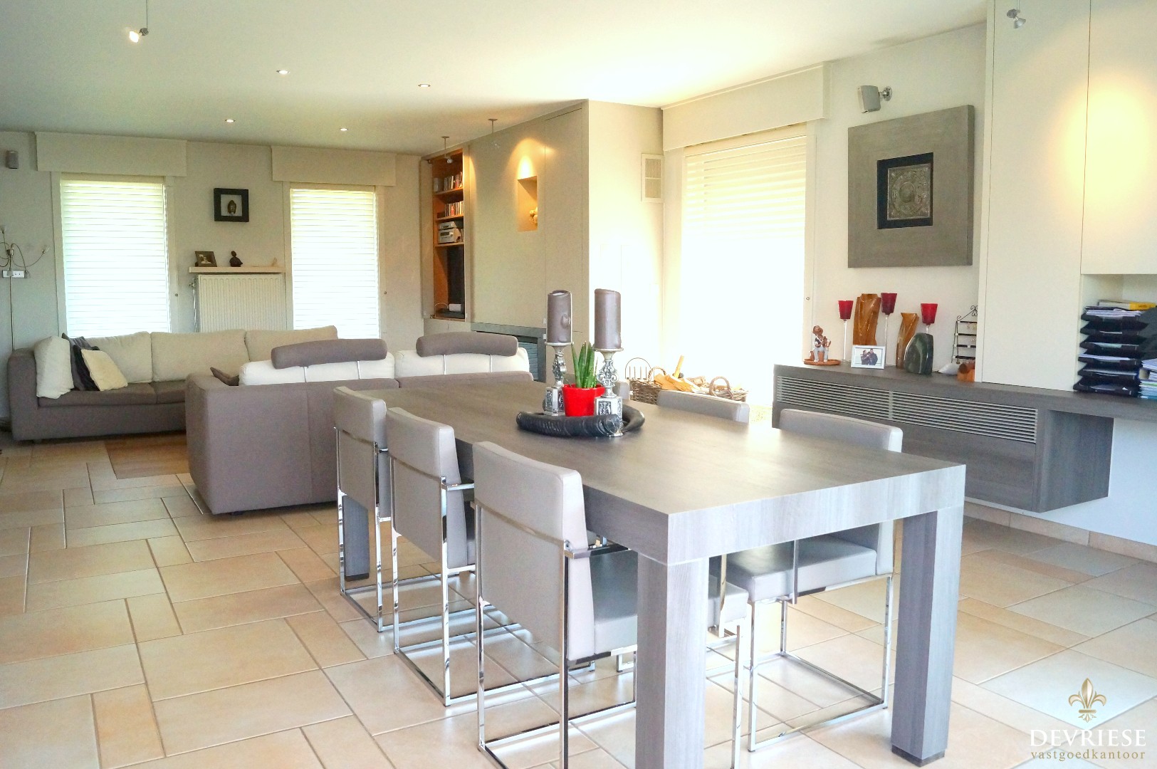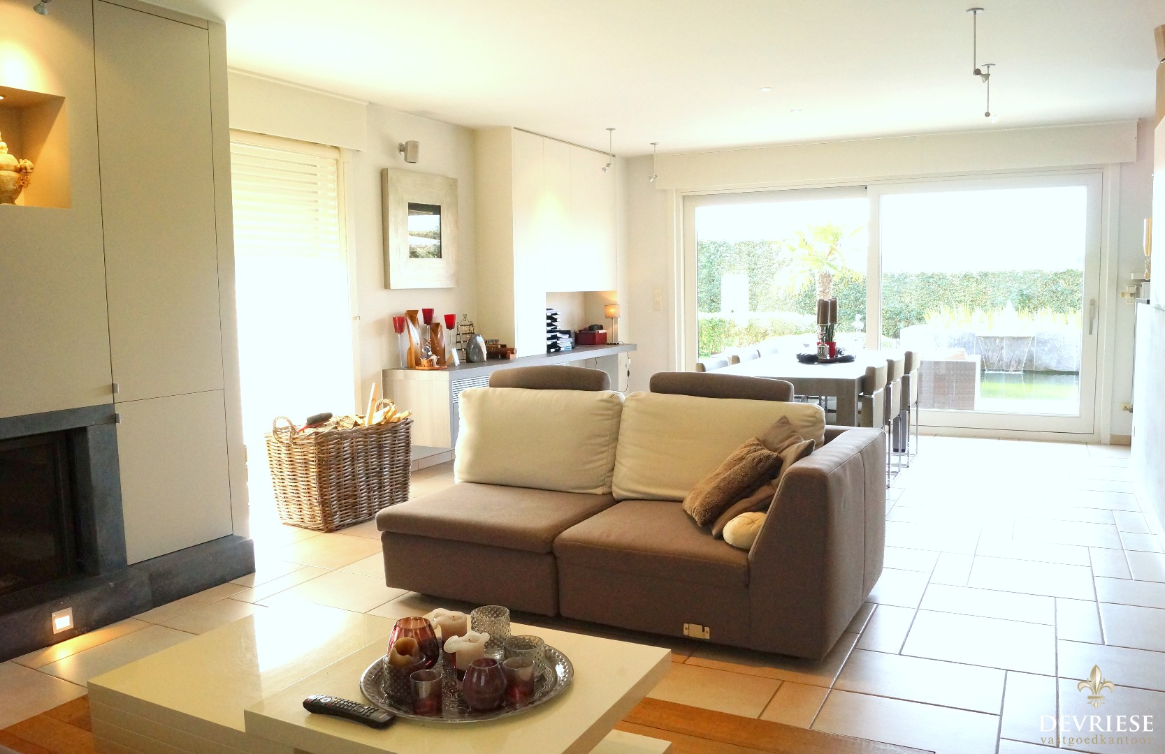 Ruime inkomhal met toegang tot het gastentoilet. De woonkamer met open haard geniet een enorme lichtinval vanwege de vele glaspartijen met daarenboven een vol zicht op de mooi aangelegde tuin, open keuken voorzien van alle toestellen, extra berging en wasruimte. De woning is voorzien van een dubbele garage met elektrische poort en een ruimte oprit.