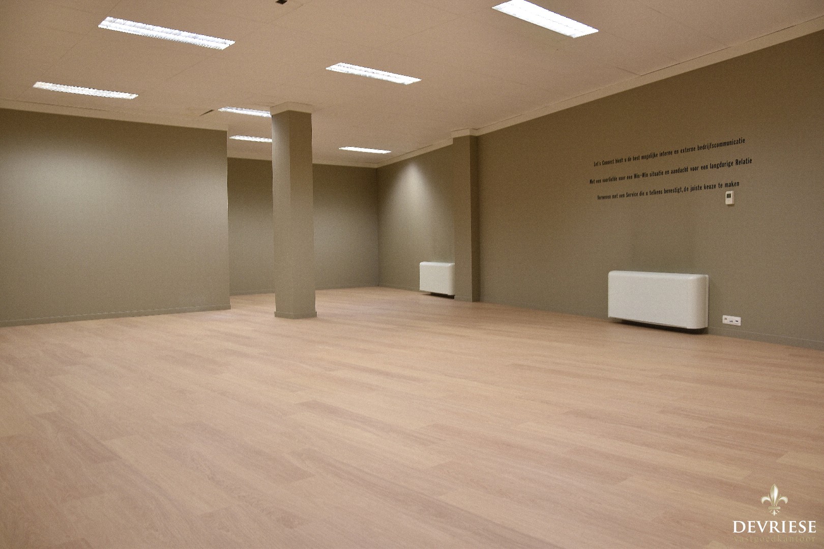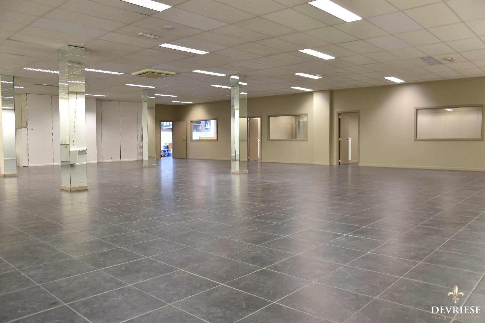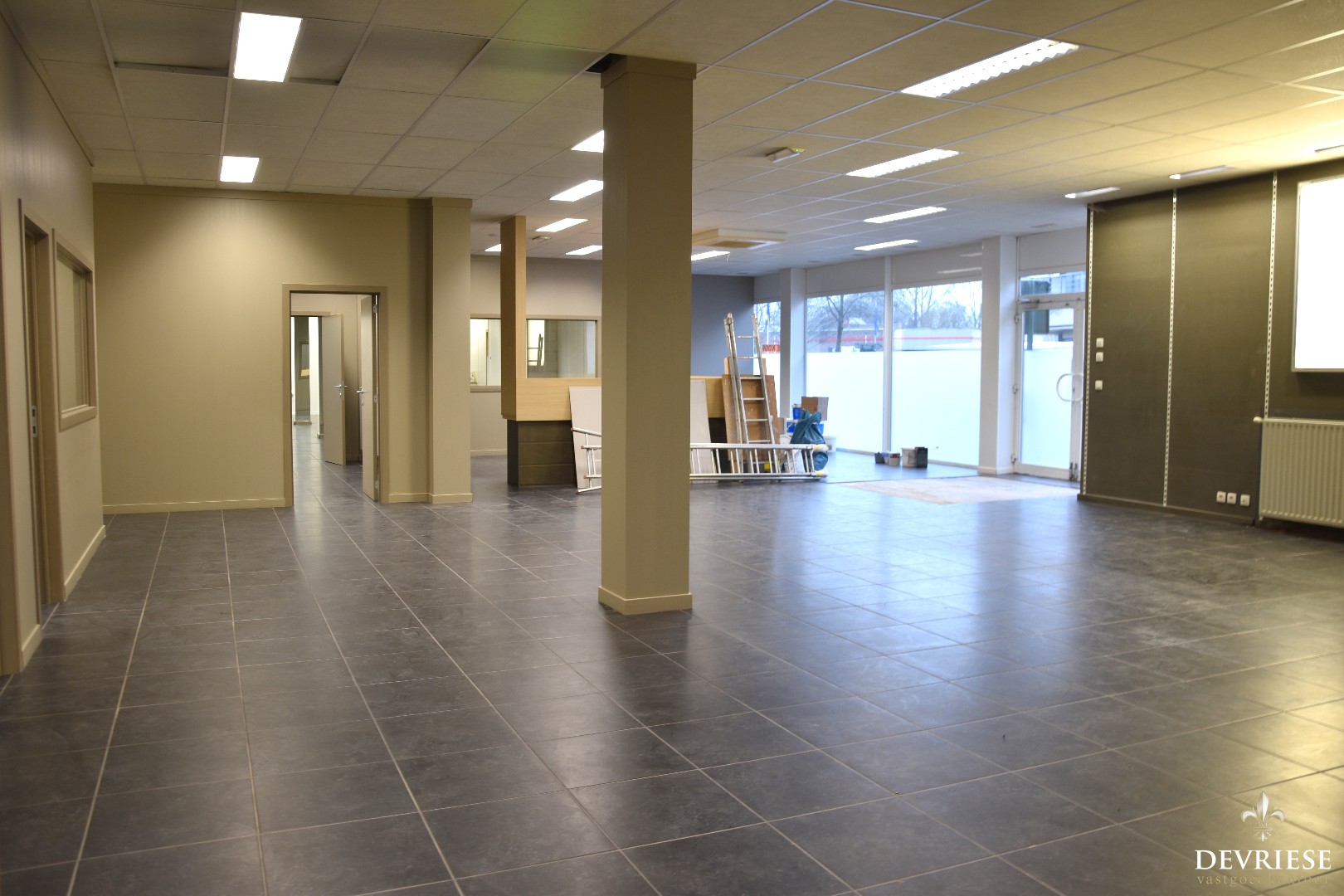 Op vandaag is het pand opgedeeld in verschillende bureau- of werkruimtes maar vooral doormiddel van houten wanden. De indeling is m.a.w. zeer vlot te wijzigen. Ook in aanwezigheid van keuken en sanitair.