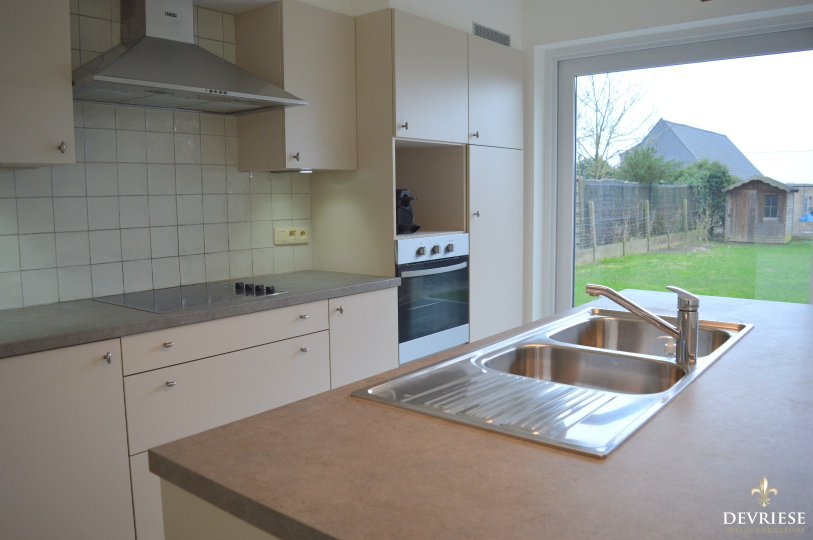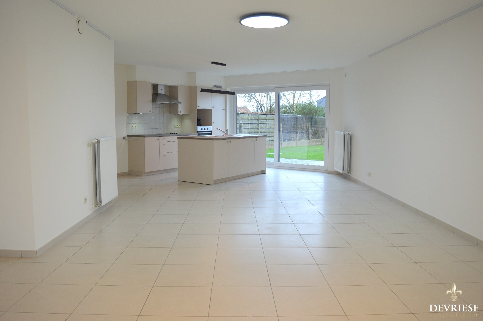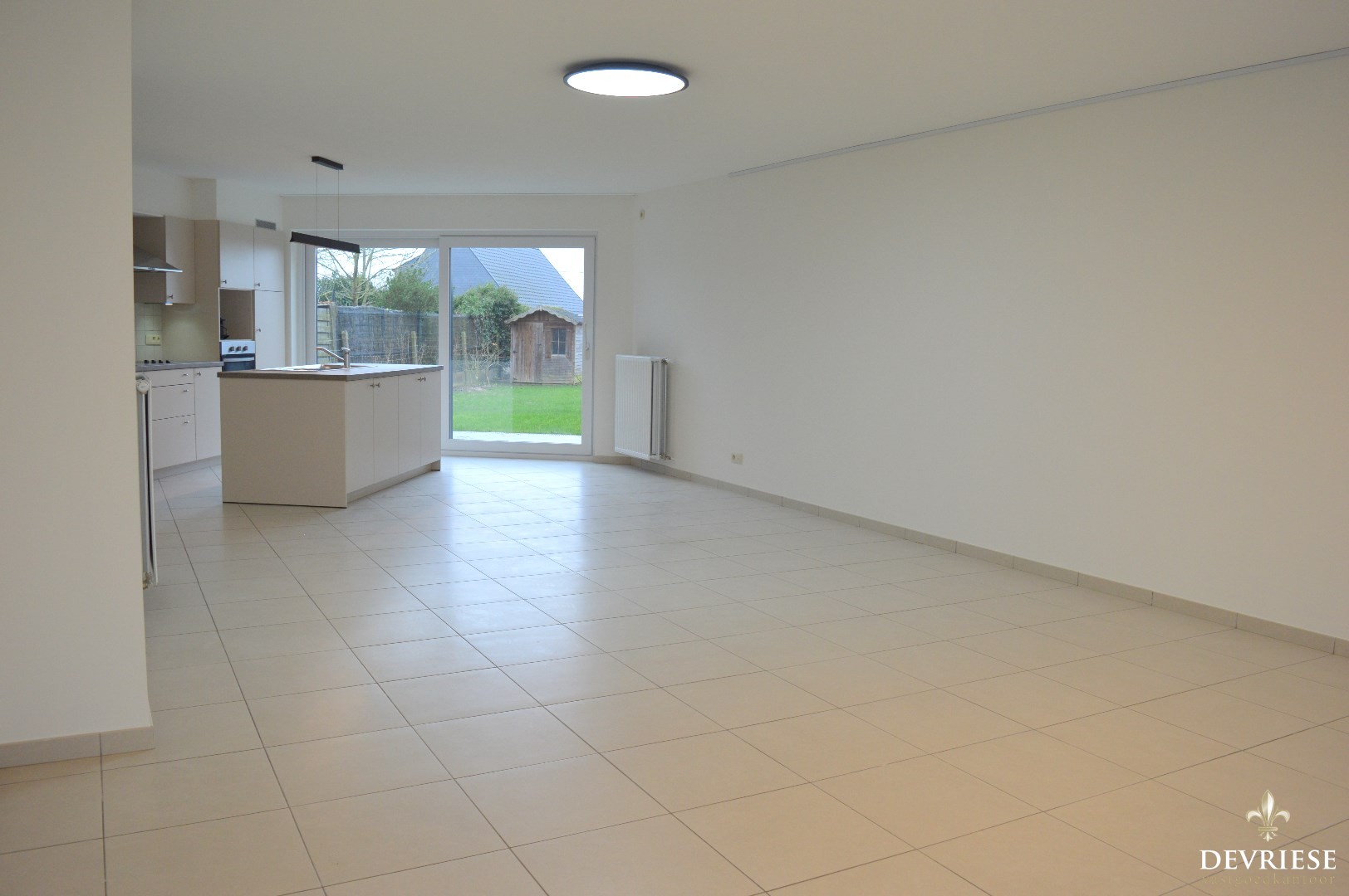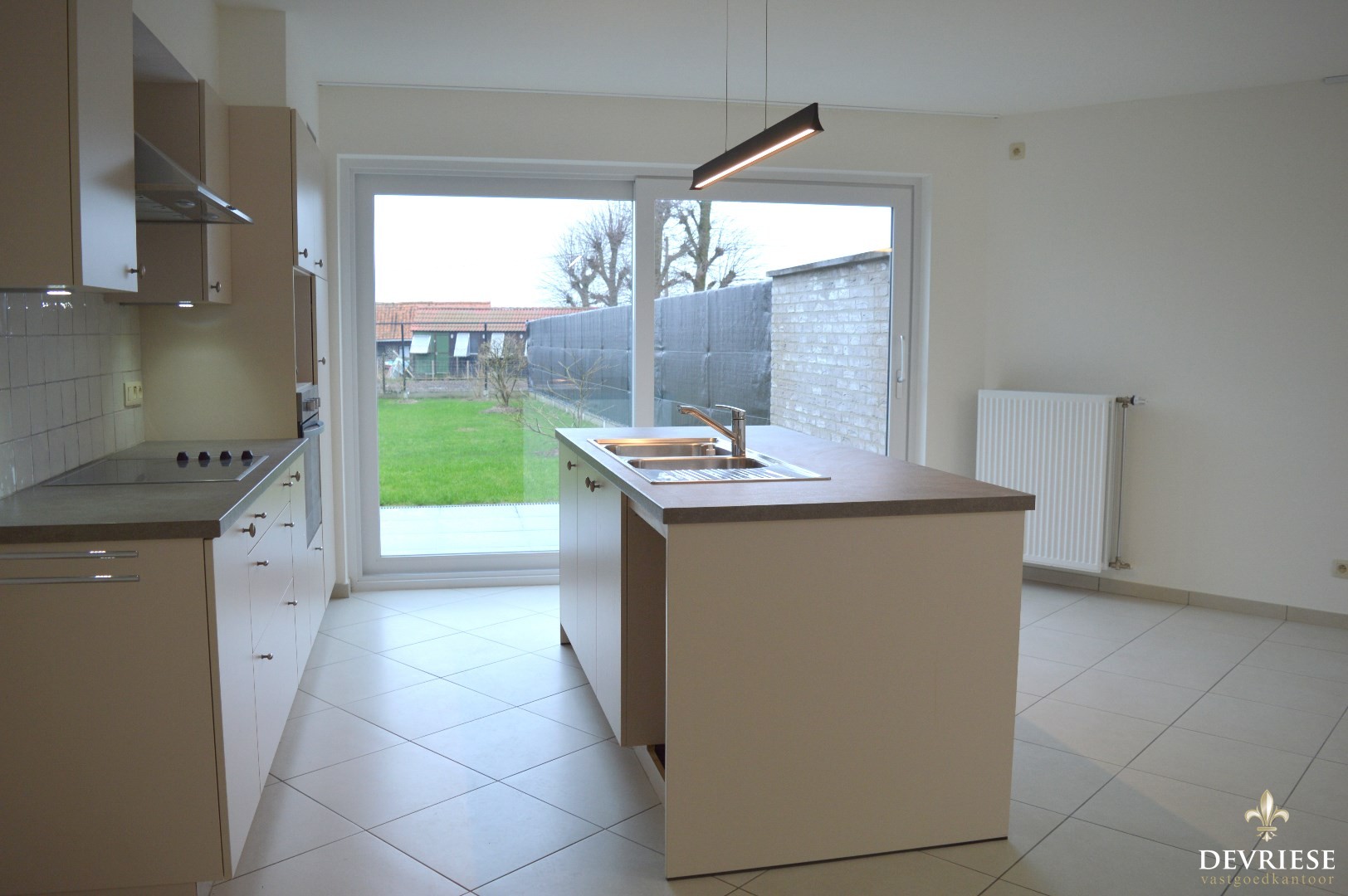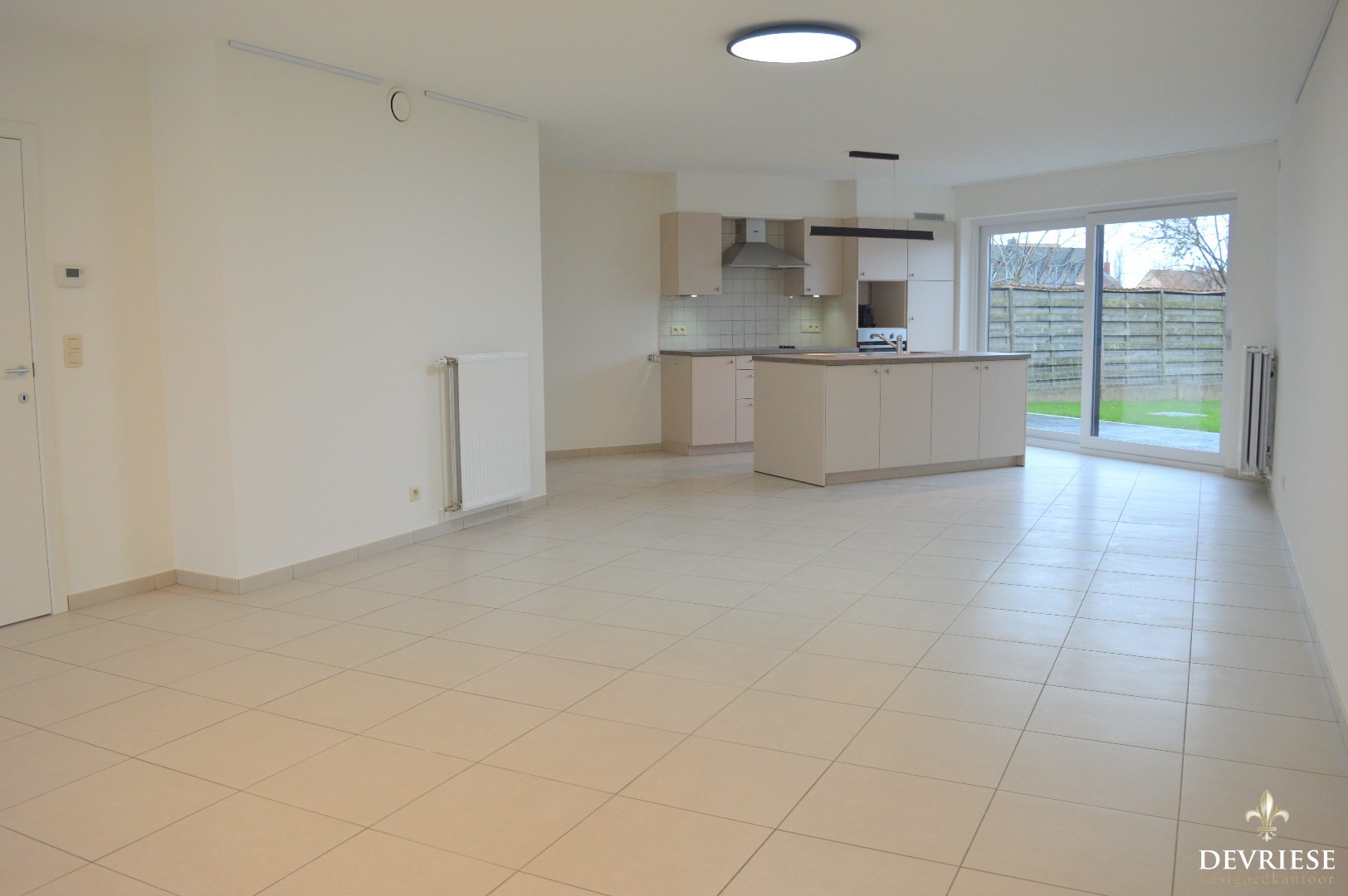 Ruime inkomhal met een apart gastentoilet. Ruime en lichtrijke leefruimte met aansluitend de open keuken (voorzien van keramische kookplaat, oven en inbouwfrigo). Via het grote schuifraam is er toegang tot de tuin met gunstige oriëntatie.