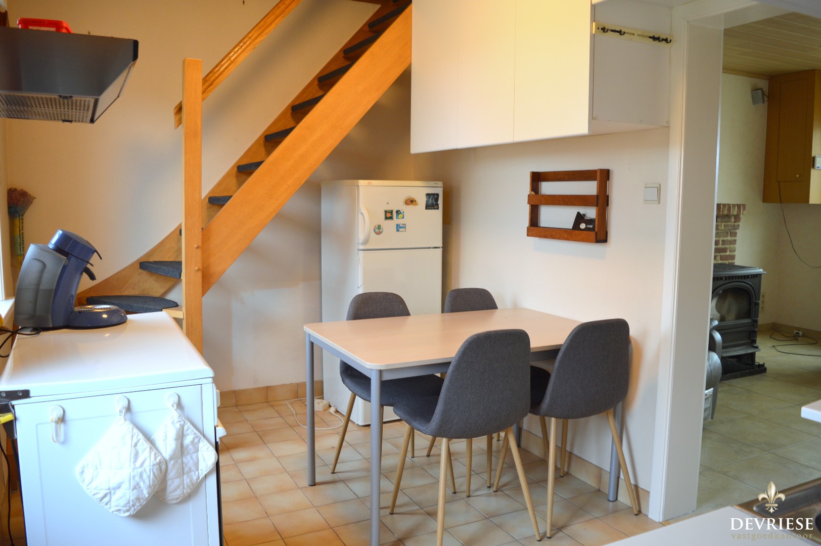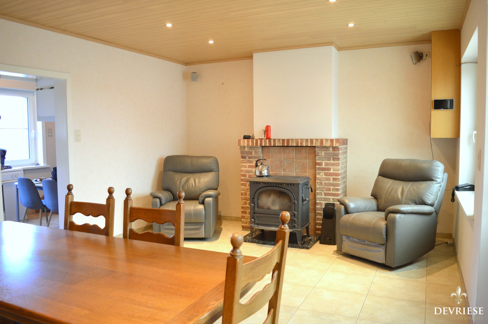 Via de oprit komen we binnen in de woning via de lichtrijke veranda. Daarachter bevindt zich de living, de keuken en badkamer voorzien van douche, lavabo en toilet.