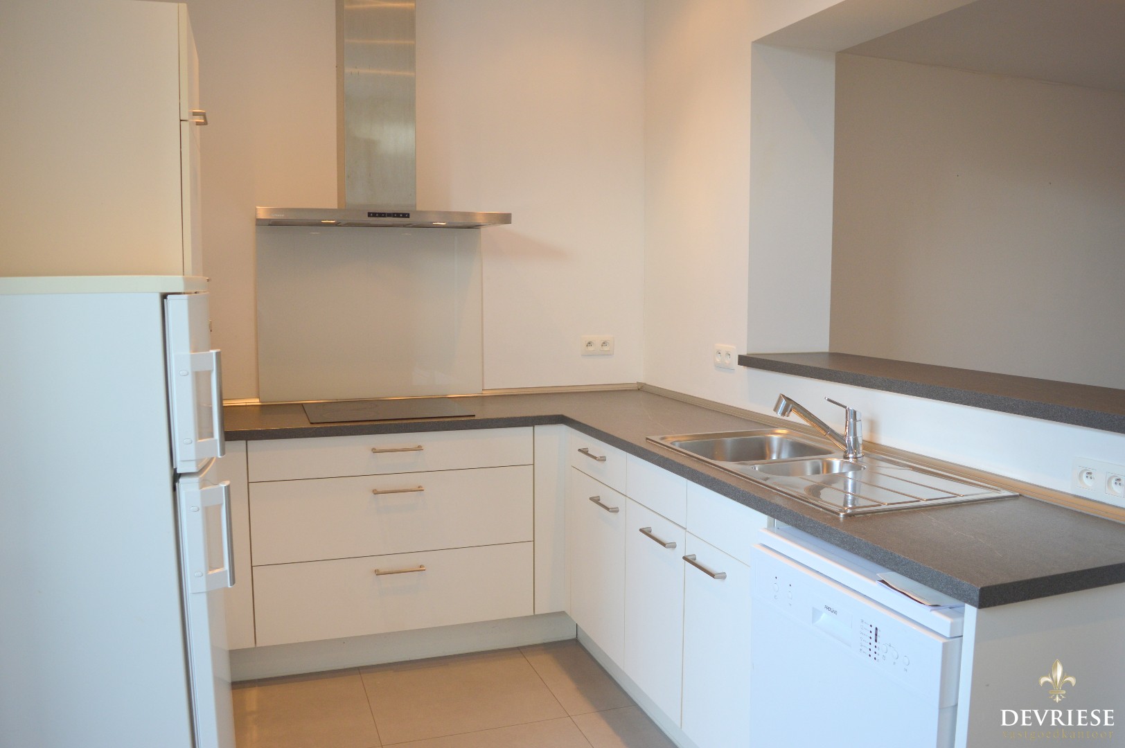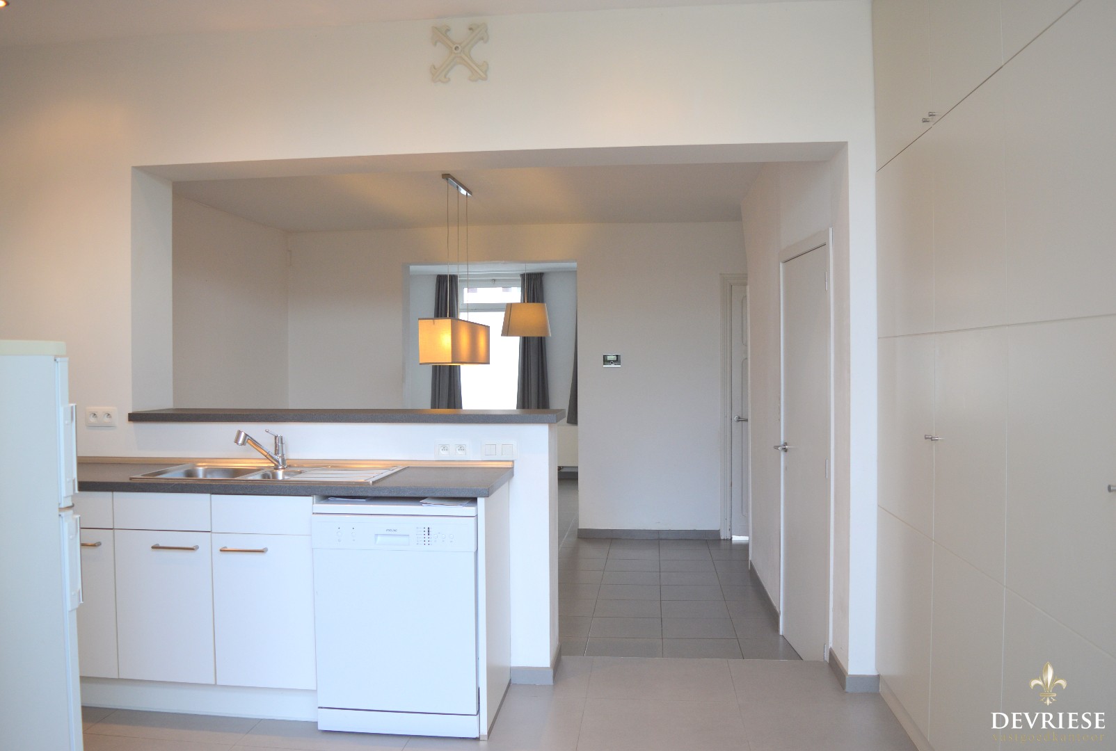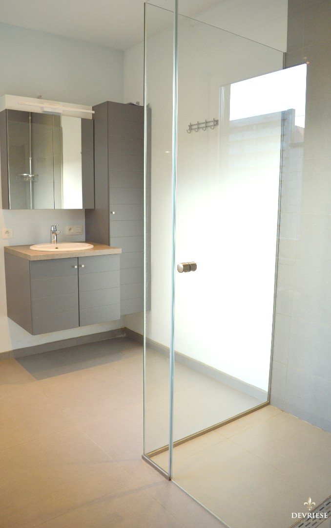 Op het gelijkvloers bevindt zich de ruime woonkamer met daarachter aansluitend de moderne keuken ingericht met toestellen. Ook op het gelijkvloers een toilet, badkamer met douche, 1 lavabo en aansluiting voor de wasmachine.