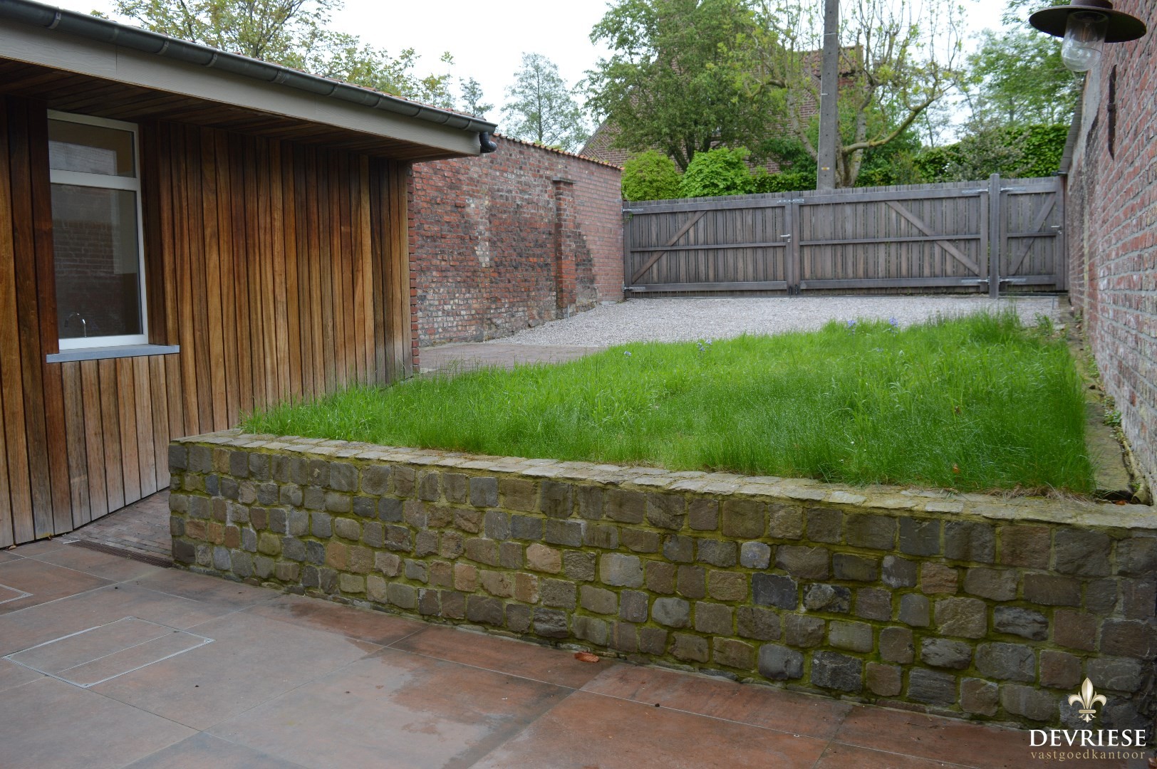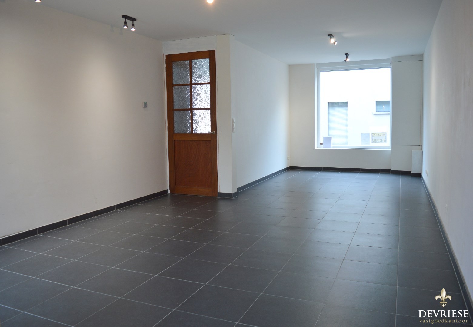 Inkom met bureau ruimte, apart toilet, ruime leefruimte met aansluitend de keuken (ingericht met oven, keramische kookplaat en een vaatwasmachine). Via zowel de keuken als de leefruimte is er toegang tot de aangename tuin met achteraan een handige uitweg.
