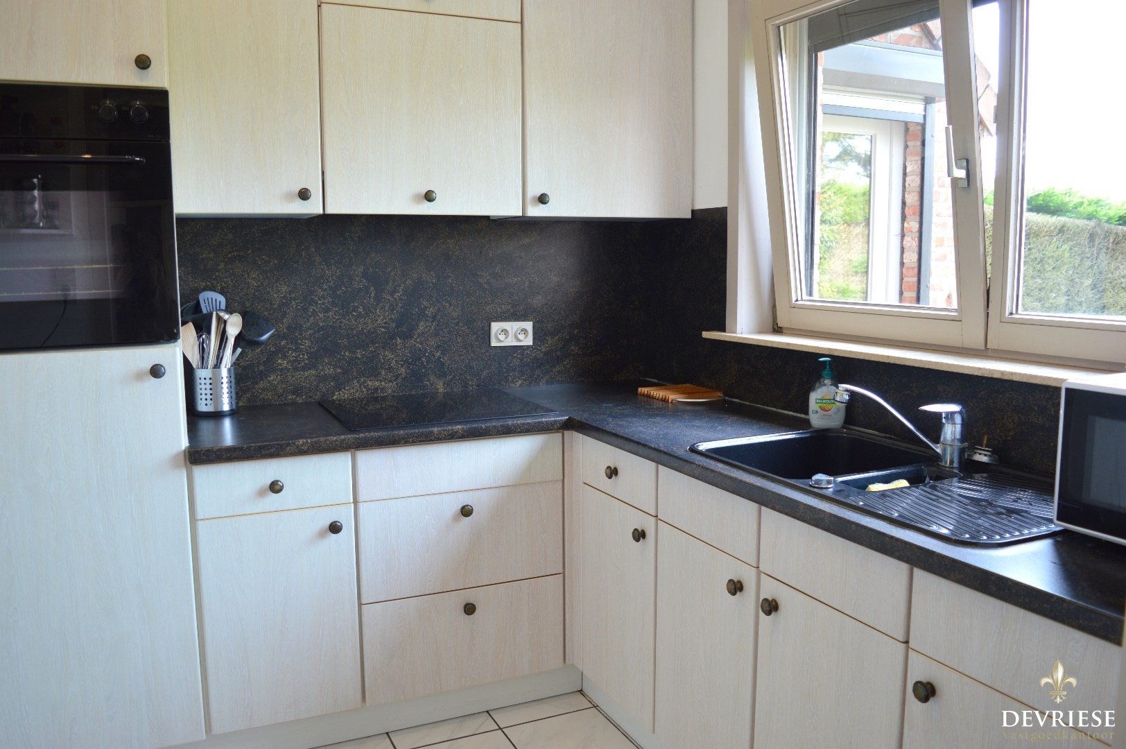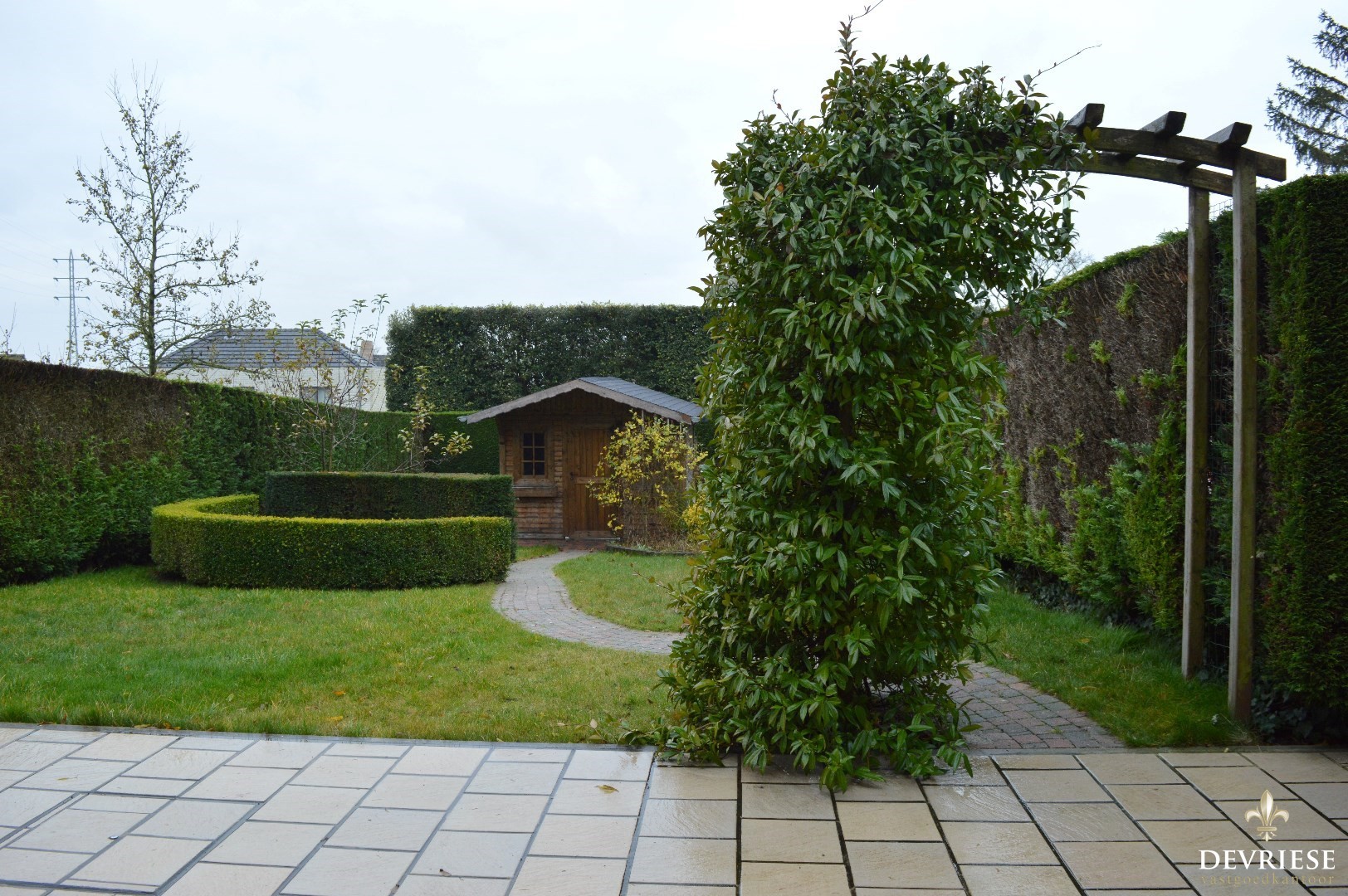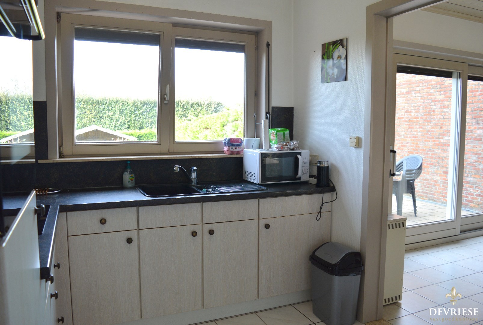Een aparte inkomhal met gastentoilet, leefruimte met zicht op de tuin, keuken met kookplaat, ingebouwde frigo en oven. Daarnaast de garage met elektrische poort en aansluiting voor de wasmachine voorzien. Vanuit de leefruimte is er toegang tot de gunstig georiënteerde tuin met tuinhuis.