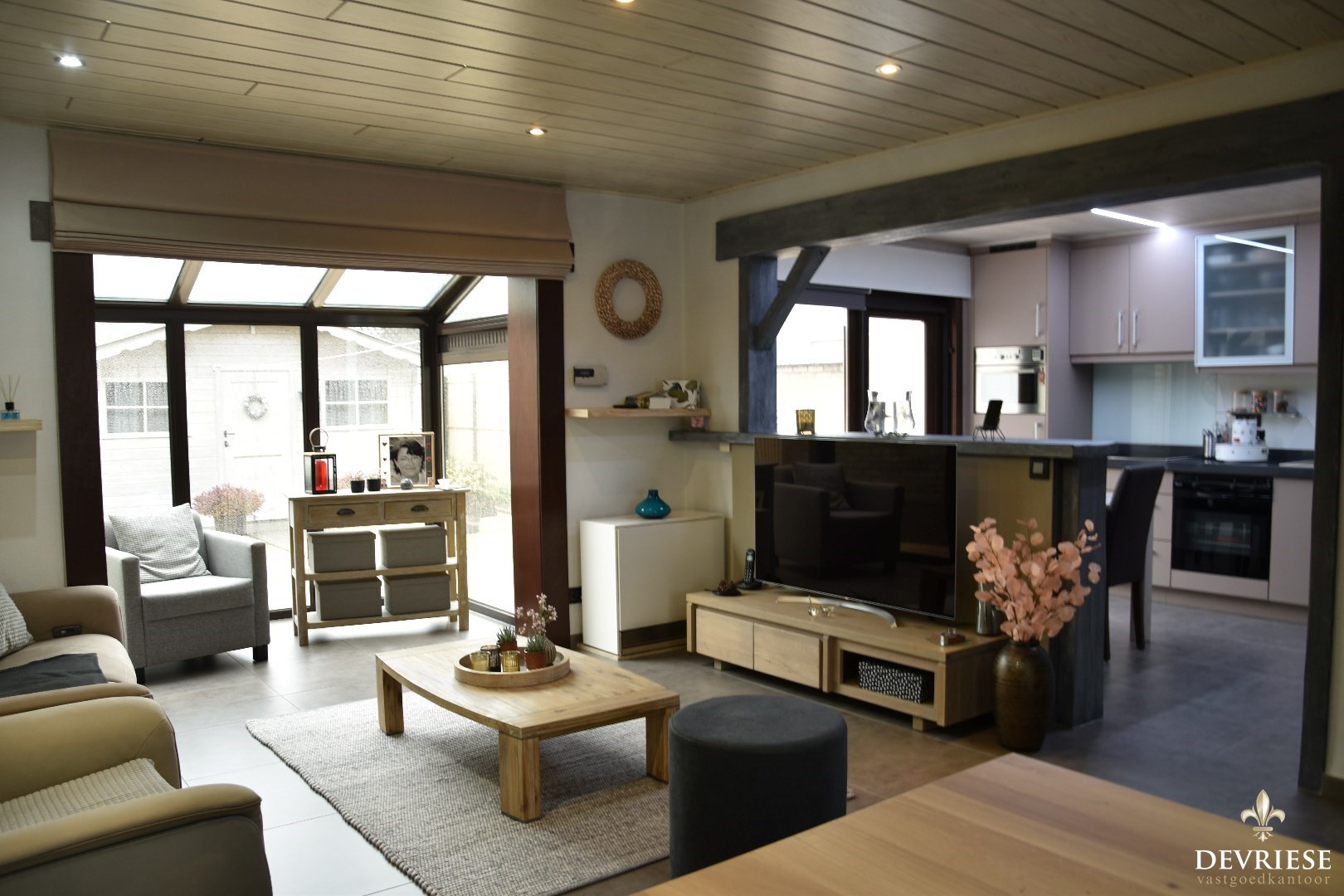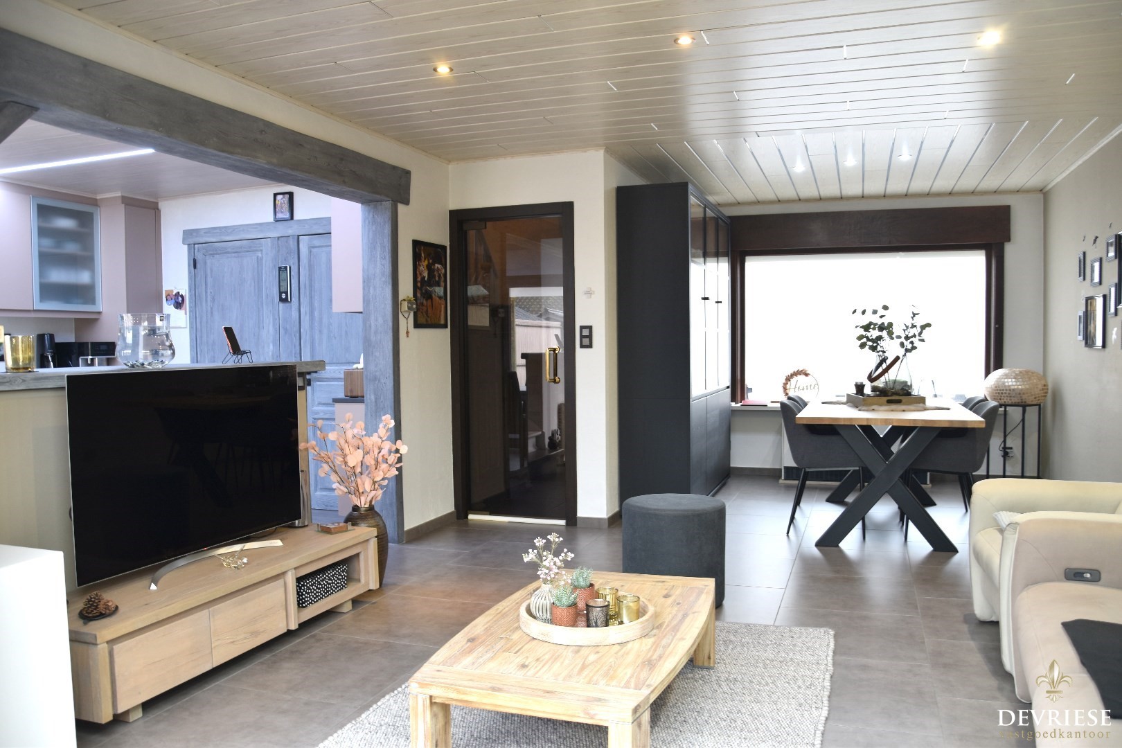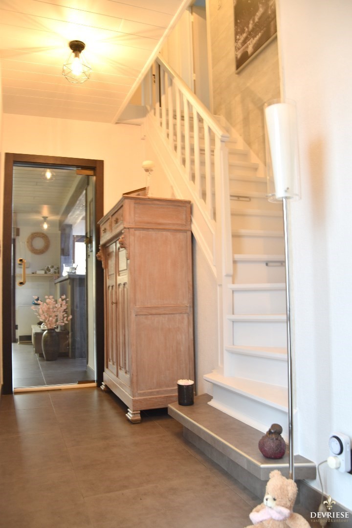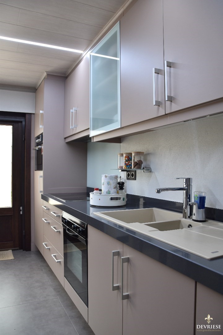 Inkomhal met apart toilet. Via de glazen deur bereikt u de ruime leefruimte. Deze omvat een cosy zithoek en een eetplaats. Palend vinden we een geëquipeerde open keuken (toestellen merk Whirpool & Miele) met ontbijthoek.