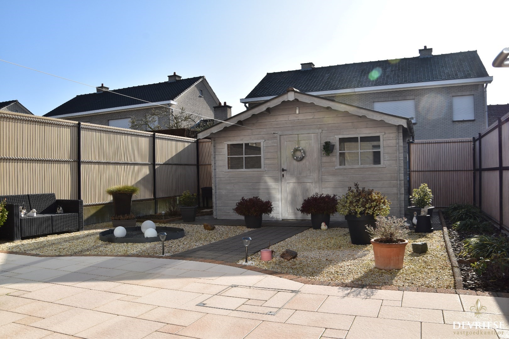 Zuidgericht perceel met aangelegd terras en tuinhuis. Buiten vertoeven wordt zalig!