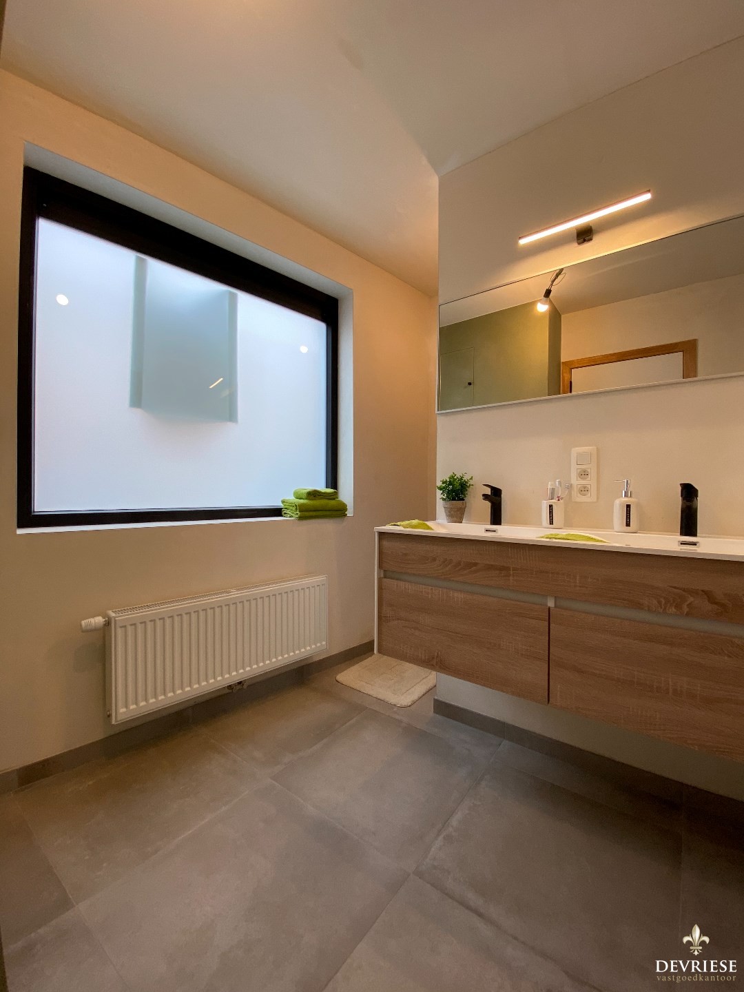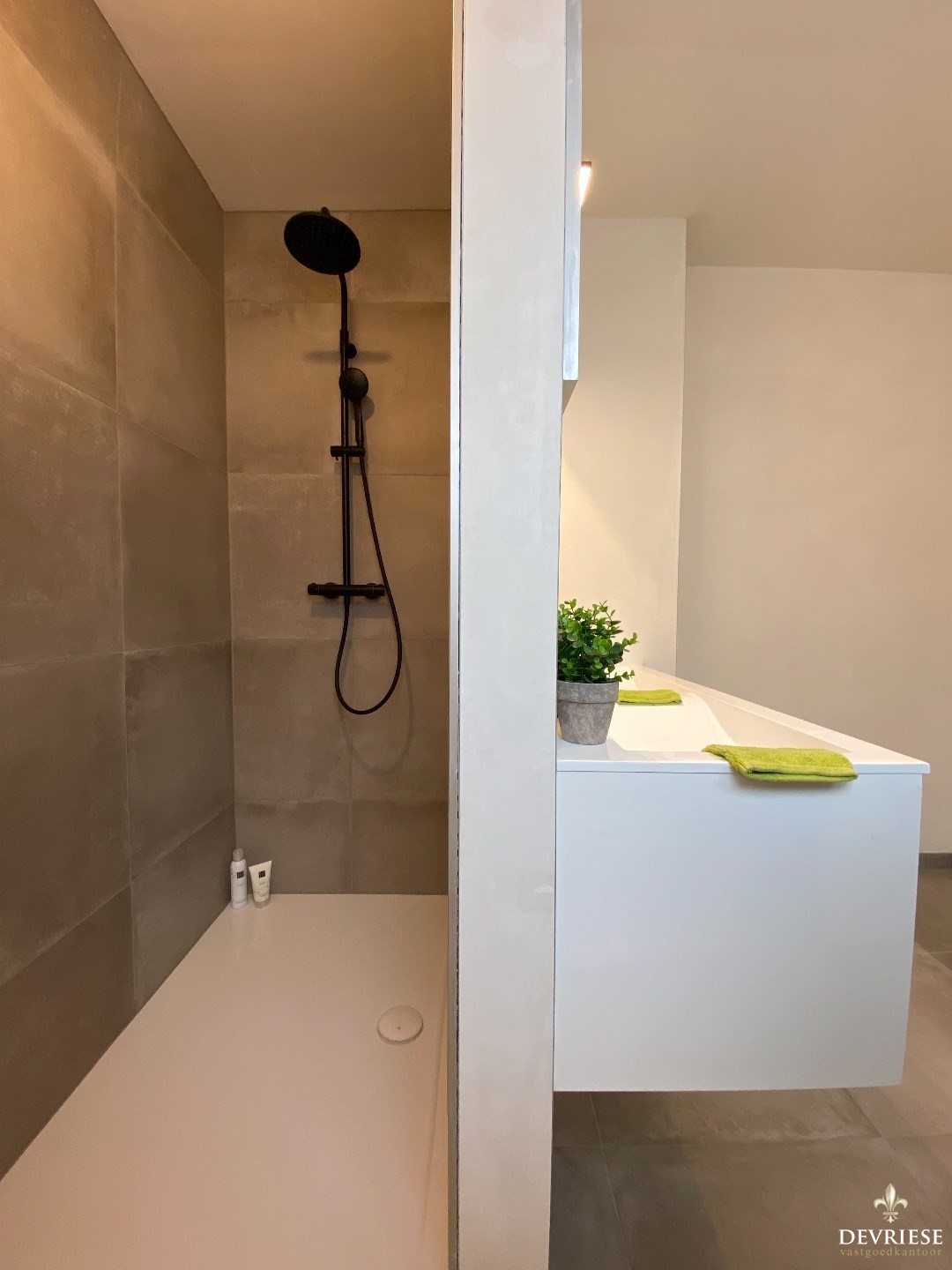 Vooraan de woning is de vernieuwde badkamer gelegen voorzien van een dubbele lavabo en een inloopdouche.