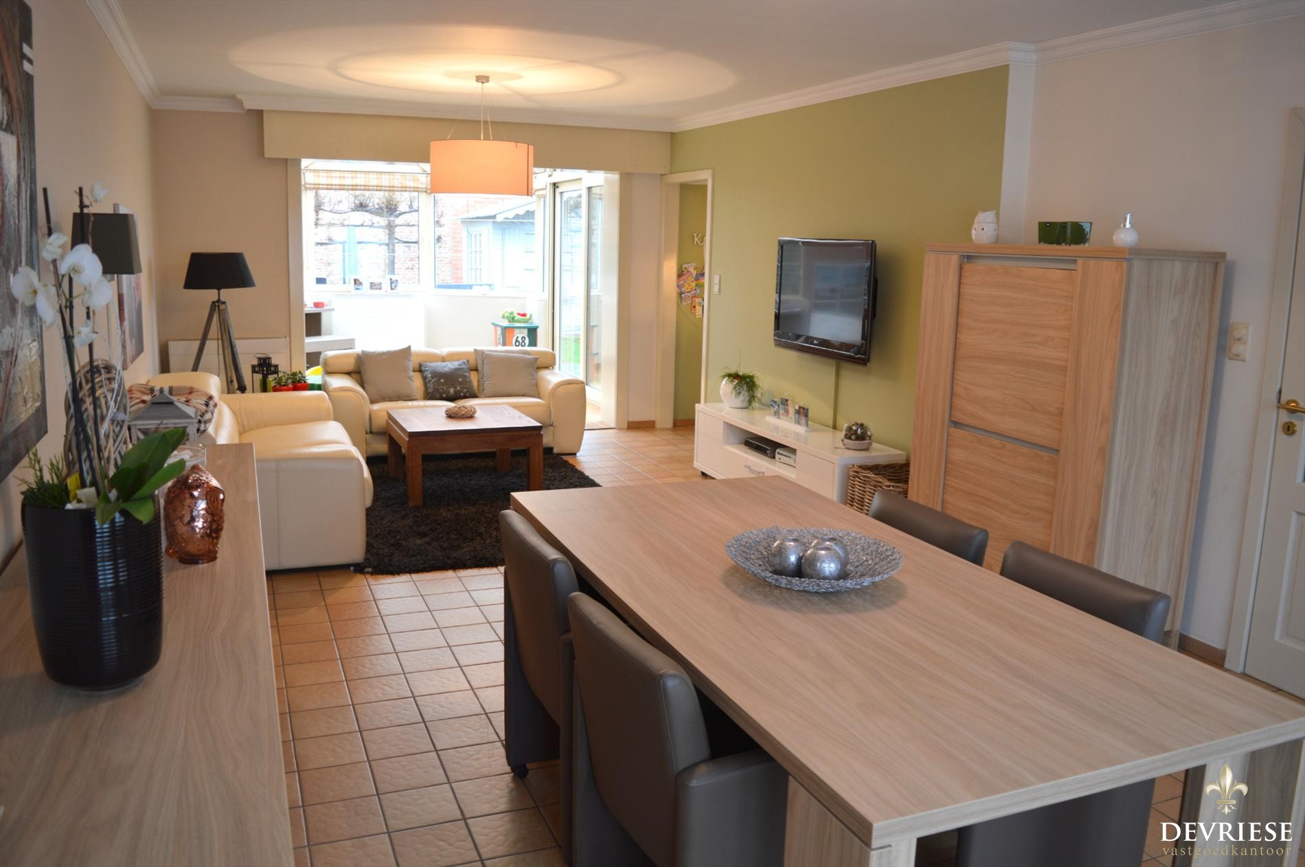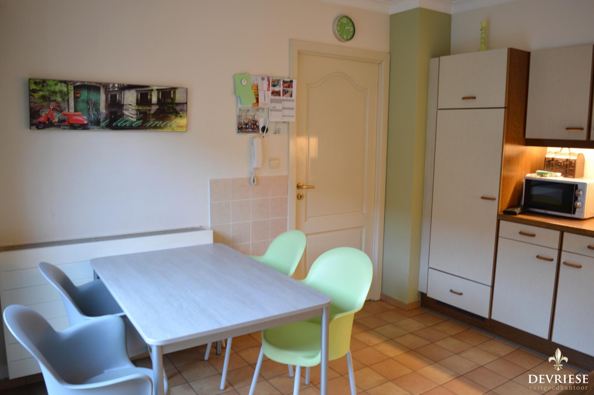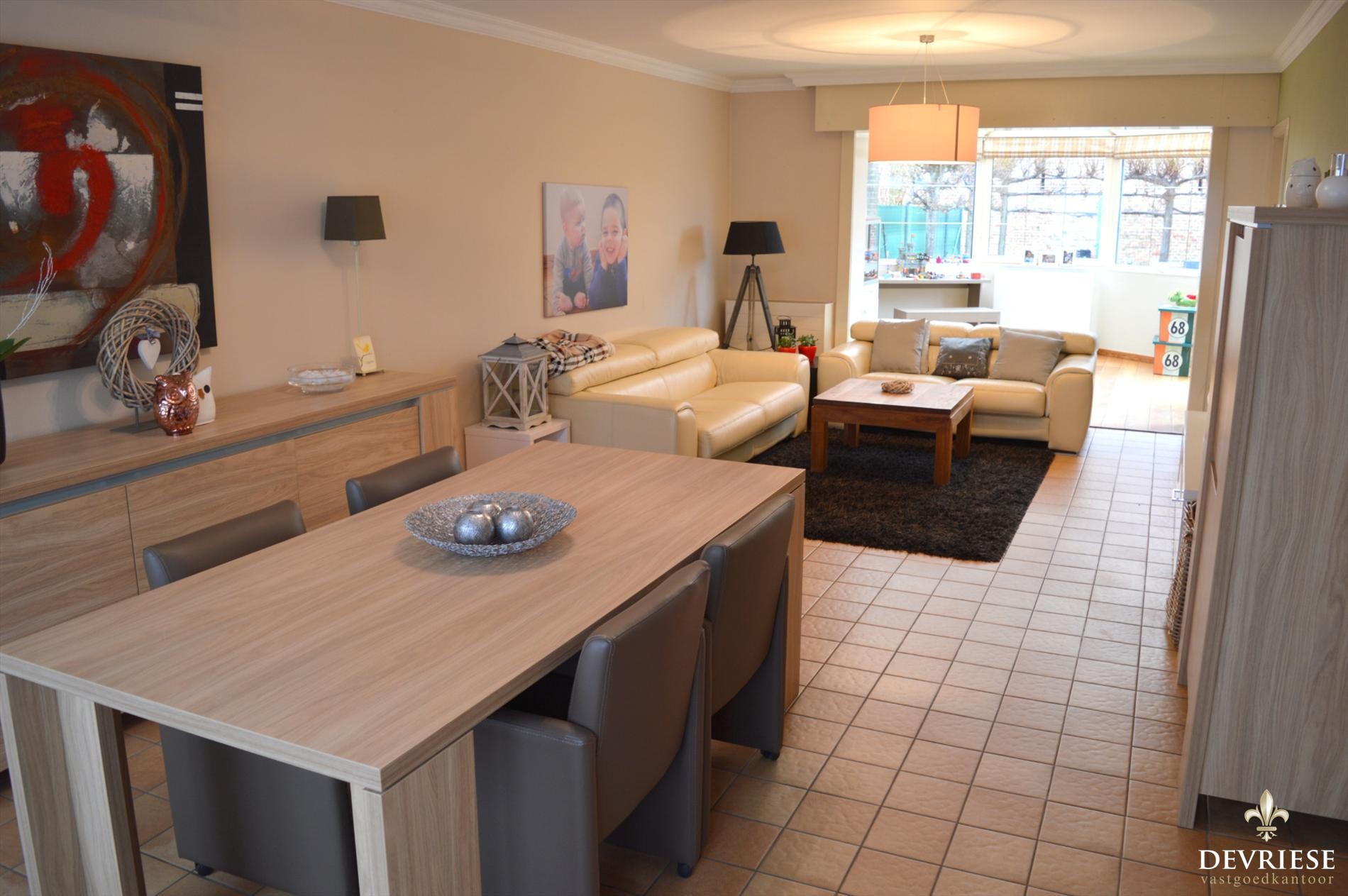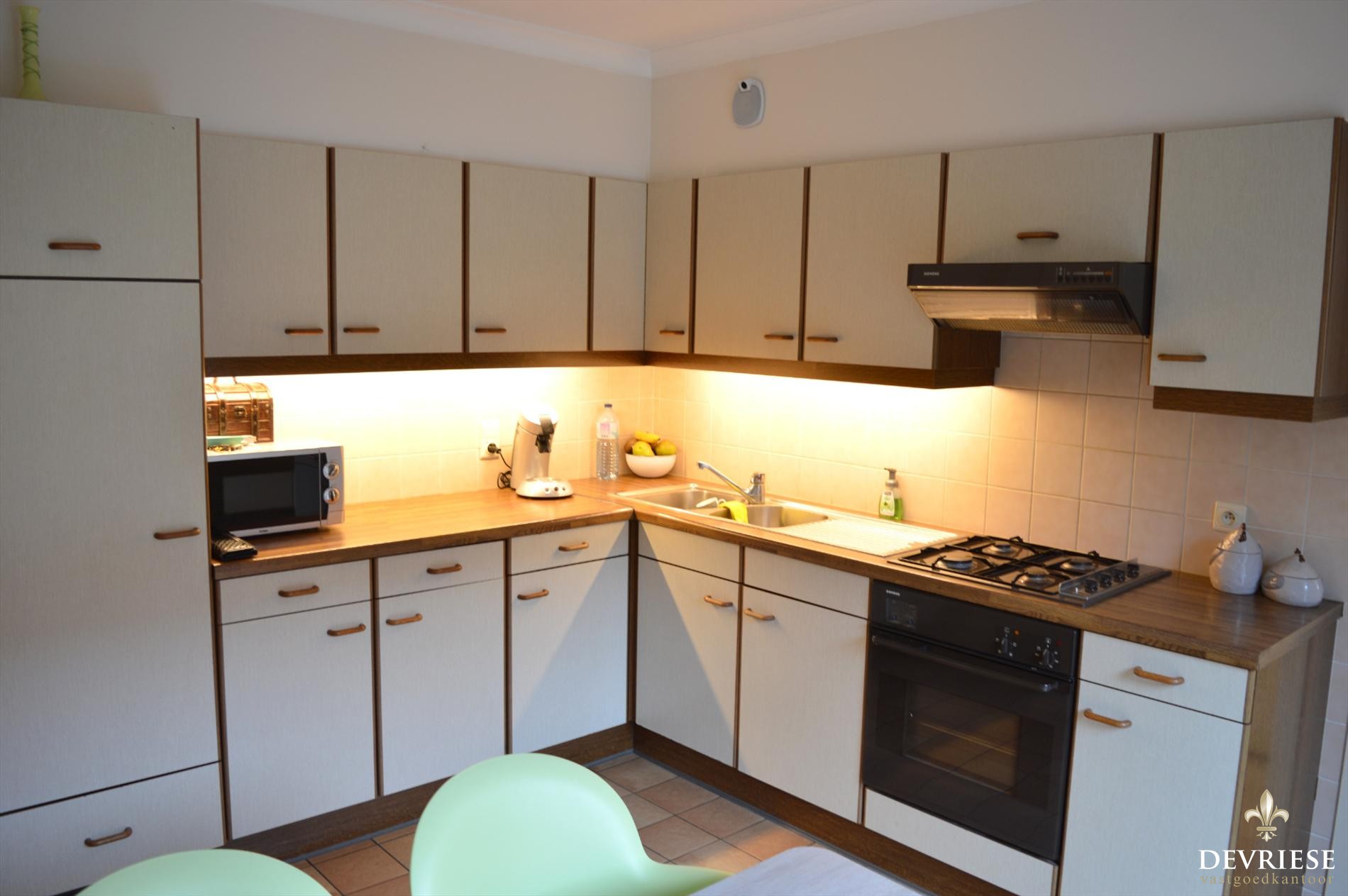 Deze gesloten bebouwing bevindt zich in een verkeersarme woonwijk dichtbij het centrum van Gullegem. Via de inkom met gastentoilet komen we in de ruime woonkamer met aanpalende veranda met tuinzicht. Het is er fijn vertoeven en ideaal voor een gezin met kinderen.