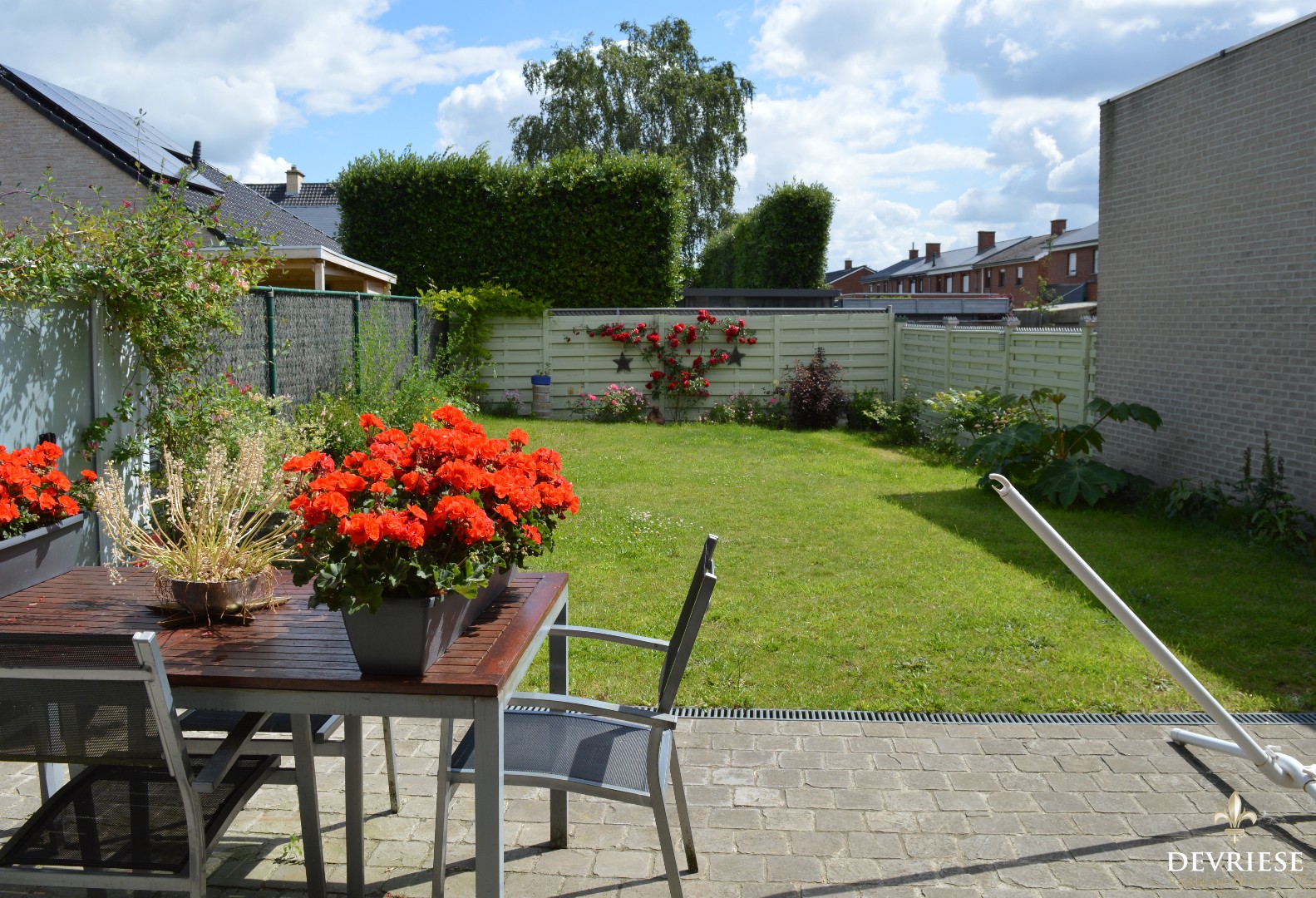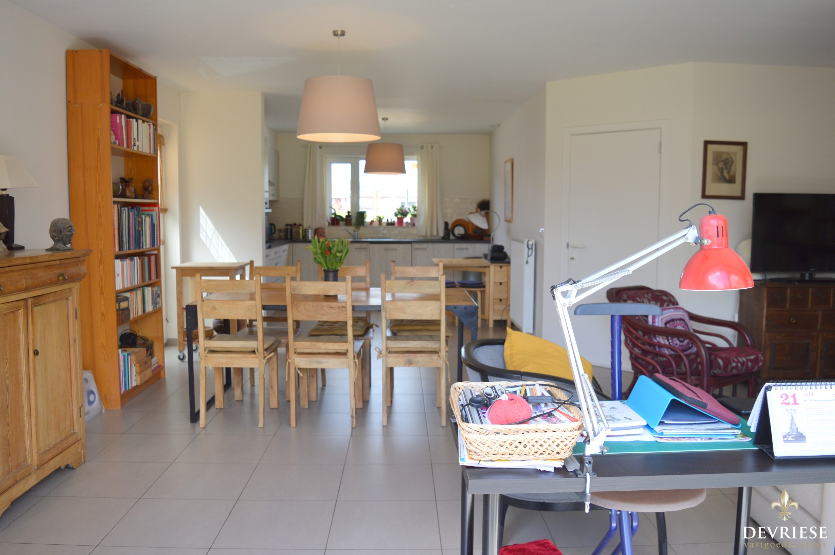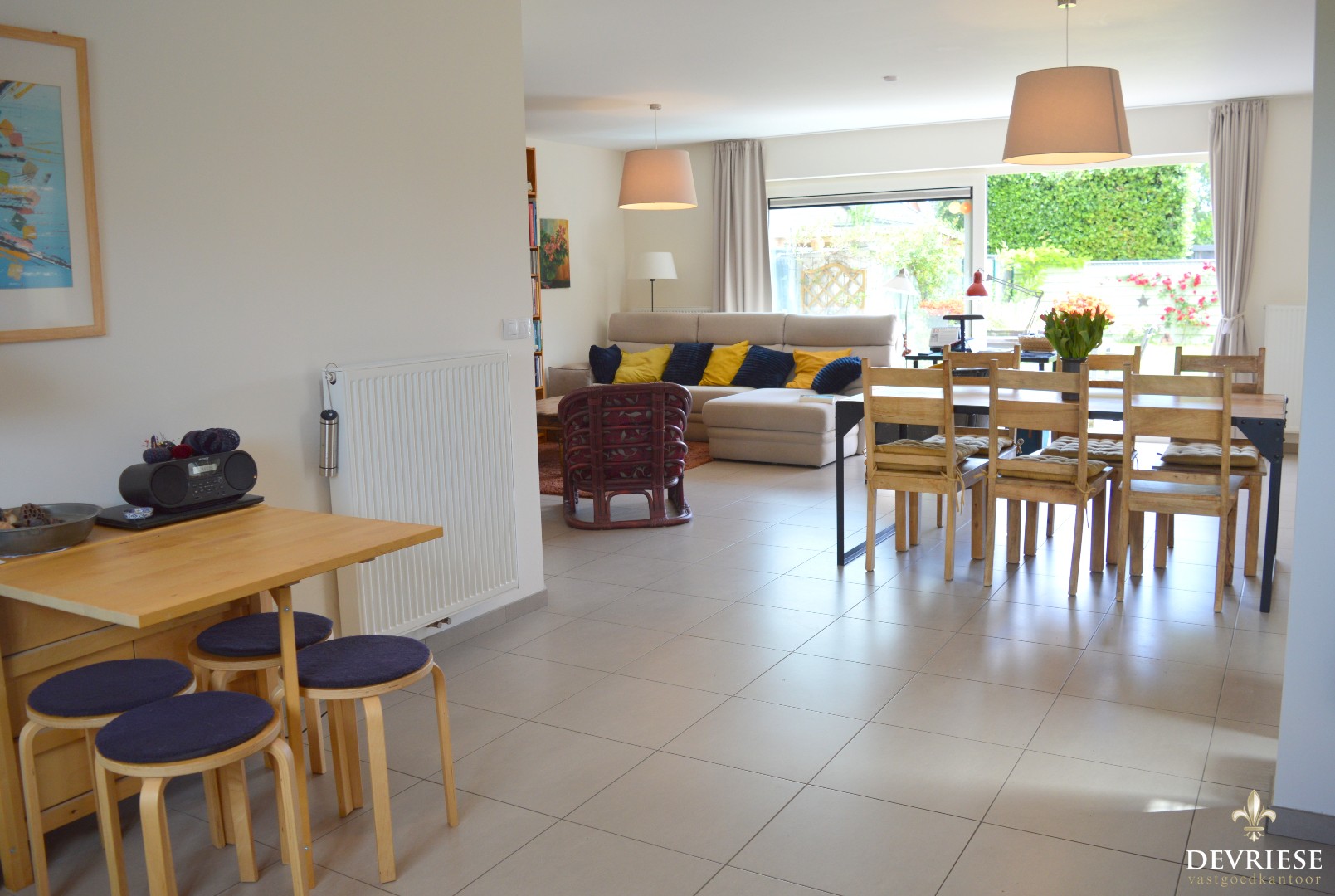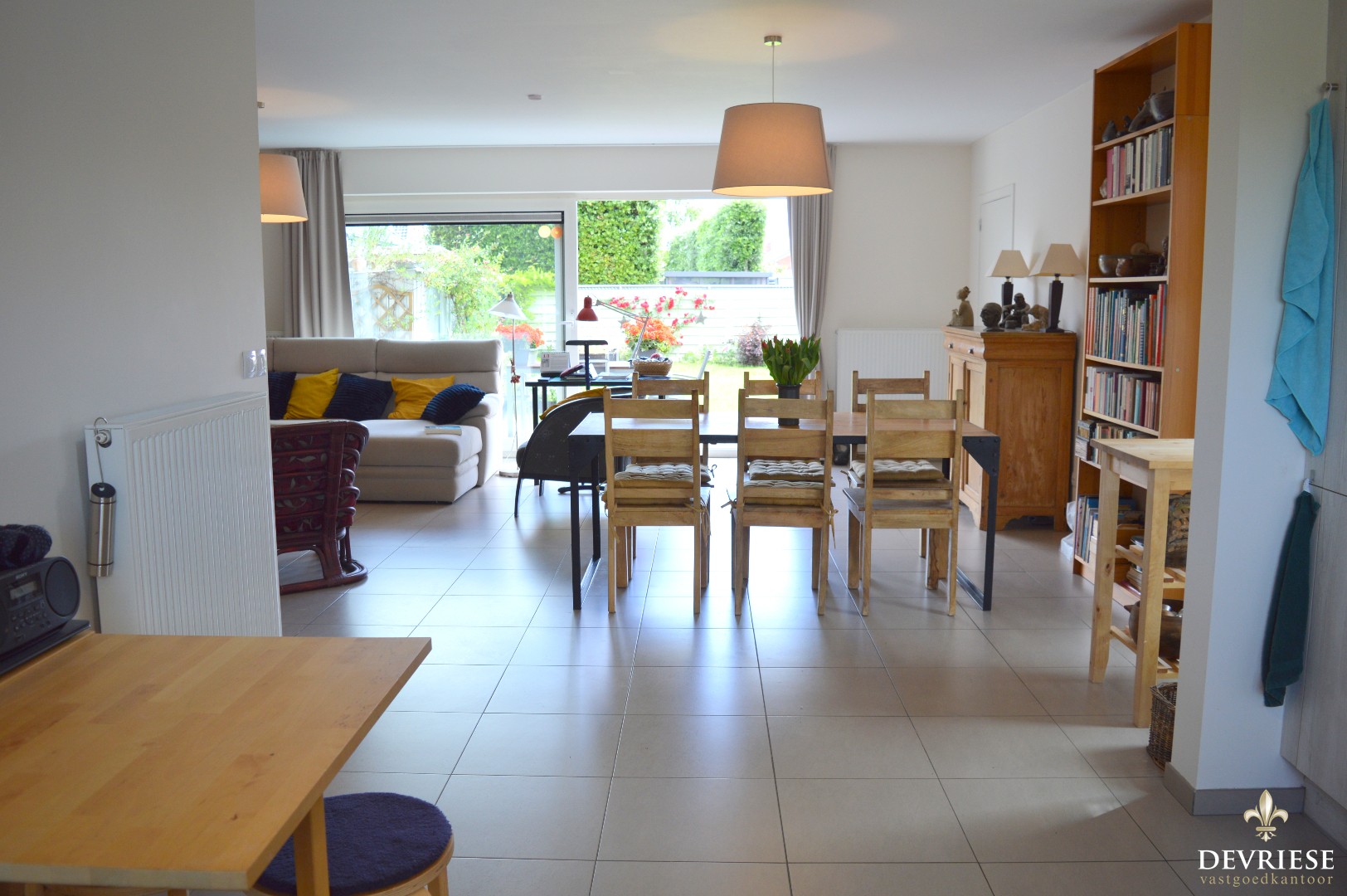 Aparte inkomhal met gastentoilet, ruime leefruimte met open keuken en toegang tot de garage met oprit. De living geniet enorm veel lichtinval. Van hieruit is er zicht op de leuke achtertuin met terras.