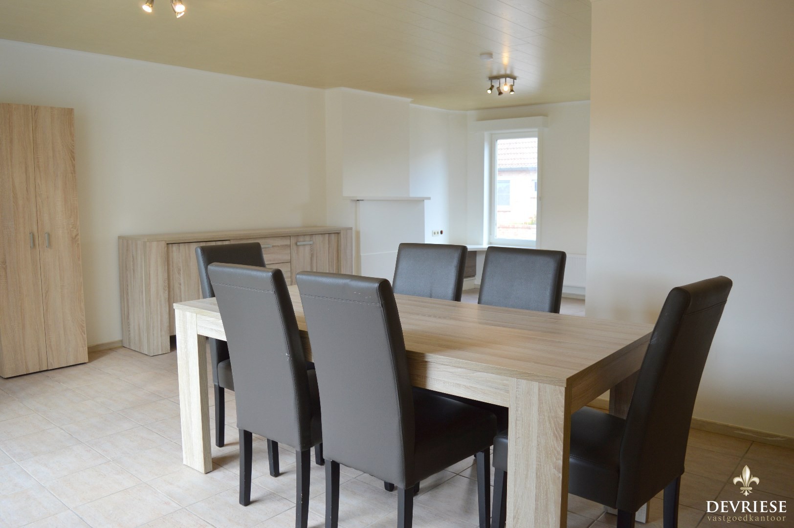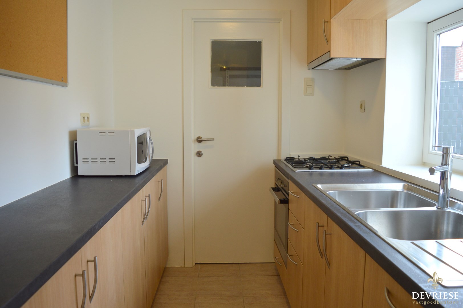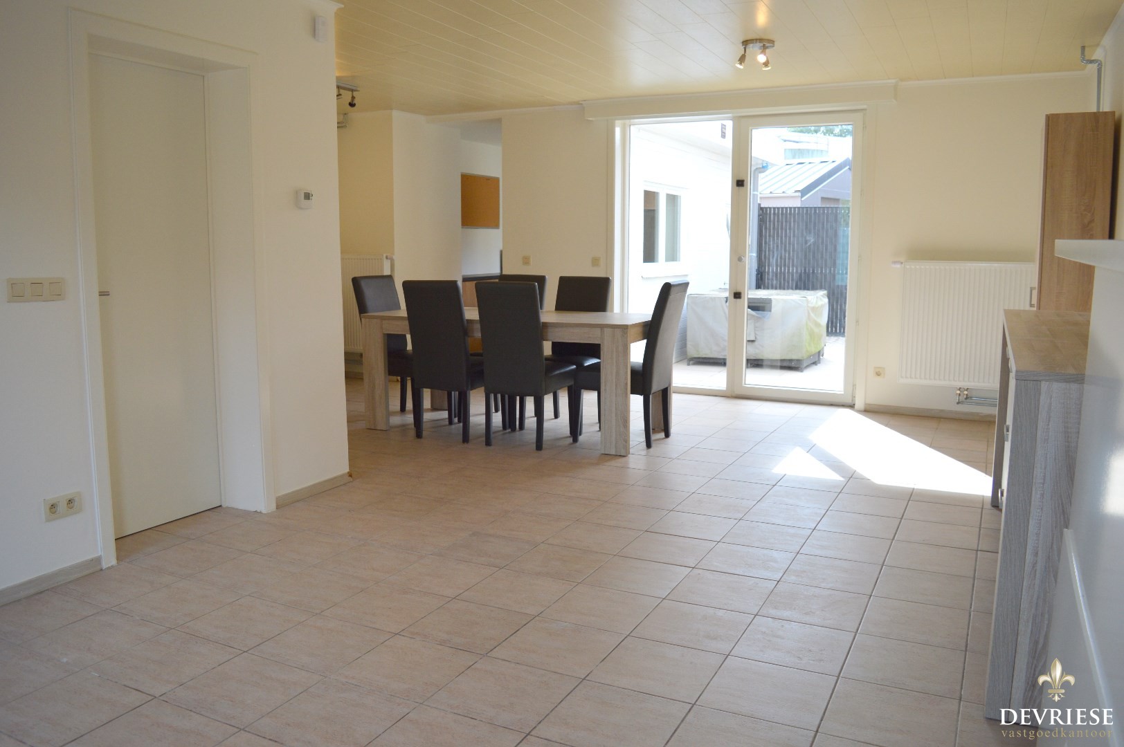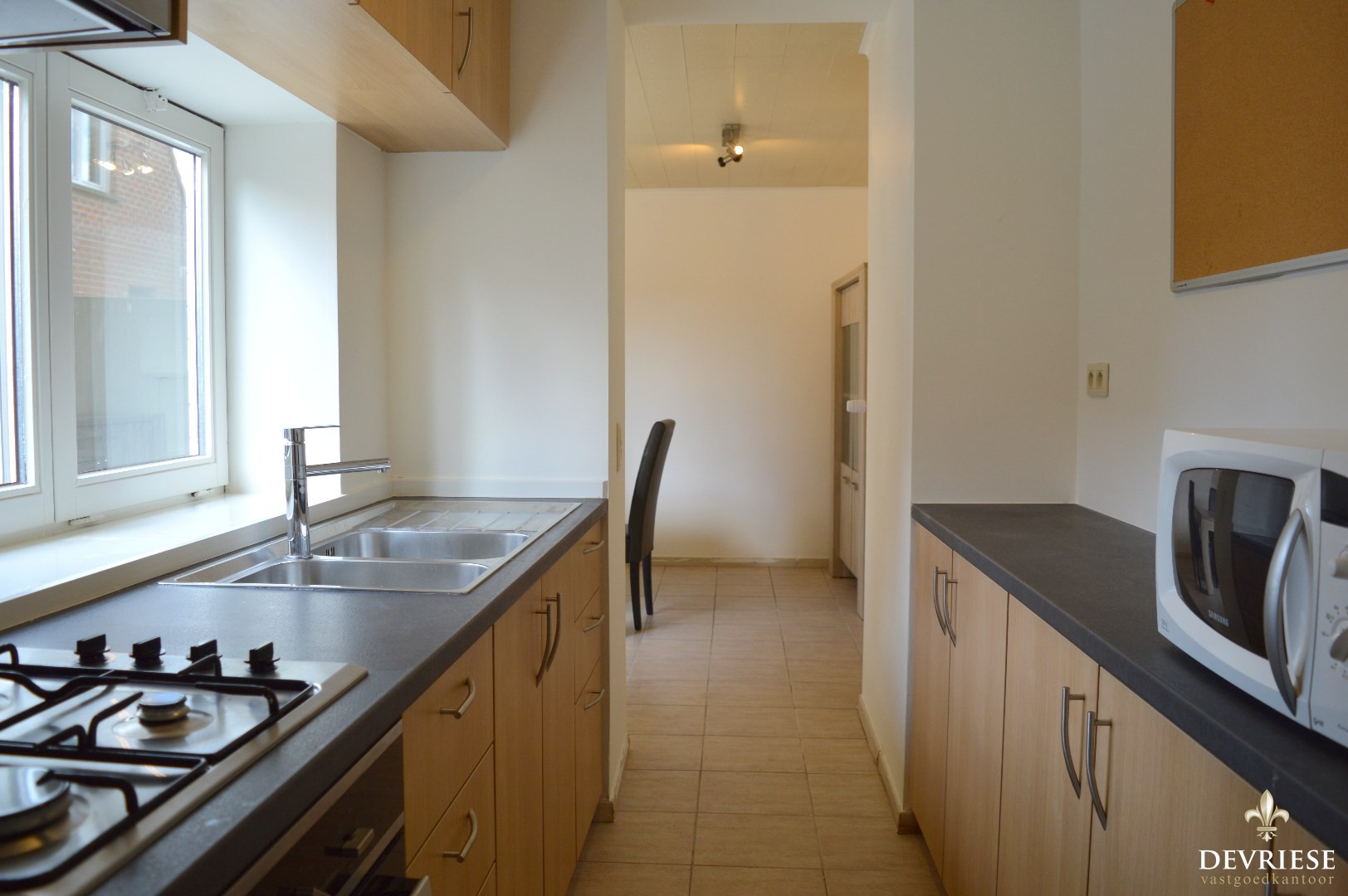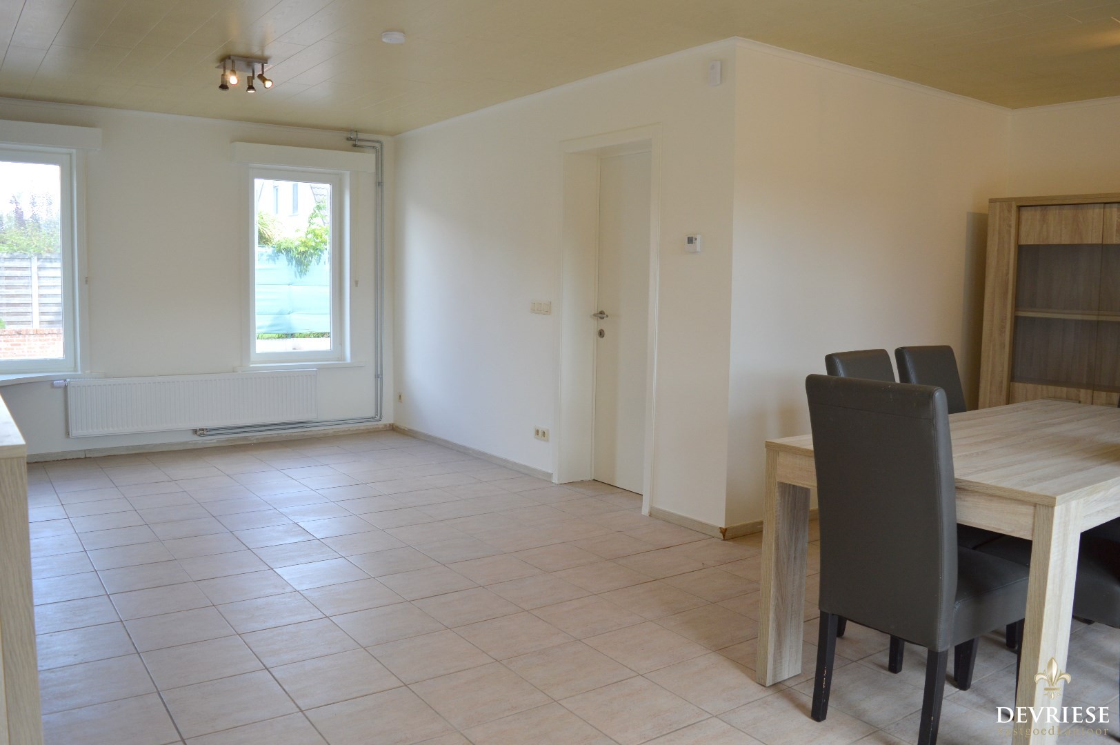 Inkomhal, apart toilet, ruime leefruimte met aansluitend de keuken (uitgerust met gasvuur, oven en microgolf). Naast de keuken is er een handige opbergruimte waar er aansluiting is voor de wasmachine, grote frigo en toegang tot de zuidwest georiënteerde tuin.