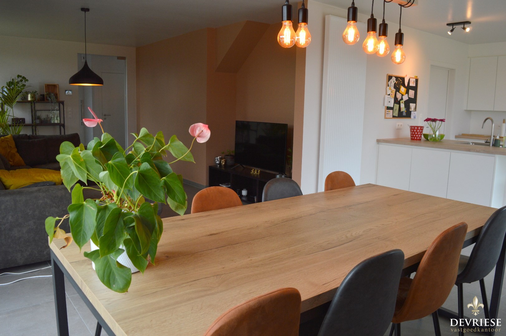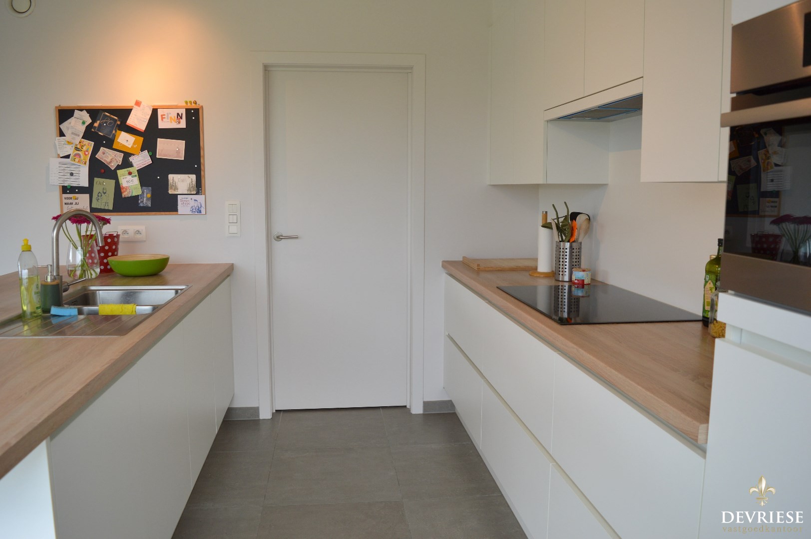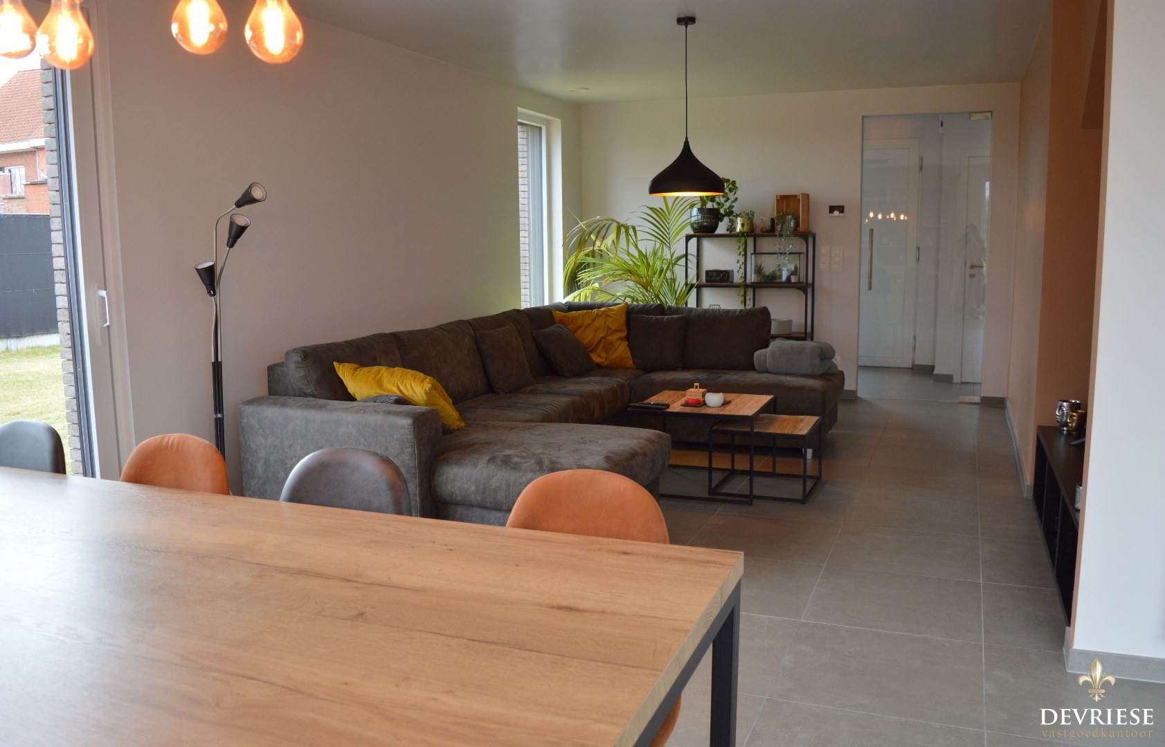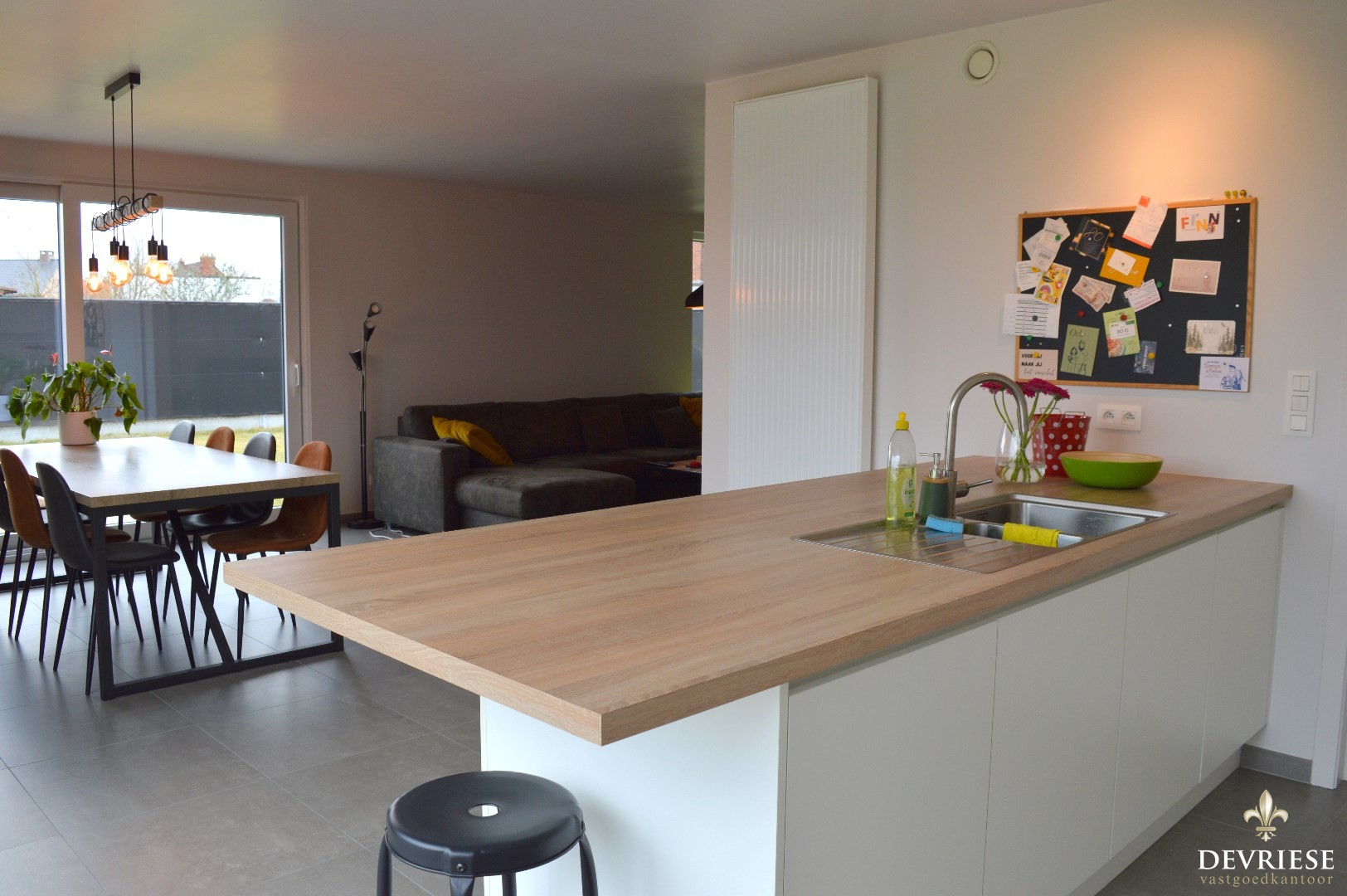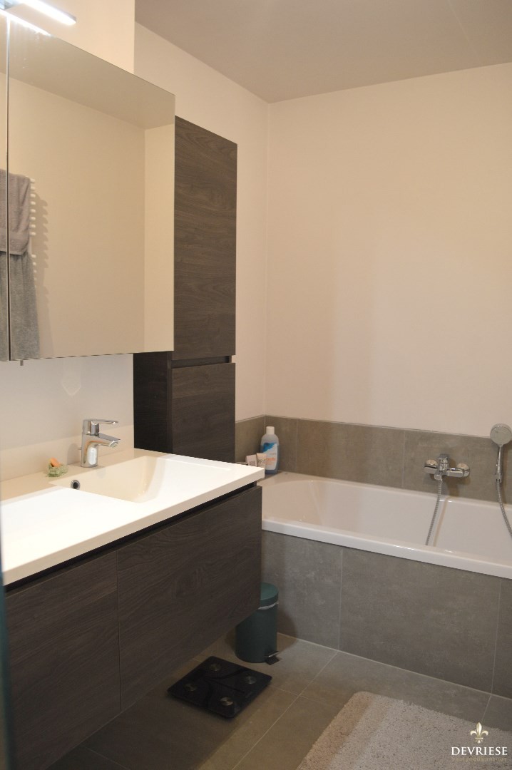 Binnenin de woning is er de ruime inkomhal met apart gastentoilet, lichtrijke leefruimte met open keuken die volledig uitgerust is (inbouwfrigo, combi oven, vaatwasmachine en inductie kookplaat).