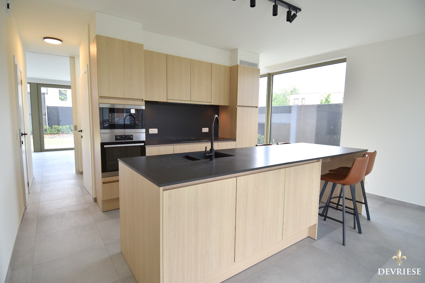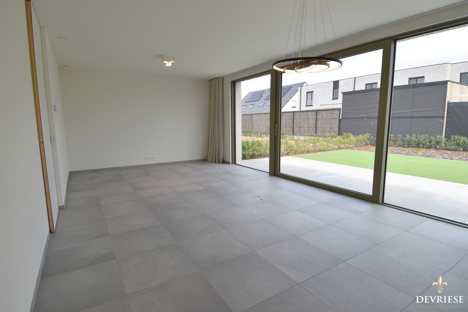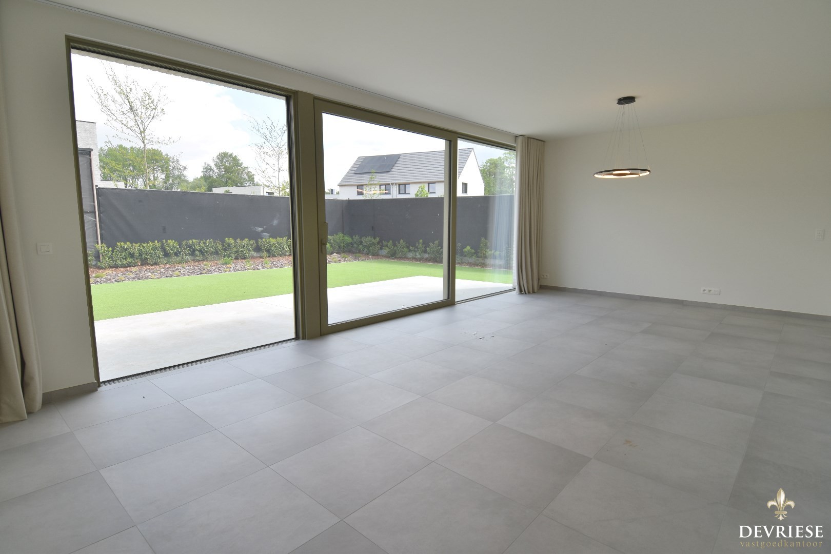 Lichtrijke en open inkomhal, ruime leefruimte met zicht op de tuin.