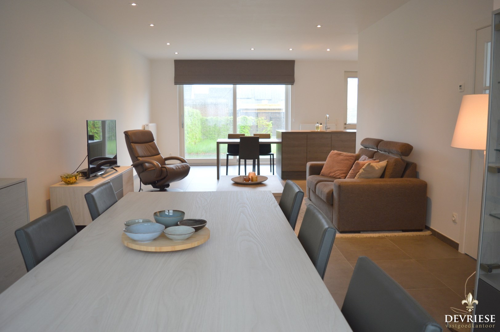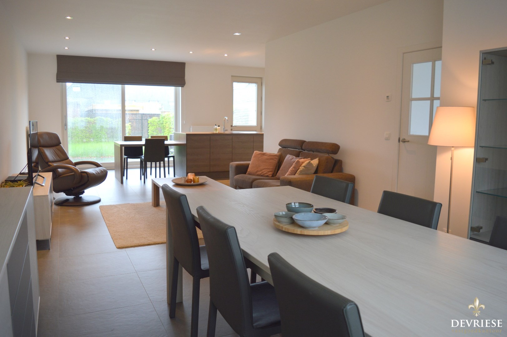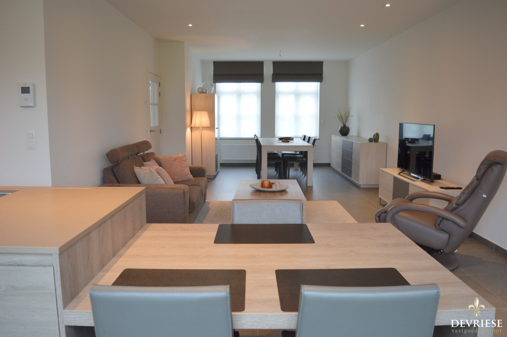 Inkomhal, apart toilet, ruime leefruimte met aansluitend de ruime open keuken die volledig is ingericht met toestellen (inbouwfrigo, inductiekookplaat en oven).