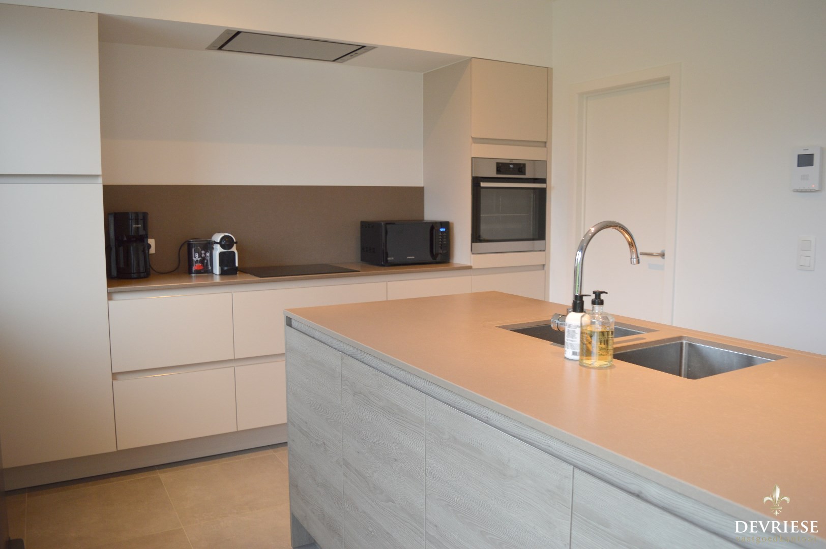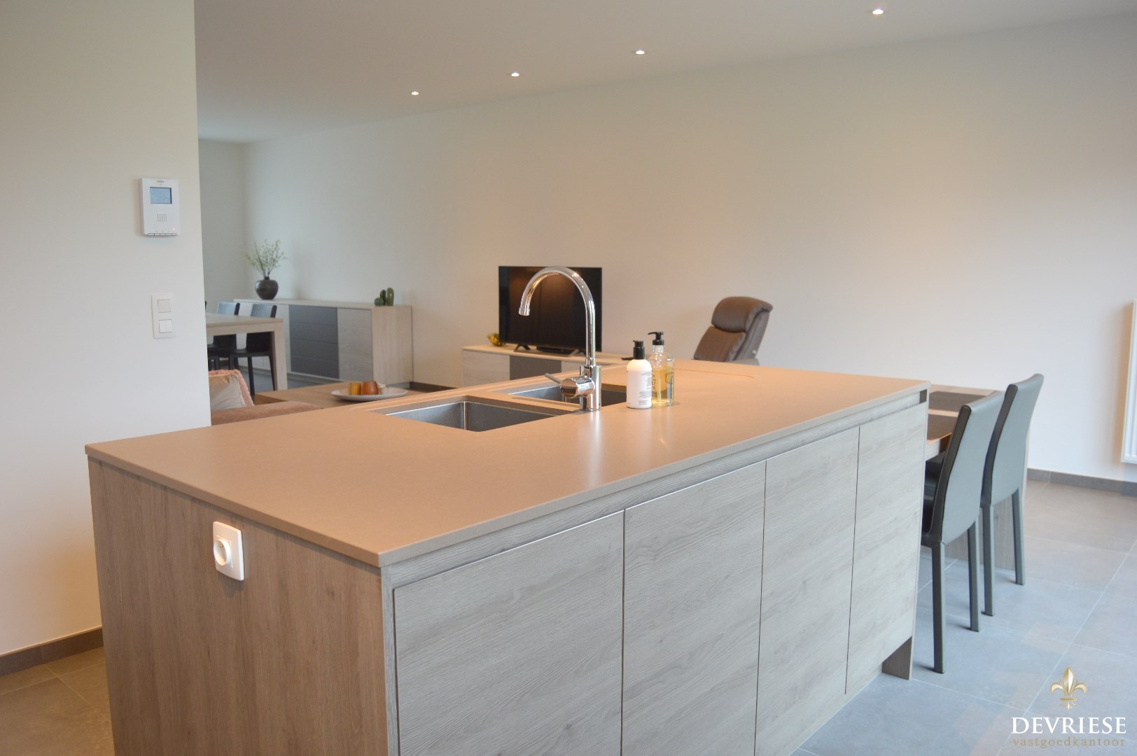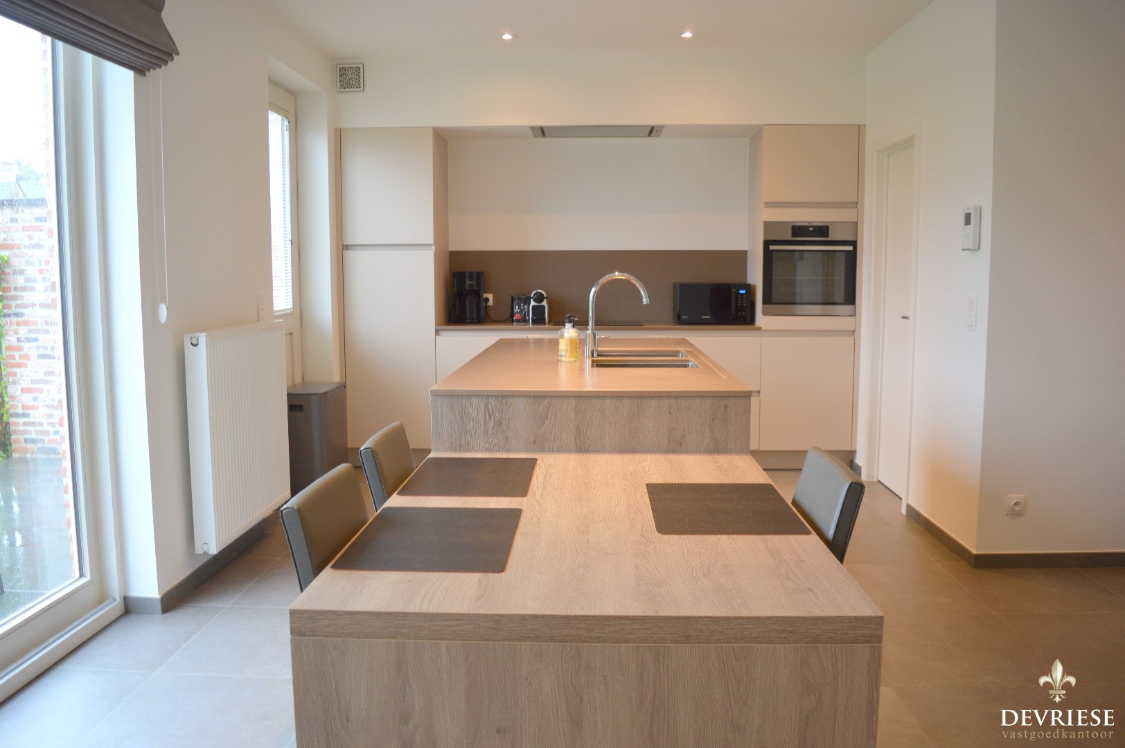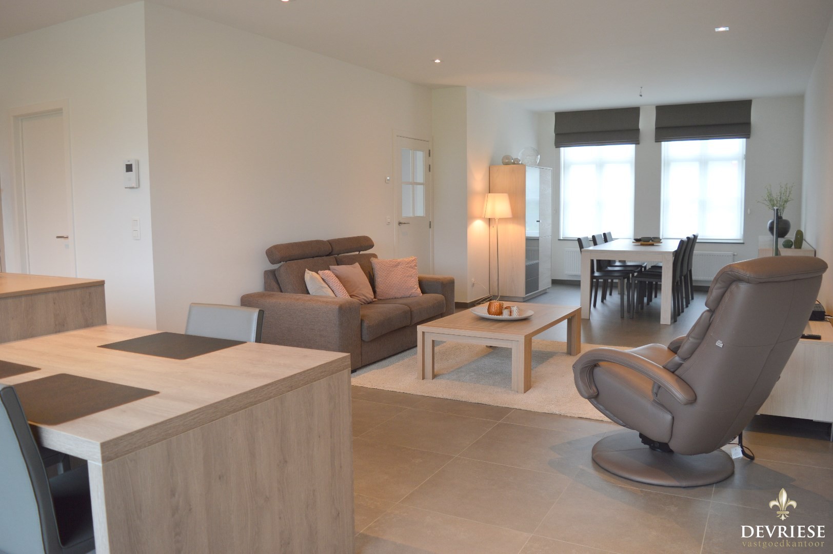 Inkomhal, apart toilet, ruime leefruimte met aansluitend de ruime open keuken die volledig is ingericht met toestellen (inbouwfrigo, inductiekookplaat en oven).