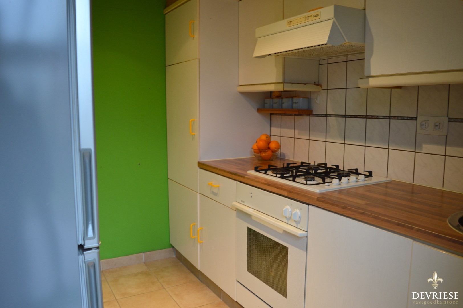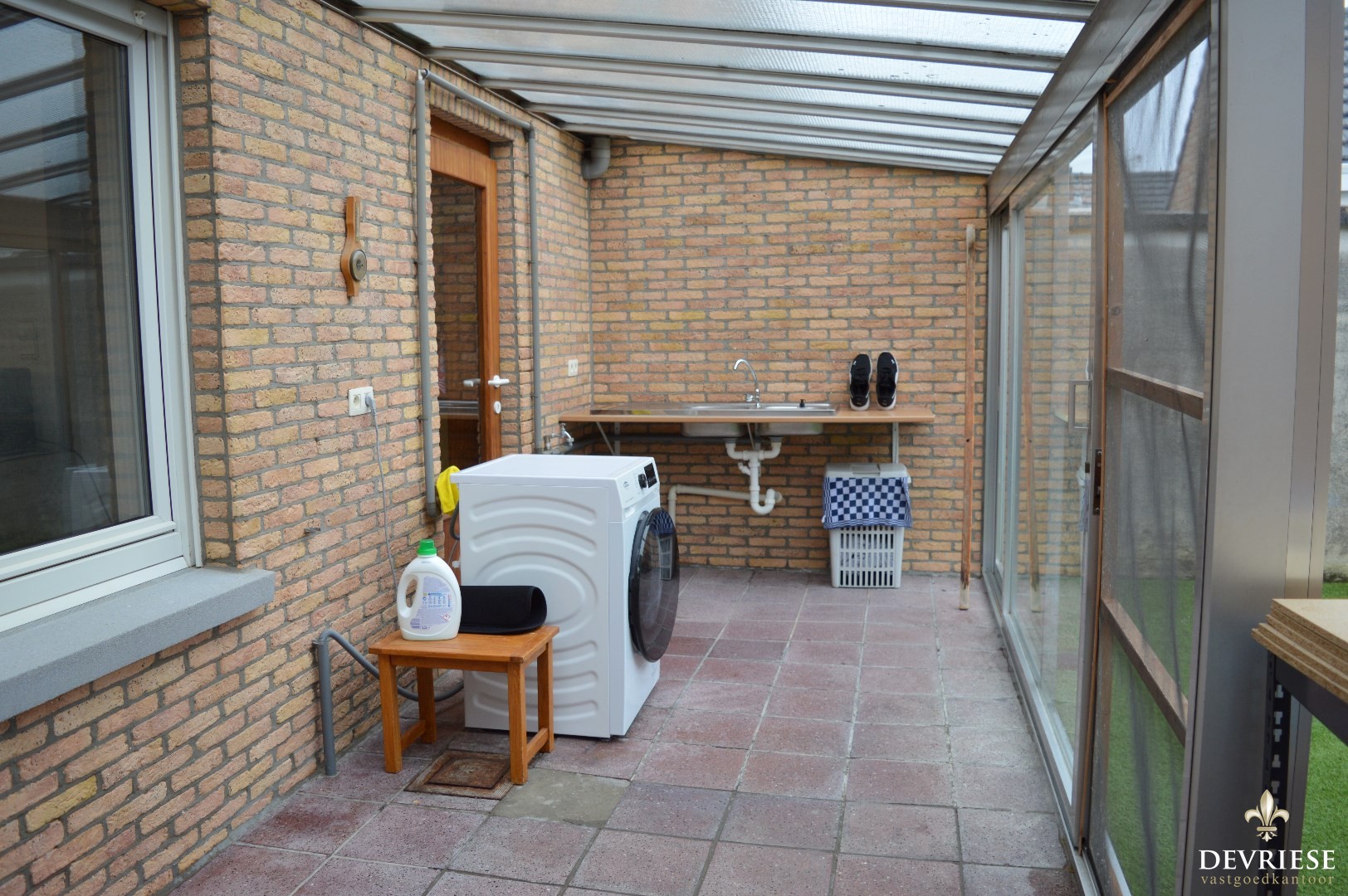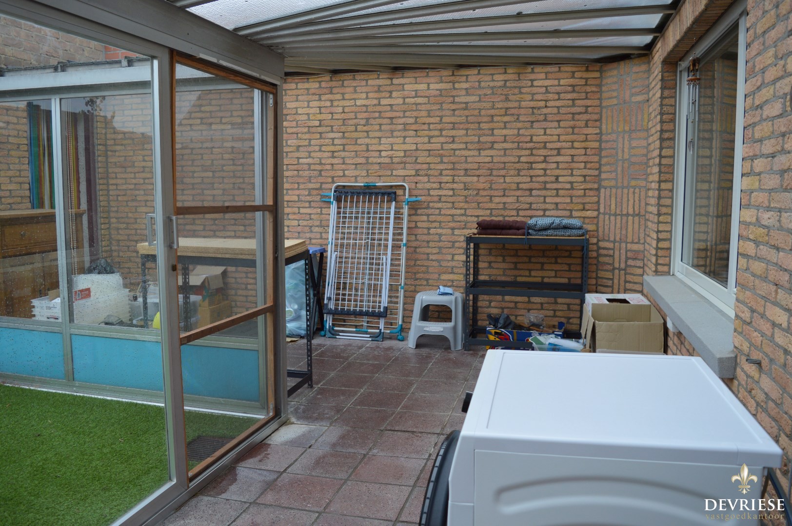 Op het gelijkvloers bevindt zich de inkomhal die beschikt over een toilet met aanliggend de praktische kelder. Leefruimte met aansluitend de keuken (voorzien van oven en gasvuur). Via de keuken is er toegang tot de veranda (aansluiting voor de wasmachine is voorzien). Aansluitend is er ook nog een handige berging.