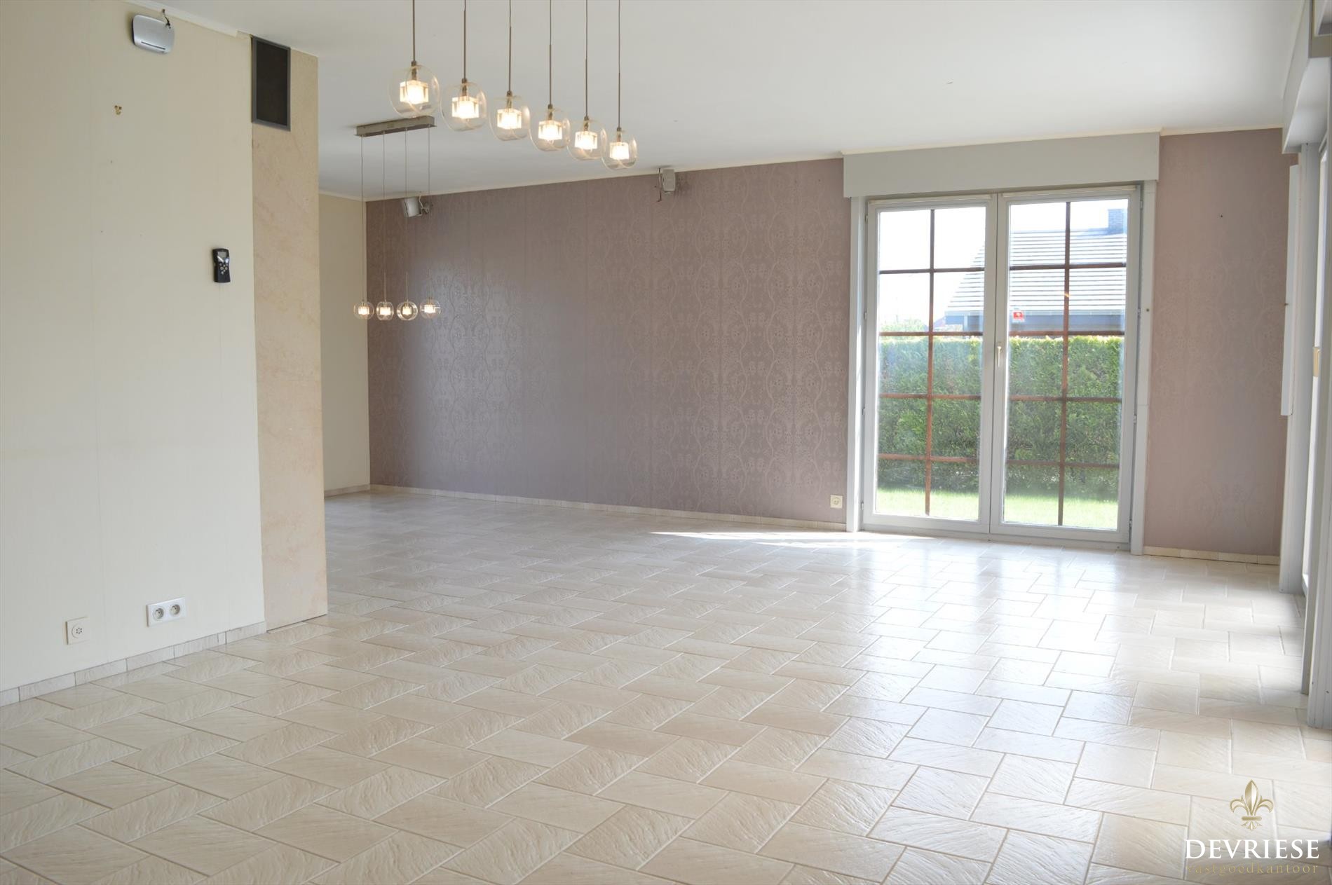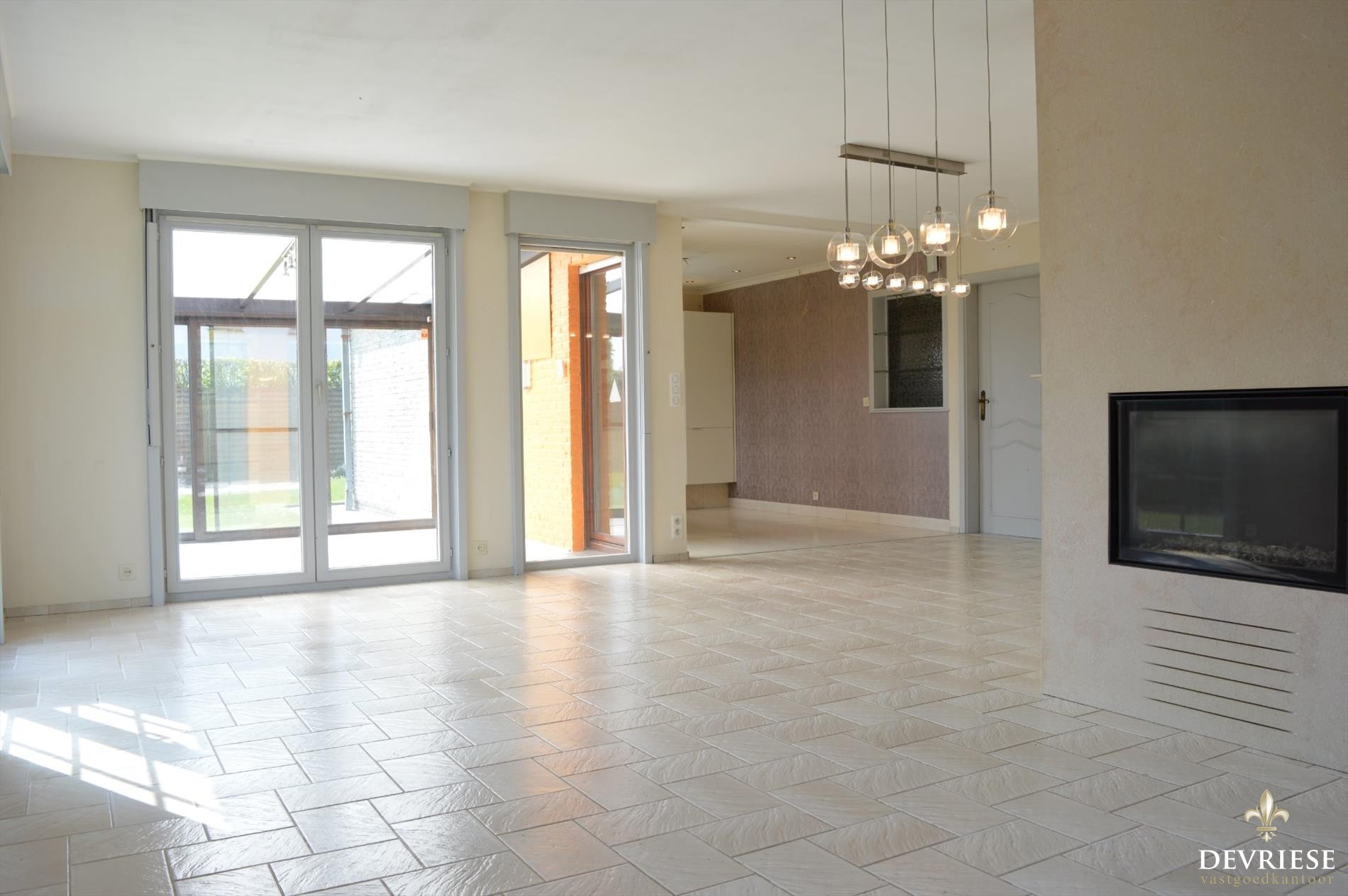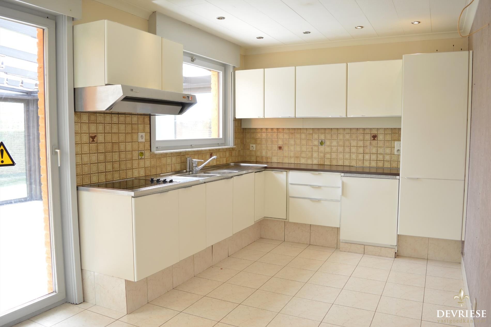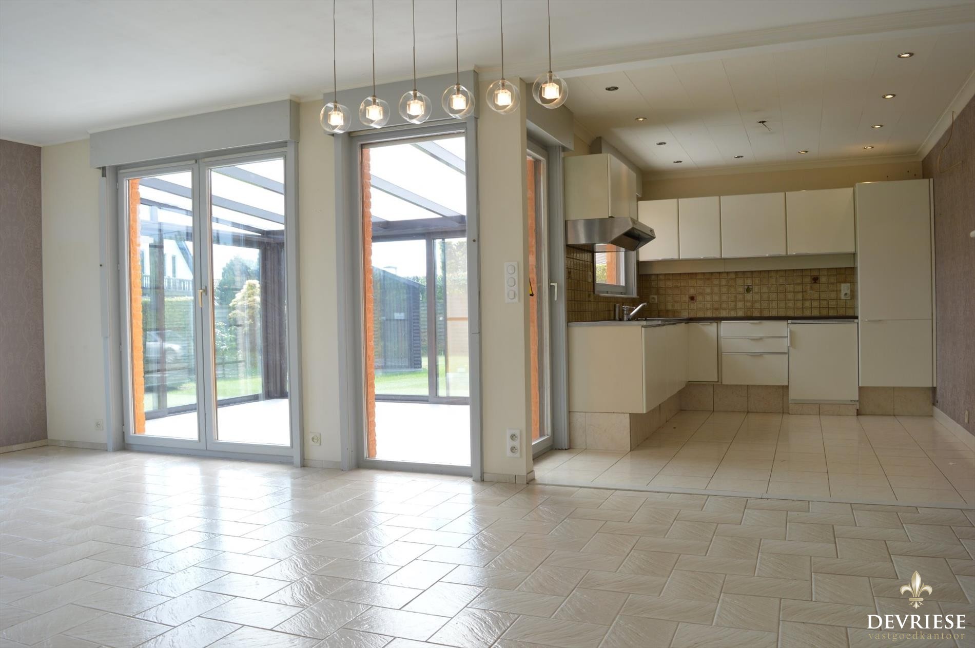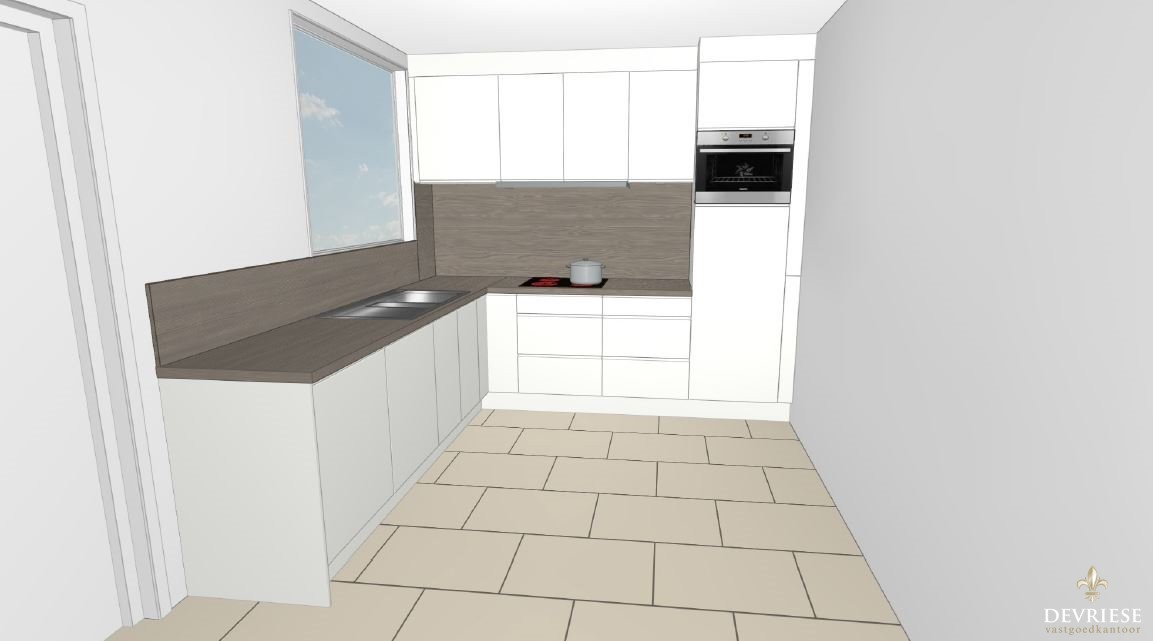 Bij het binnenkomen in de ruime hal, komt u in de ruime leefruimte die heel wat lichtinval geniet door de vele raampartijen. U heeft rondom zicht op de tuin en het groen. Vanuit de living is er toegang tot de open keuken en de veranda die uitkijkt op de achtertuin. De huidige keuken wordt nog volledig vernieuwd zoals te zien op de 3D afbeelding.