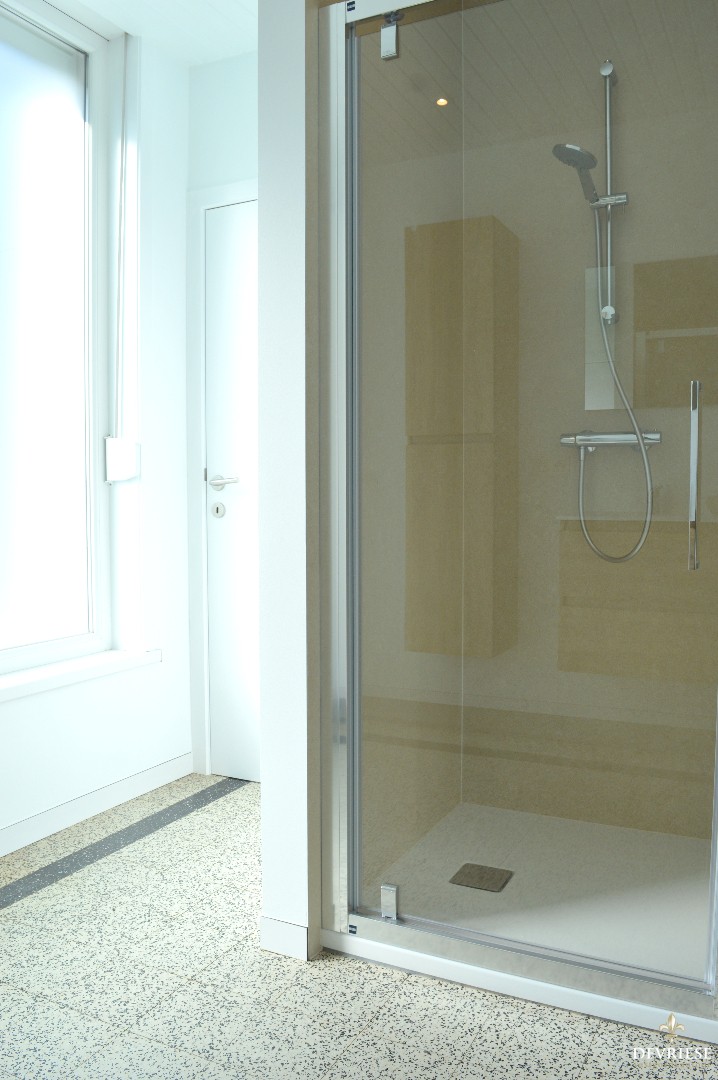 Op het gelijkvloers een ruime en lichtrijke leefruimte met een open keuken ingericht met toestellen, een badkamer met douche en lavabo en daarenboven nog een kelder die dienst doet als extra bergruimte. Achteraan de woning is nog een extra bergruimte voorzien met een tweede toilet en douche.