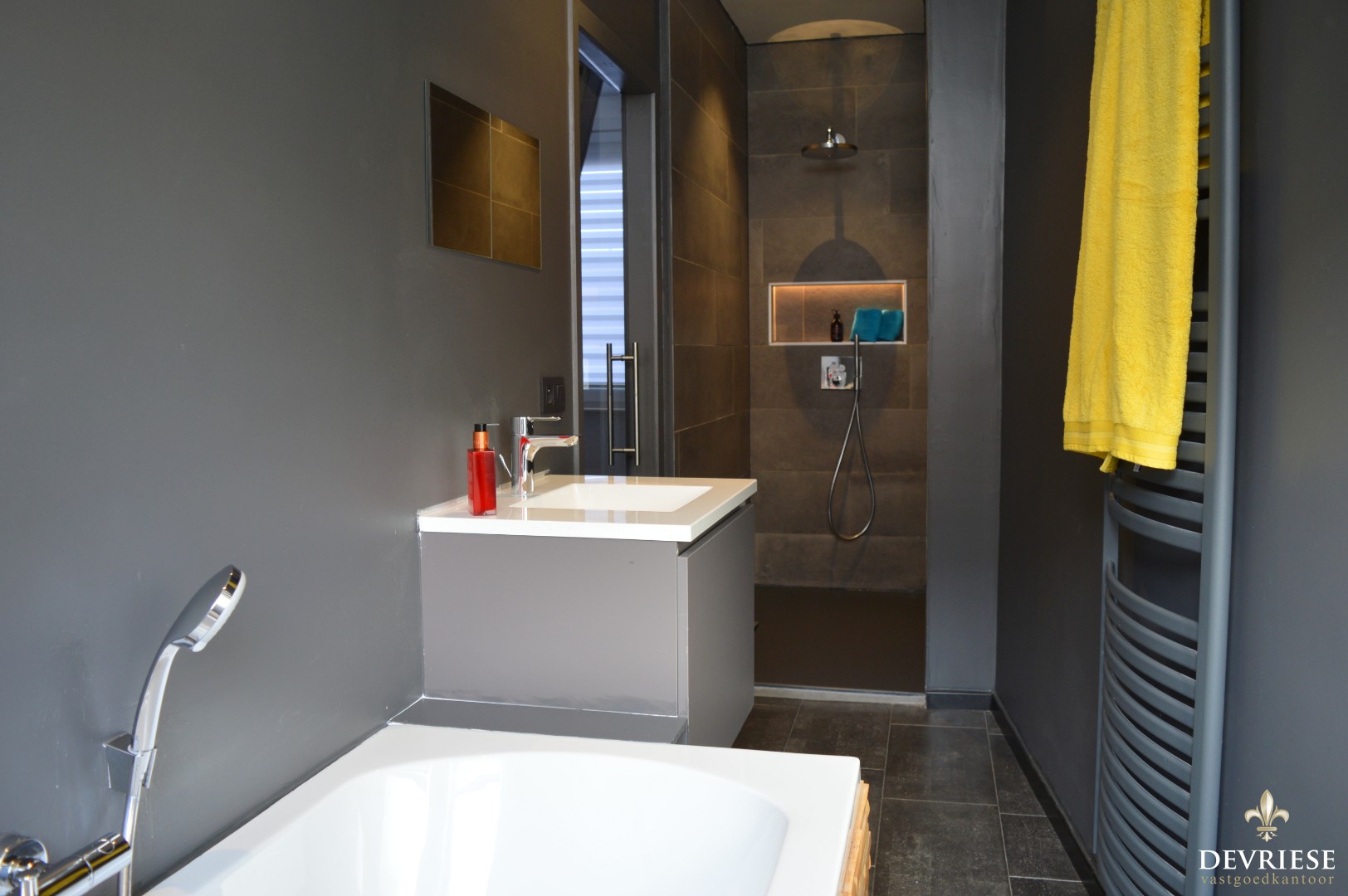 Op de eerste verdieping is er een toilet, de badkamer voorzien van zowel inloopdouche als bad en 1 lavabo.