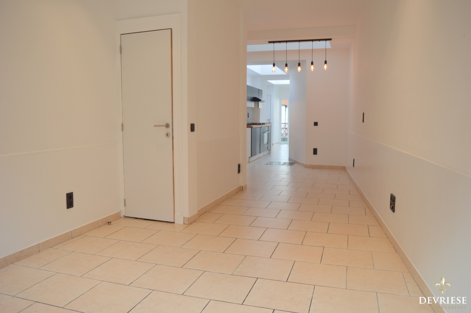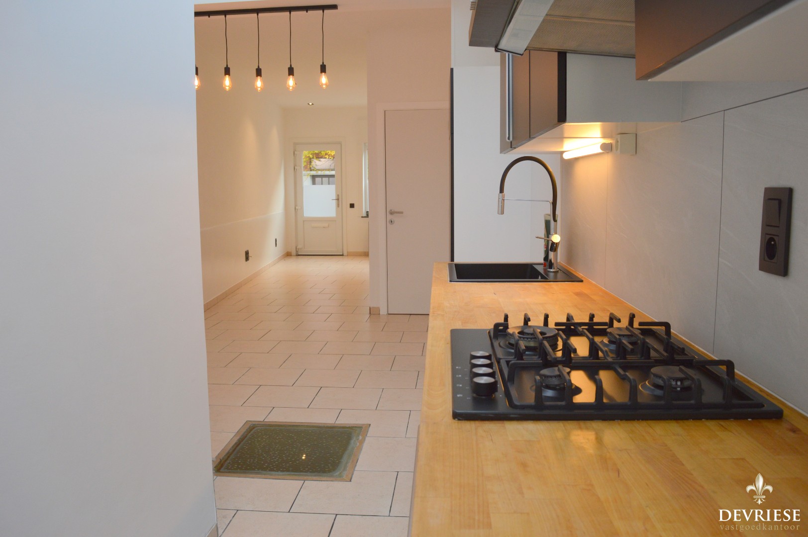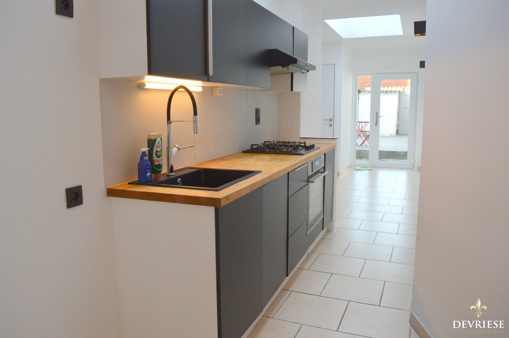 Leefruimte met aansluitend de open keuken die voorzien is van een oven en gasvuur. Daarnaast is er aansluiting voorzien voor de wasmachine. Via de keuken is er toegang tot de tuin met achteraan een uitweg.