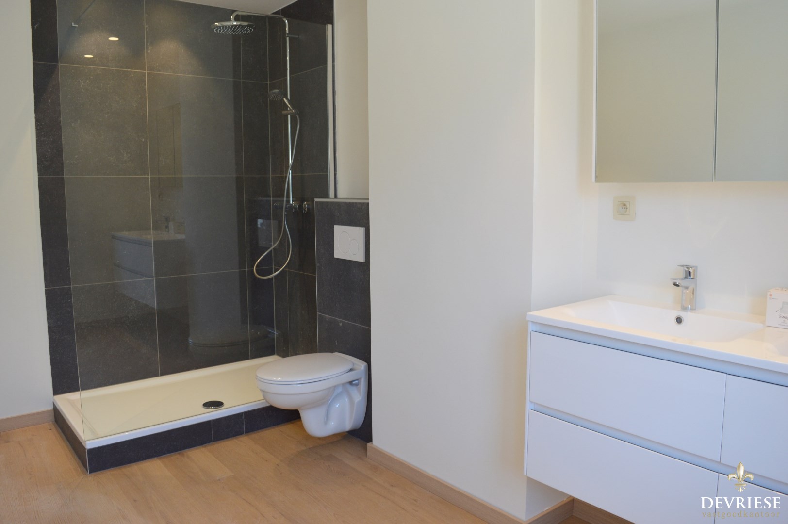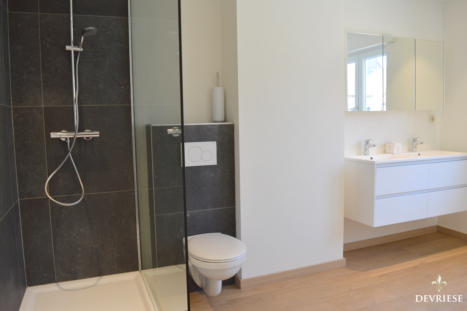Op de eerste verdieping zijn er 2 slaapkamers. Daarnaast is er een badkamer met dubbele lavabo, douche en 2e toilet.