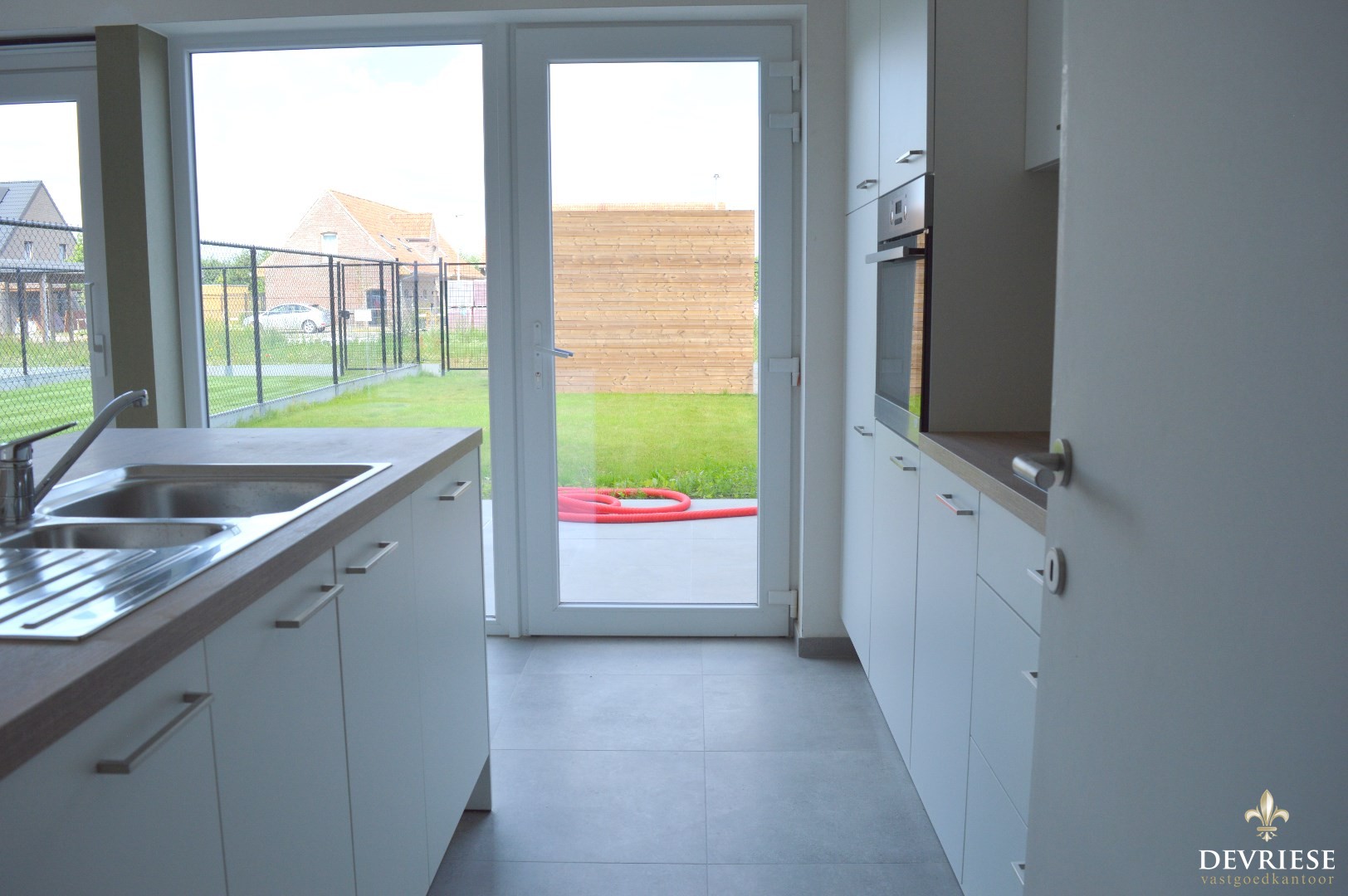 Inkomhal met gastentoilet, lichtrijke leefruimte met aansluitend de open keuken (voorzien van inbouwfrigo, kookplaat, oven en vaatwasmachine). Via zowel de keuken als de living is er toegang tot de onderhoudsvriendelijke tuin waarbij een tuinhuis voorzien is voor het plaatsen van fietsen (elektrische fietsen kunnen hier opgeladen worden). Achteraan de tuin is er een uitweg, met daarnaast een parkeerplaats voor de woning.