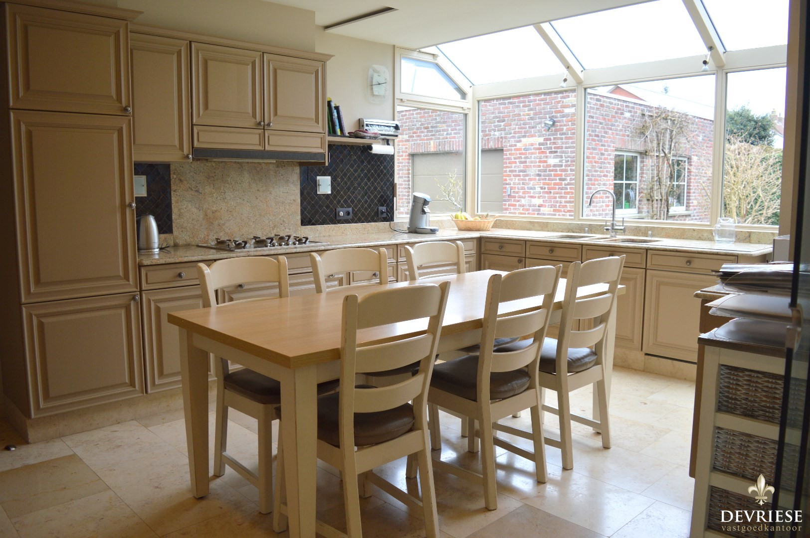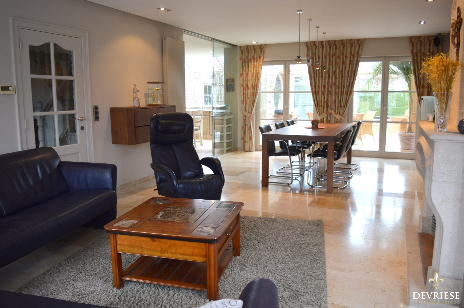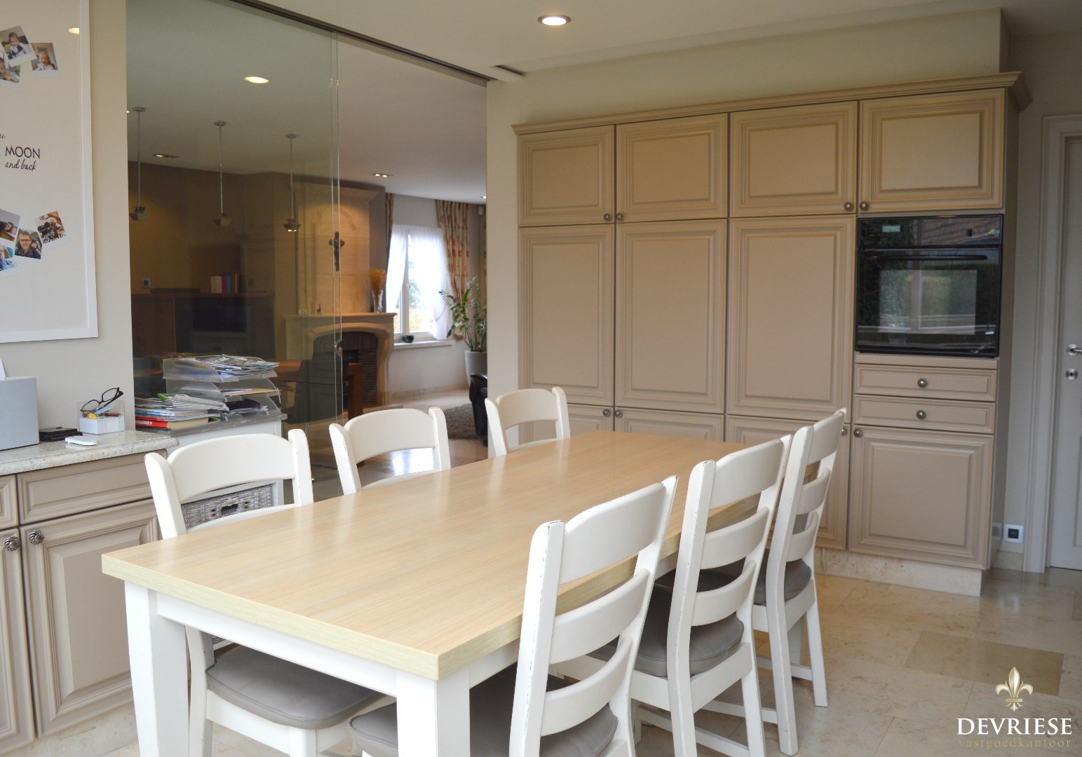 Ruime inkomhal met een apart toilet, lichtrijke leefruimte met aansluiten de keuken die volledig is uitgerust (oven, inbouwfrigo, gasvuur, vaatwasmachine).