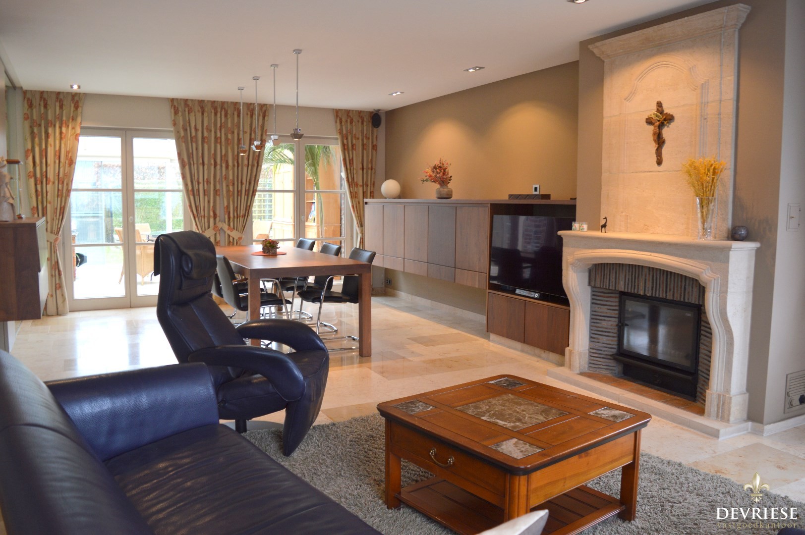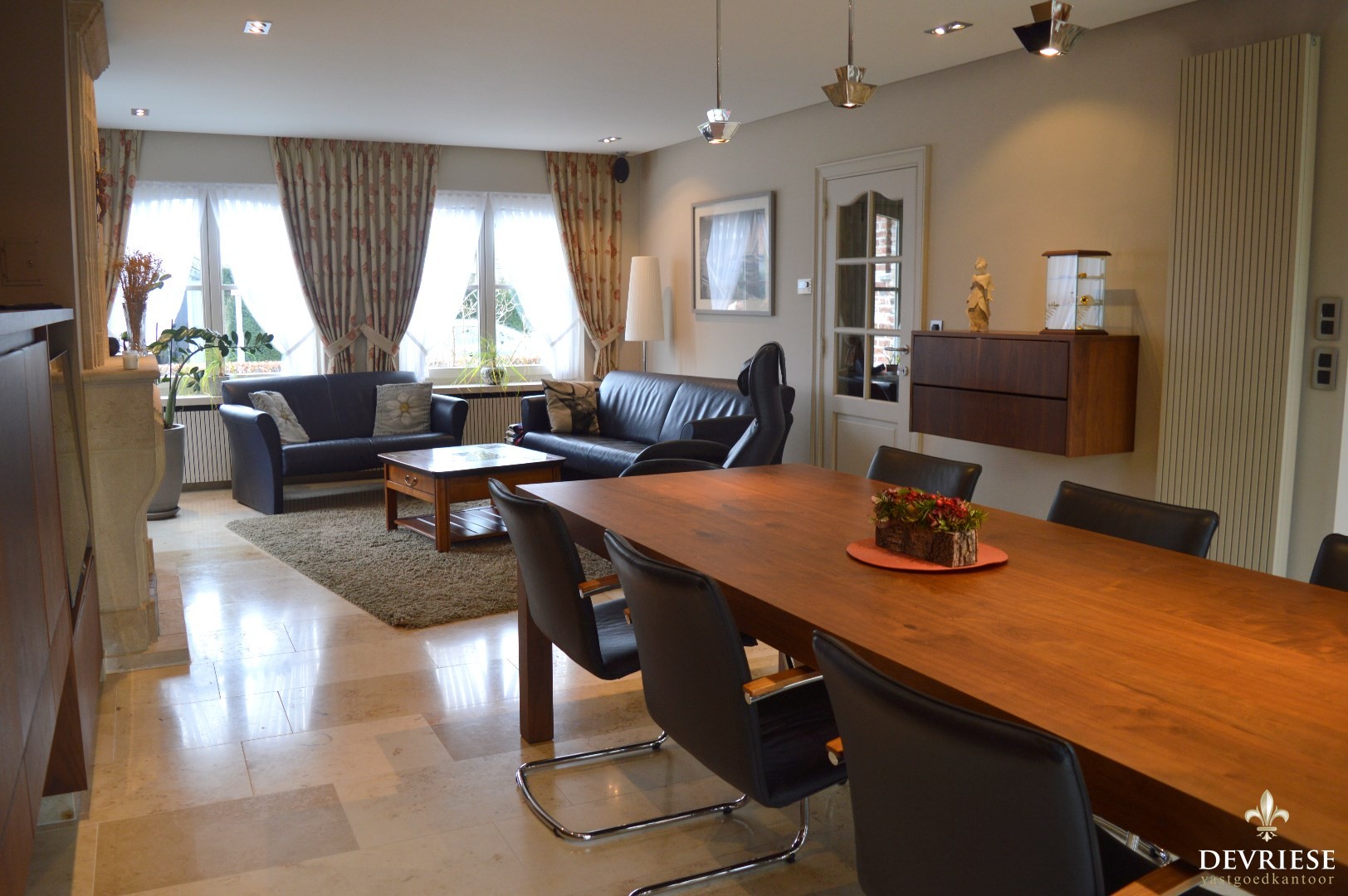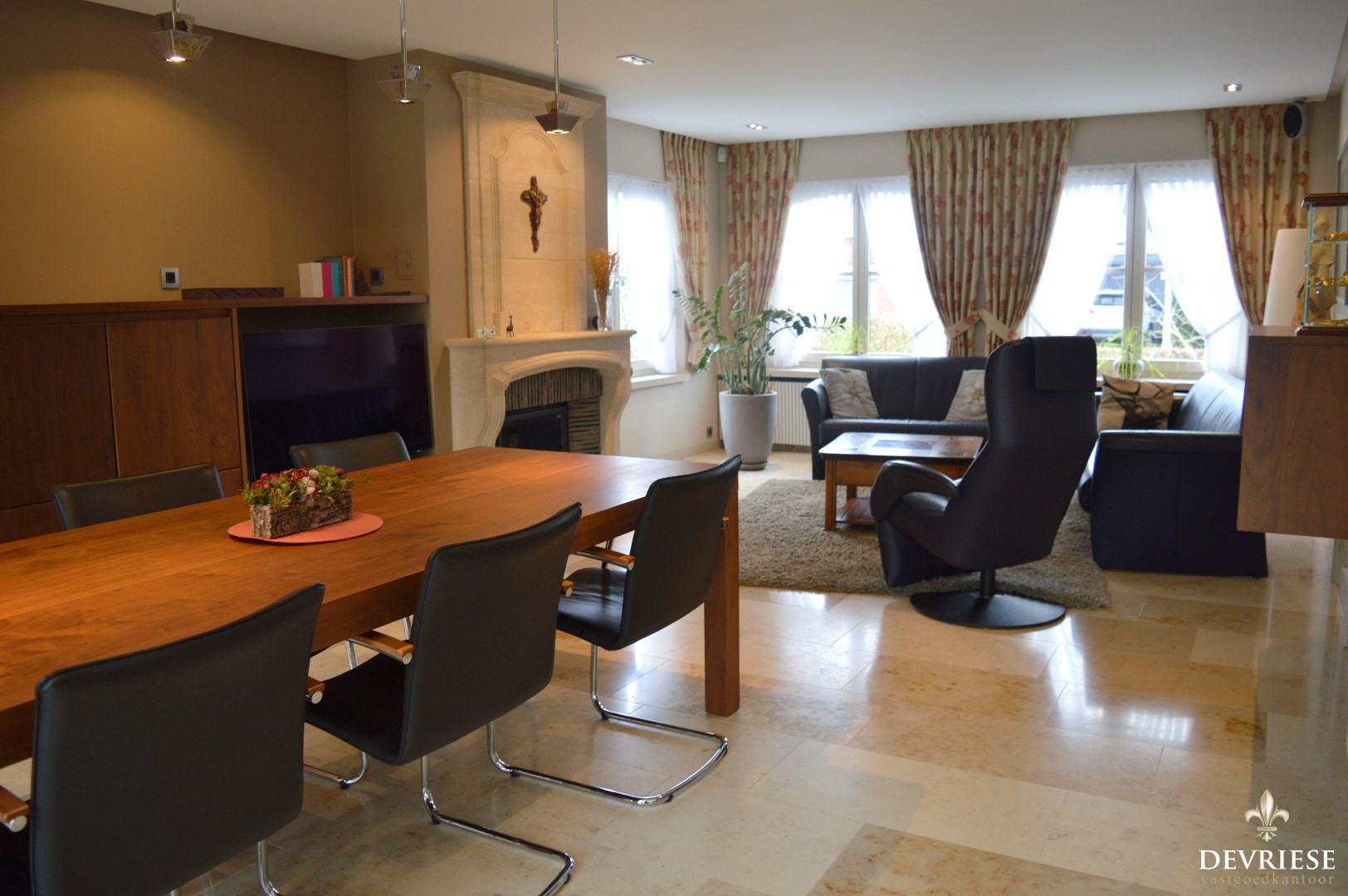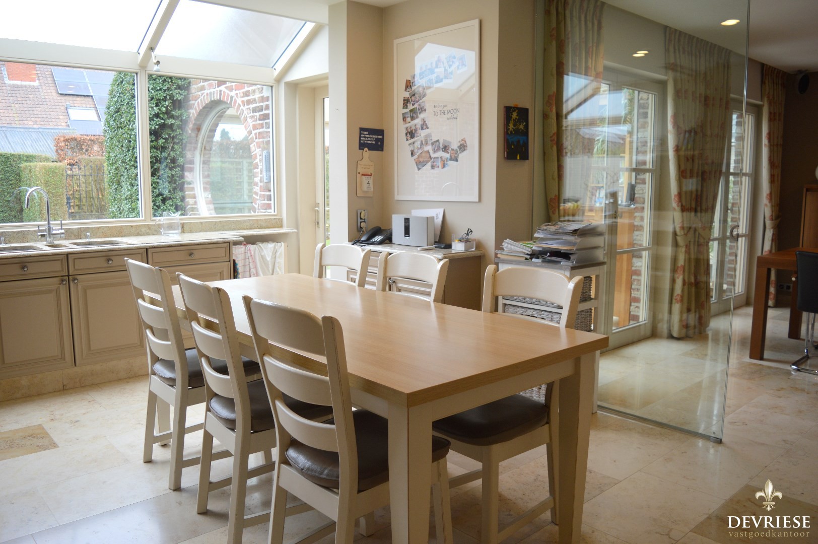 Ruime inkomhal met een apart toilet, lichtrijke leefruimte met aansluiten de keuken die volledig is uitgerust (oven, inbouwfrigo, gasvuur, vaatwasmachine).