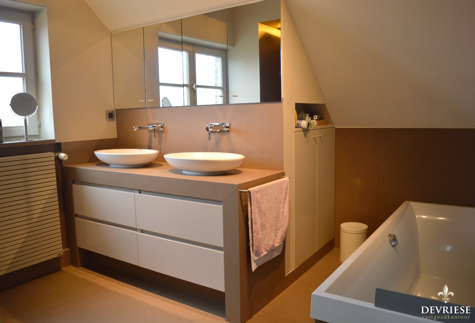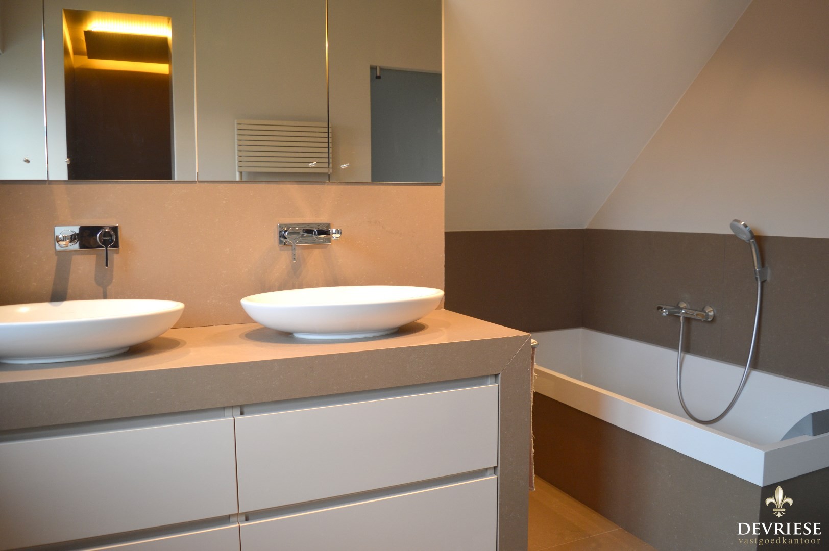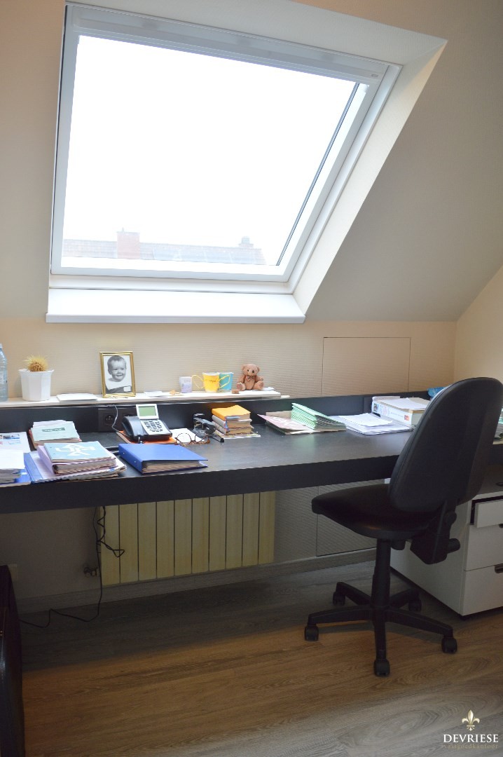 Op de eerste verdieping zijn er 3 slaapkamers, een bureau, ruime badkamer met zowel bad als douche en dubbele lavabo en aansluitend een dressing.