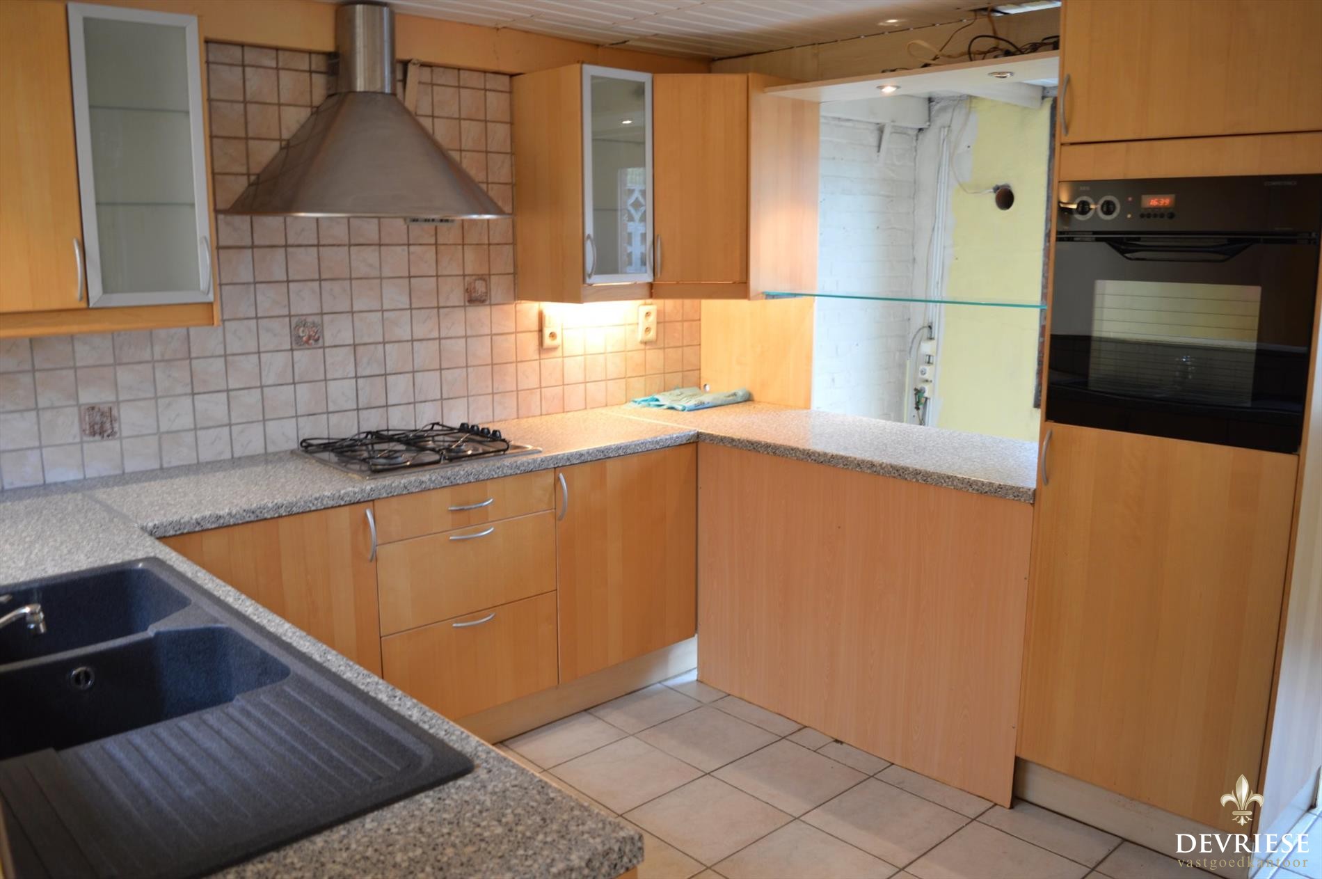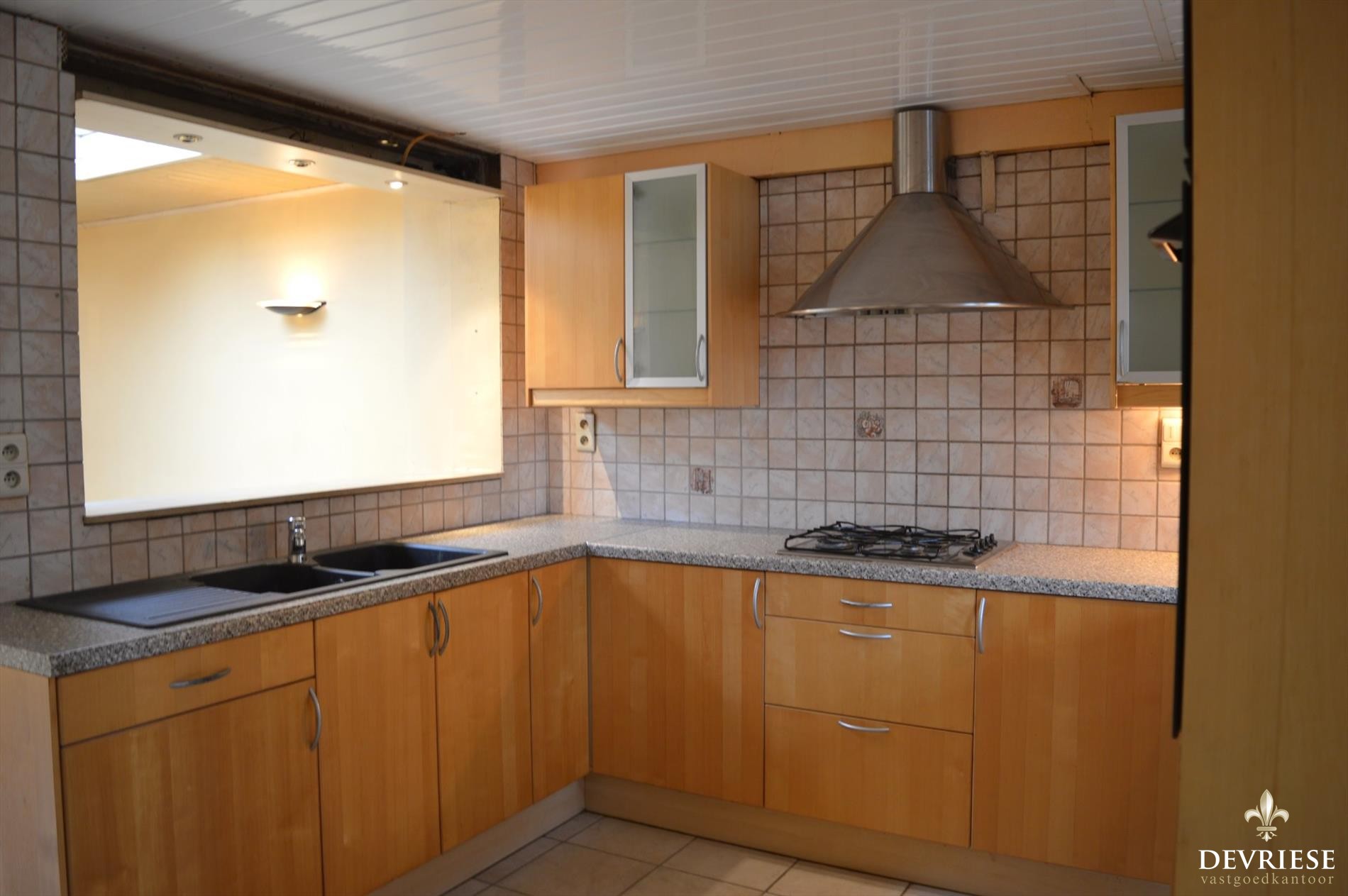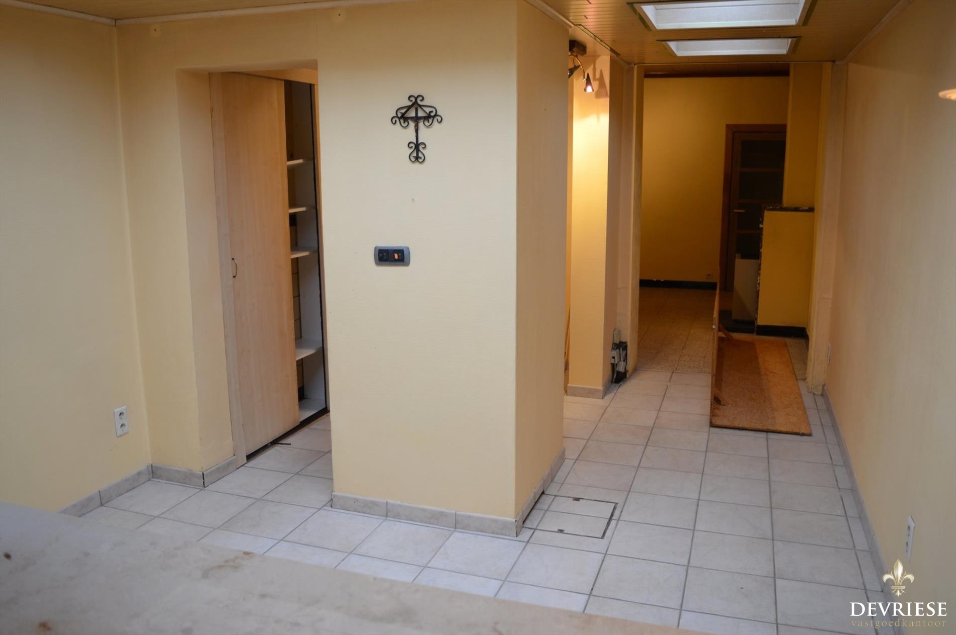 Bij het binnenkomen is er een inkomhal die als bergruimte kan gebruikt worden, met daarachter de leefruimte met open, volledig ingerichte keuken. Vanuit de keuken is er heel wat lichtinval en zicht op het tuintje. Naast de inkomhal is er een apart gastentoilet voorzien. Er is tevens een kelder die zorgt voor heel wat extra opbergplaats.