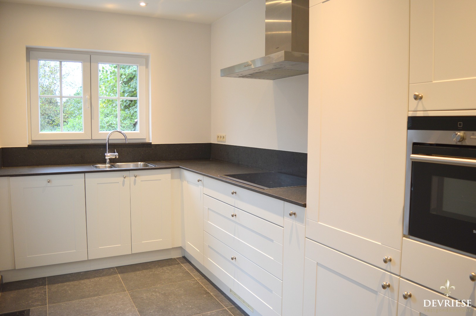 Inkom, living en aansluitend de keuken die volledig ingericht is met ingebouwde koelkast, vaatwasmachine, inductiekookplaat en combi oven. Via de keuken is er toegang tot het terras en de west georiënteerde tuin die bovendien achteraan toegang geeft aan de achterliggende straat.