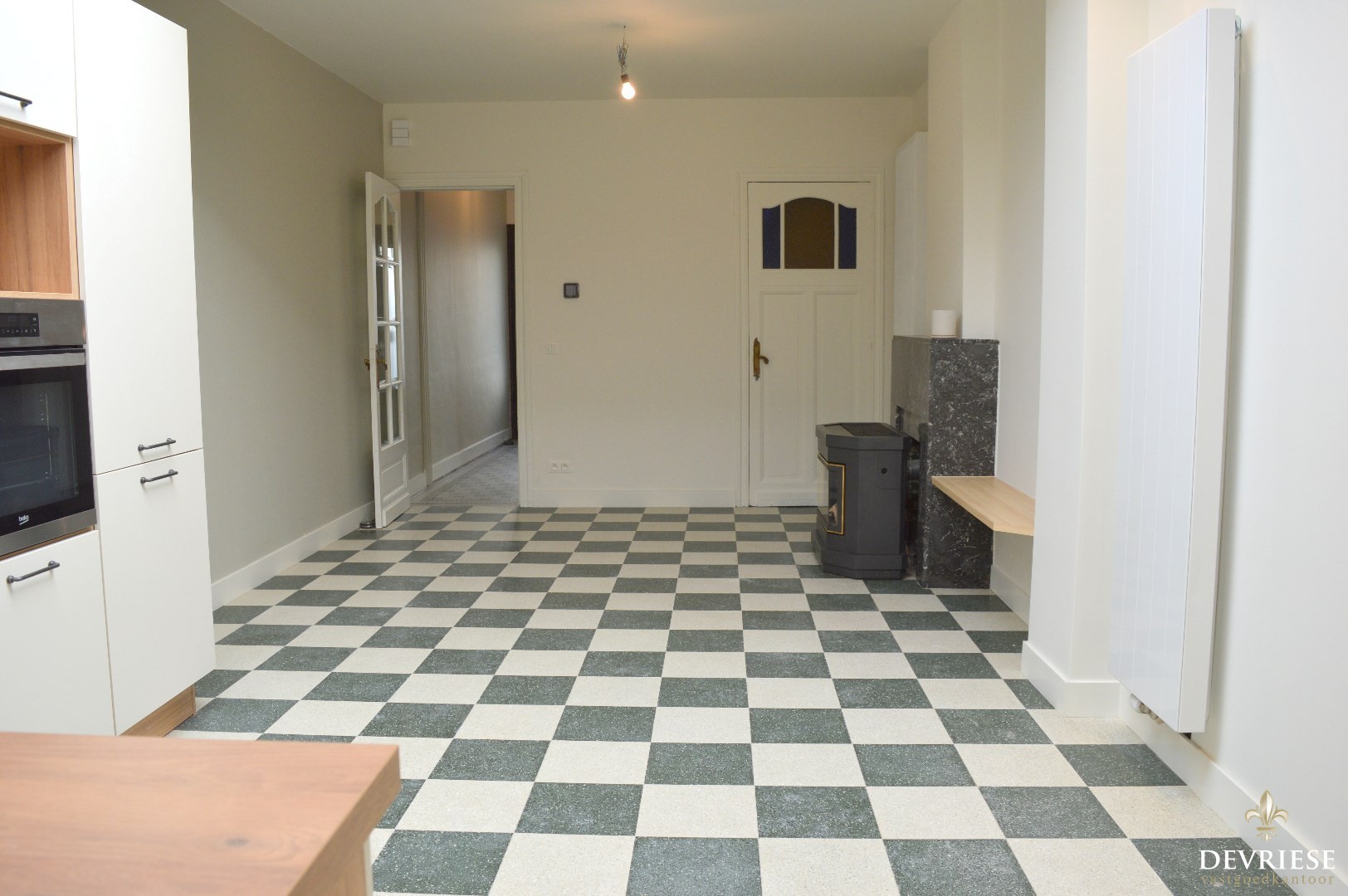 Inkomhal, bureauruimte, toilet, gezellige leefruimte met aansluitend de open keuken die volledig uitgerust is (inductiekookplaat, oven, vaatwasser, inbouwfrigo én -diepvries). Verder is er nog een ruime en droge kelder aanwezig.