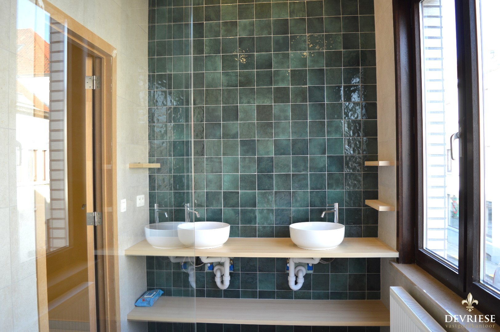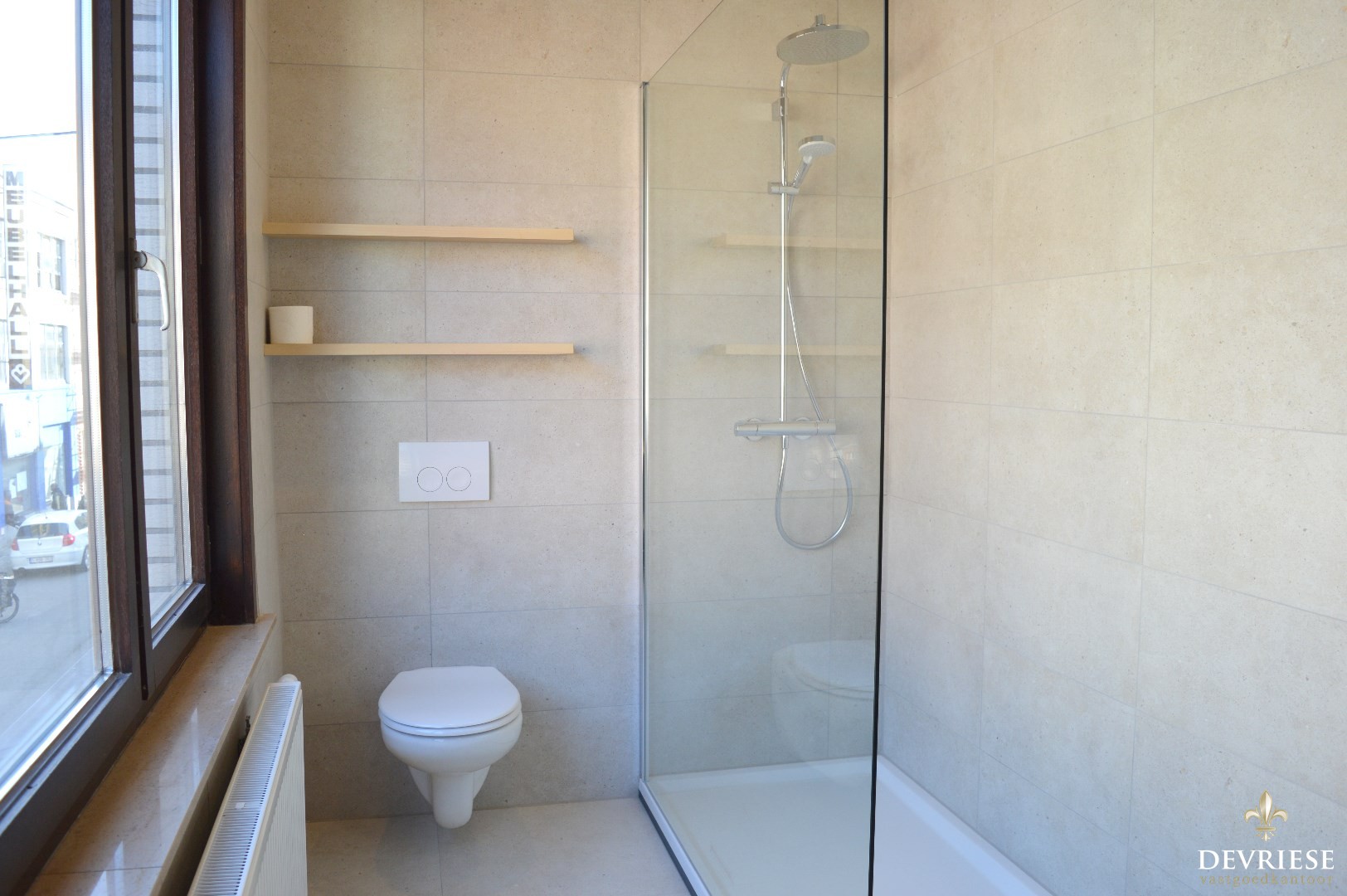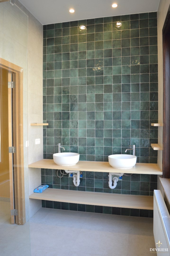 Op de eerste verdieping is er de eerste slaapkamer en de vernieuwde badkamer met douche, 2 lavabo's en toilet.