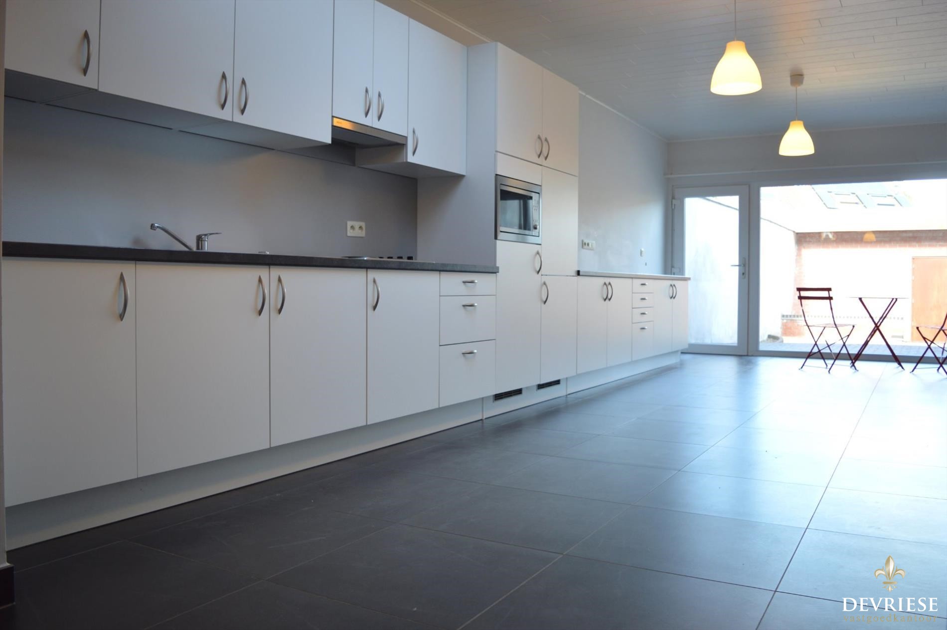 Op het gelijkvloers beschik je over een aparte inkom met aparte bureau- of bergruimte en toegang tot het aparte gastentoilet. Achteraan is er een zeer ruime en open keuken die overgaat in de leefrumte en met zicht op het achtertuintje. Als extra'tje is er een kelder aanwezig.