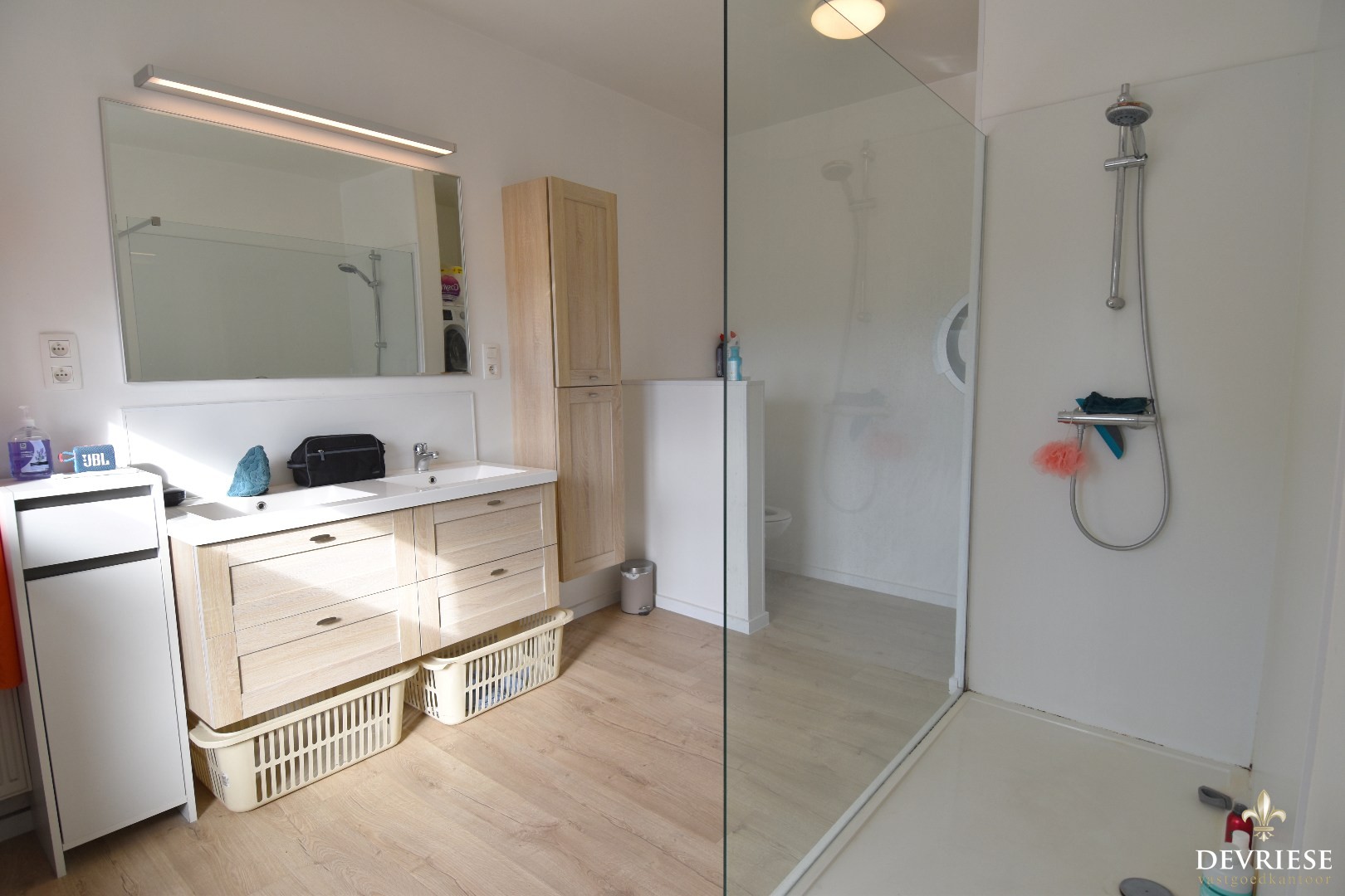 Op de eerste verdieping is er de eerste ruime slaapkamer met daarnaast de vernieuwde schitterende badkamer met dubbele lavabo, inloopdouche en een tweede toilet.
